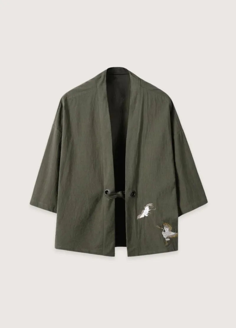 Chemise kimono en lin vert pour homme au style japonais Cette chemise style kimono homme lin vert incarne l’essence même du raffinement décontracté. Véritable pont entre l’héritage nippon et la modernité masculine, cette pièce transforme instantanément votre silhouette grâce à sa coupe ample et fluide qui épouse naturellement les mouvements du corps. Le lin noble qui compose ce vêtement japonais homme offre une sensation de fraîcheur incomparable, particulièrement appréciable lors des journées ensoleillées. Pourquoi choisir cette tunique orientale masculine ? Au-delà de son esthétique remarquable, ce cardigan masculin d’inspiration asiatique se distingue par ses broderies de grues en vol , symboles ancestraux de longévité dans la culture nippone. Les manches trois-quarts, caractéristiques