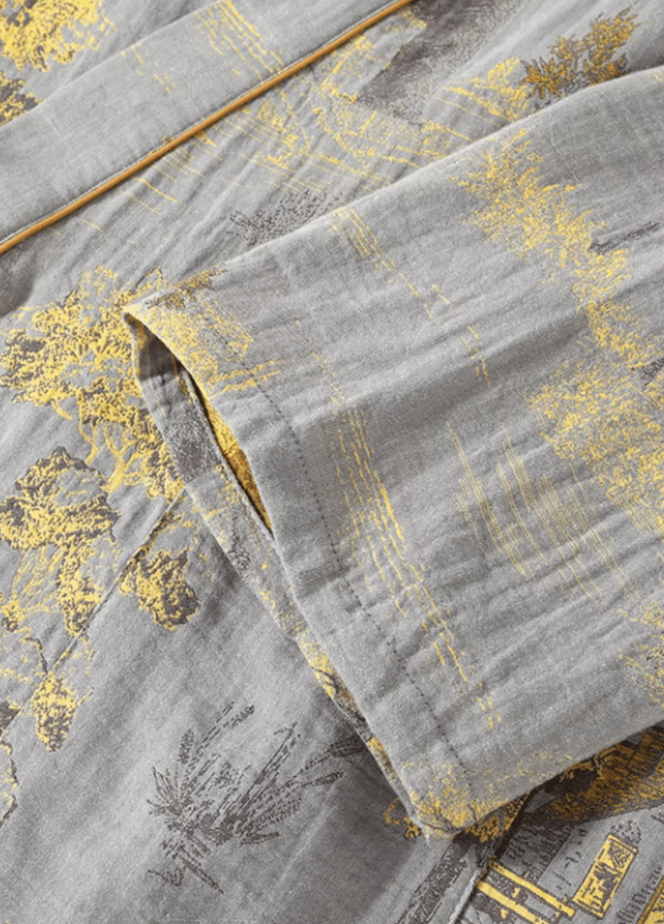 Ensemble pantalon pyjama kimono homme Cet élégant ensemble pantalon pyjama kimono pour homme allie la tradition japonaise au confort quotidien. Confectionné dans un tissu 100% coton doux et respirant. Cet ensemble présente un magnifique motif de paysage japonais automnal (sansui-ga) aux tons orangés et dorés sur fond gris, évoquant la beauté des érables momiji en automne. Le kimono à manches trois-quarts présente une coupe croisée traditionnelle avec col châle, fermeture par liens assortis et une poche latérale pratique. Le pantalon confortable à taille élastique complète parfaitement l’ensemble. Idéal pour les moments de détente à la maison, ce pyjama kimono offre style et confort au quotidien. Mensurations kimono: M: longueur 72cm, manche 36cm, poitrine 112cm L: longueur 75cm, manche 37c
