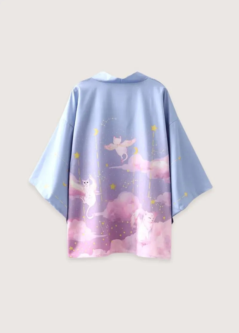 Kimono japonais bleu pour homme au style céleste Ce kimono bleu homme japonais vous transporte dans un univers onirique où l’élégance traditionnelle rencontre la fantaisie contemporaine. Confectionné dans un tissu soyeux d’une légèreté aérienne , ce vêtement d’exception arbore une teinte azur apaisante sublimée par des motifs enchanteurs de chats ailés évoluant dans un ciel étoilé. Les touches dorées des astres et les nuages roses créent une harmonie visuelle unique qui distingue cette pièce des créations ordinaires. Pourquoi choisir ce yukata masculin aux motifs célestes ? L’art du tissage nippon traditionnel se révèle dans chaque détail de ce vêtement aux manches amples caractéristiques. La coupe généreuse offre une liberté de mouvement incomparable, idéale pour vos moments de détente co