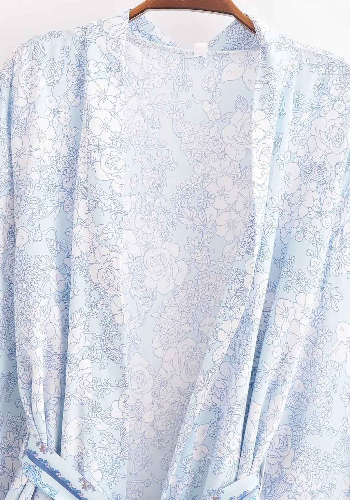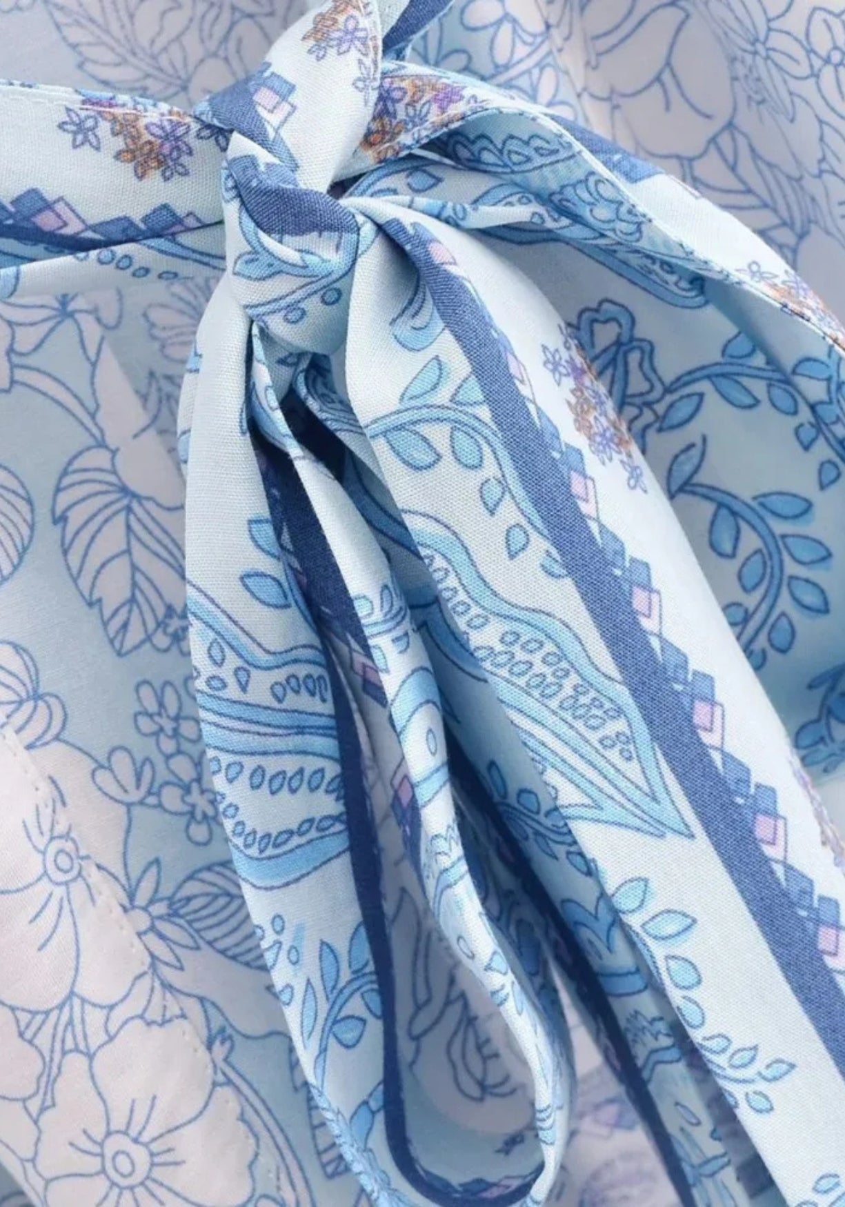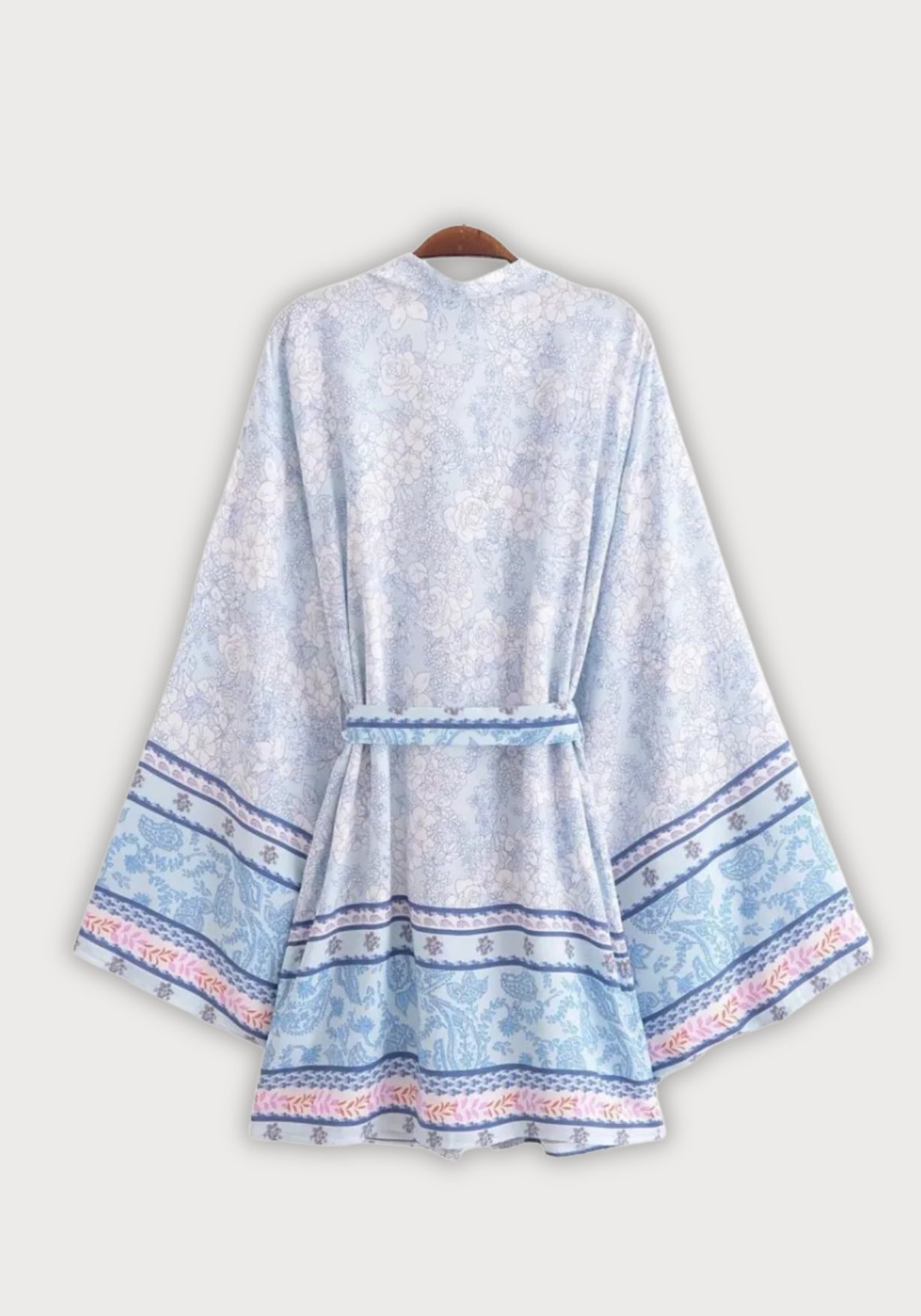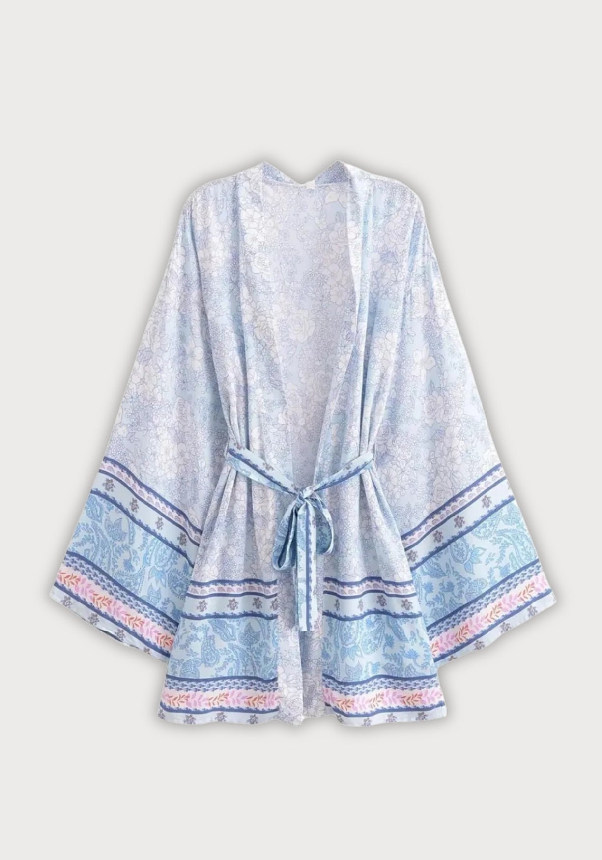 kimono bleu clair à motifs paisley et floraux Ce kimono court capture toute la douceur d’un matin d’été au bord de l’eau. Dans une palette de bleus clairs, de lavande pastel et de touches rosées, son motif paisley revisité évoque les étoffes ancienne