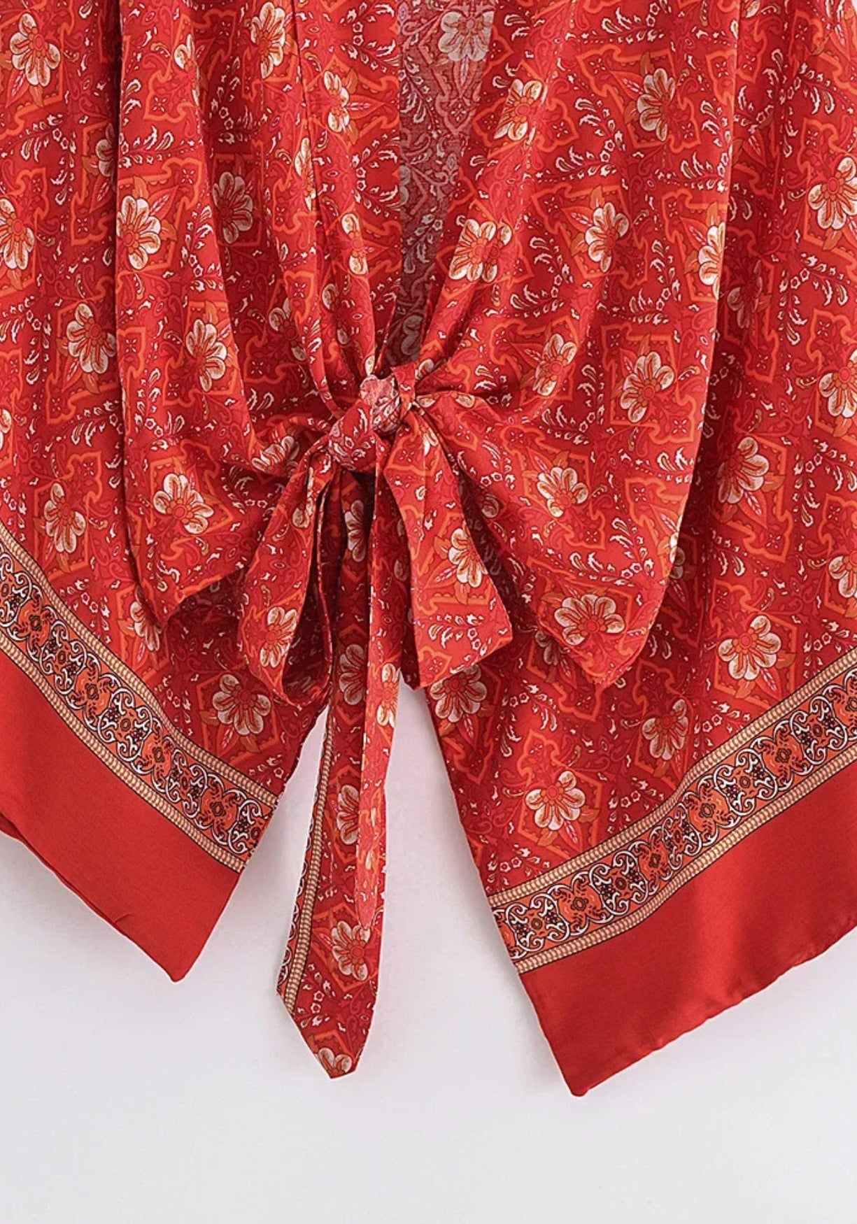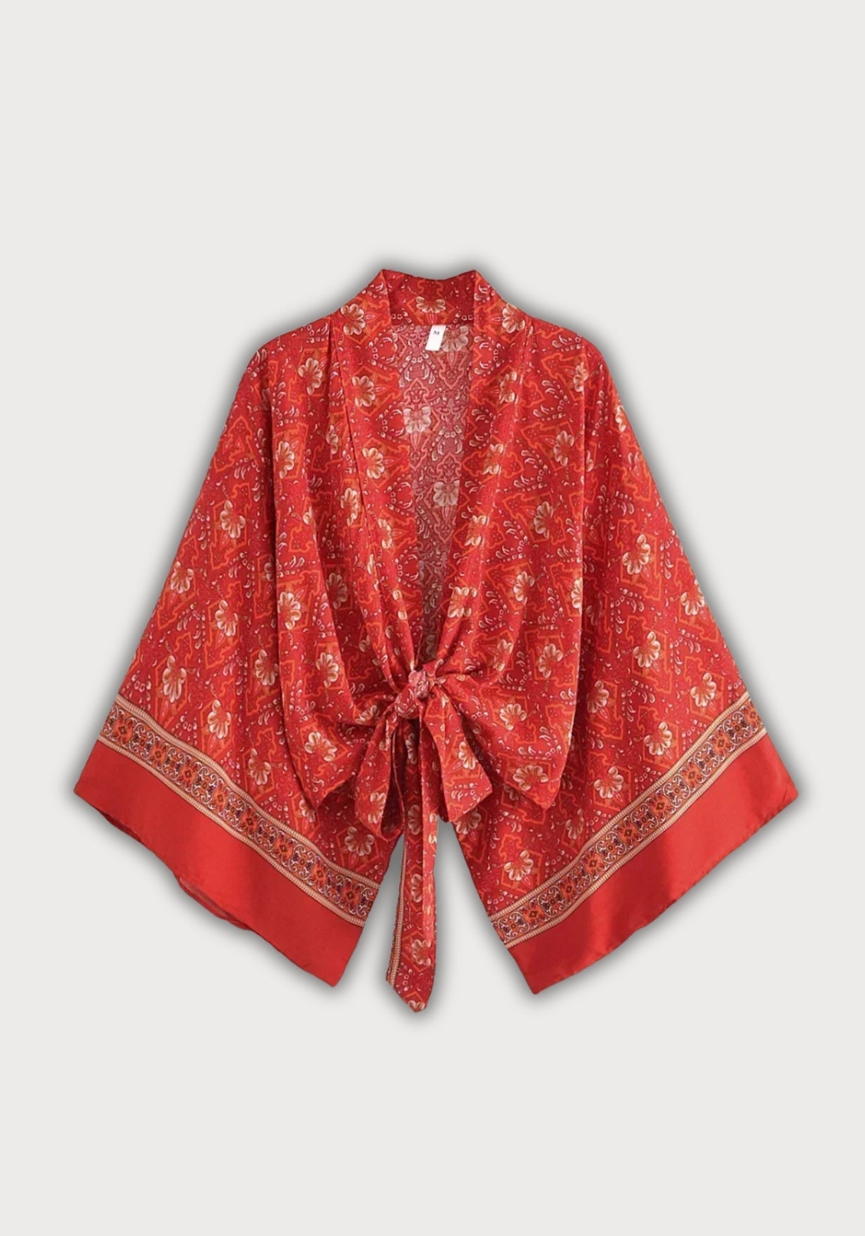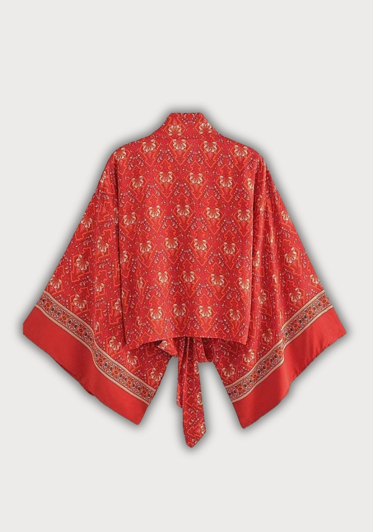 Kimono court cache-cœur rouge Ce kimono court pour femme incarne l’esprit libre et solaire du style bohème . Sa coupe fluide façon cache-cœur , à nouer sur le devant, sublime la silhouette tout en offrant un confort absolu. Confectionné en coton et r