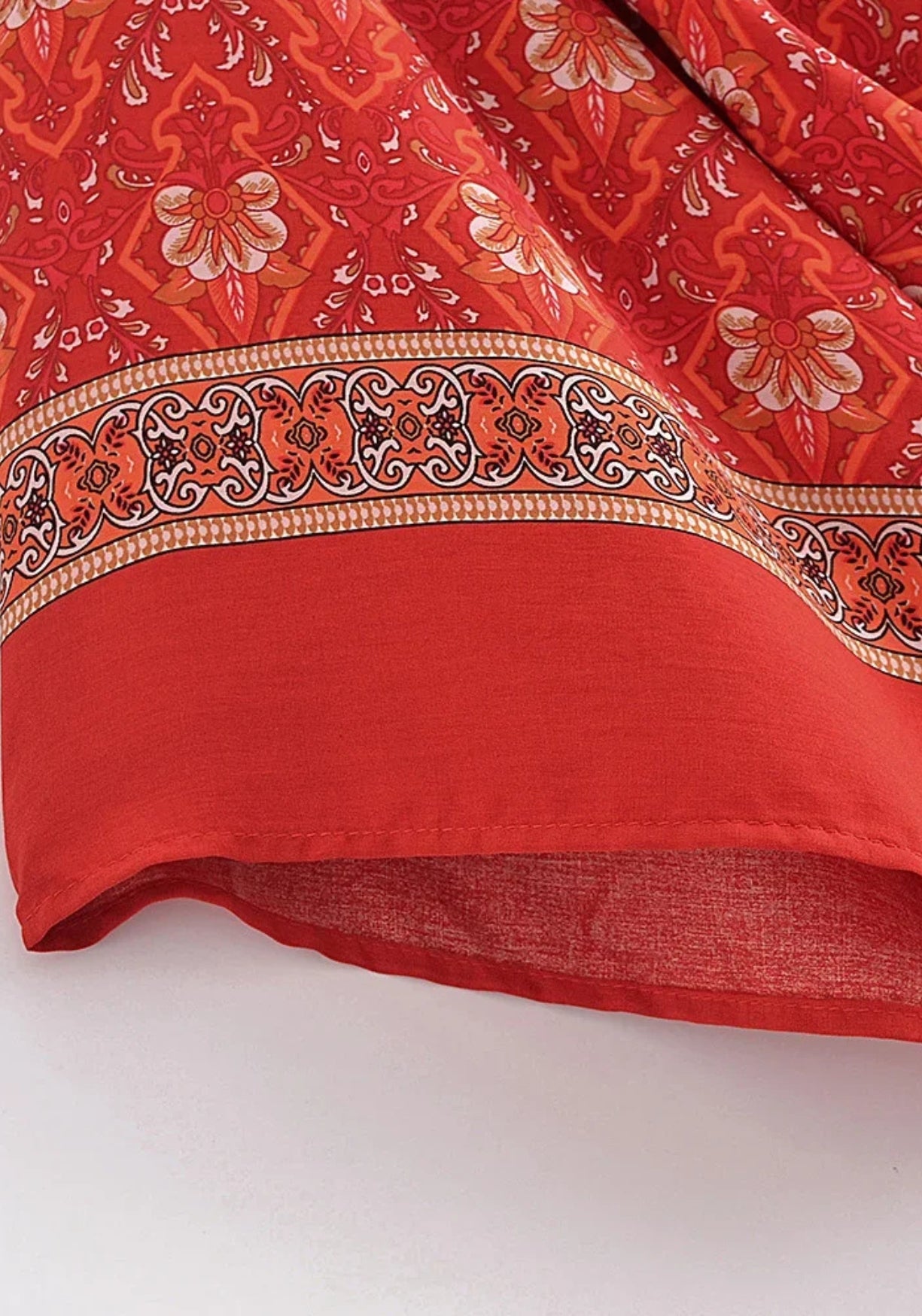 Kimono court cache-cœur rouge Ce kimono court pour femme incarne l’esprit libre et solaire du style bohème . Sa coupe fluide façon cache-cœur , à nouer sur le devant, sublime la silhouette tout en offrant un confort absolu. Confectionné en coton et rayonne, un mélange doux, léger et respirant, il épouse les mouvements du corps avec naturel – idéal pour les journées chaudes d’été ou les soirées douces. Son imprimé floral rouge intense , relevé de motifs traditionnels orientaux, apporte une touche vibrante et féminine . Les manches larges et le tombé ample accentuent l’élégance décontractée de la pièce, parfaite pour être portée sur un short, un maillot de bain ou une tenue plus habillée. Un indispensable polyvalent qui se glisse dans tous les dressings bohème et se porte aussi bien en vacances qu’en ville. Un souffle bohème pour illuminer vos looks d’été. Composition : Coton Rayonne