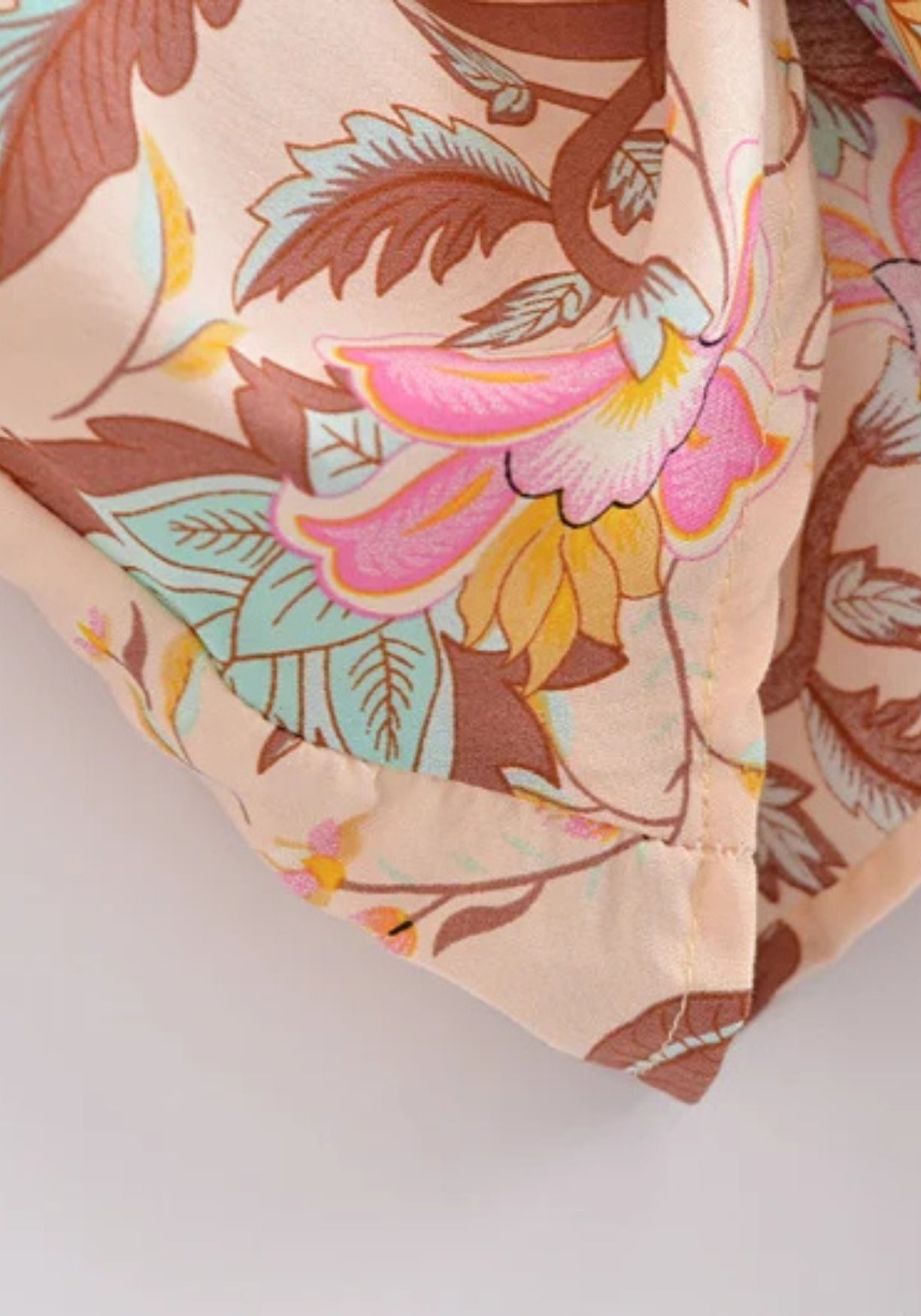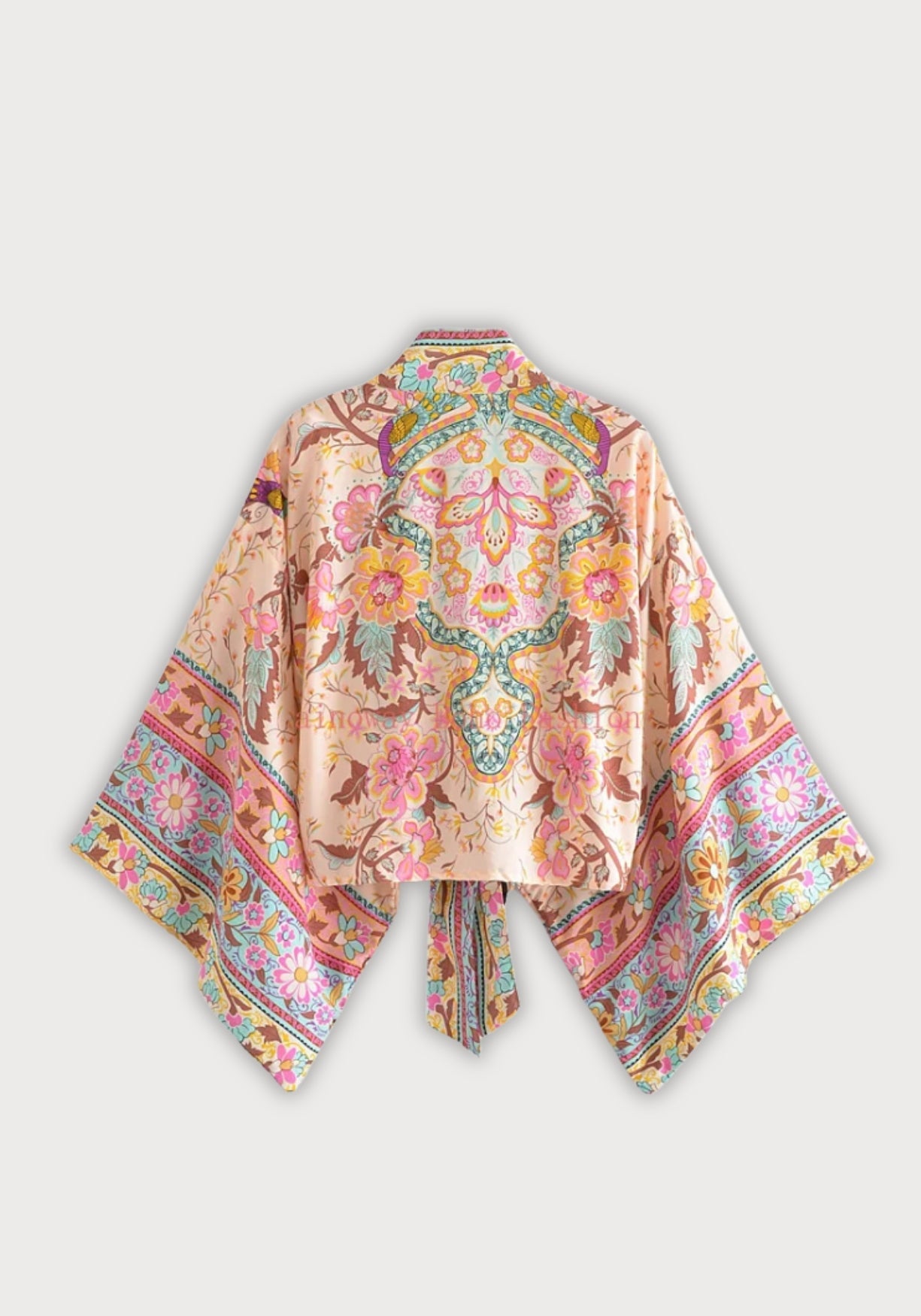 Kimono court cache-cœur à imprimé floral Ce kimono court cache-cœur est une ode à la douceur estivale et à la féminité bohème . Sa coupe ample et fluide épouse les mouvements du corps avec légèreté, tandis que sa ceinture à nouer souligne subtilement la taille pour une silhouette naturellement élégante. Confectionné dans un tissu doux mêlant coton et rayonne, il offre un confort aérien, idéal pour les journées ensoleillées comme pour les soirées plus fraîches. L’imprimé floral délicatement rétro , composé de fleurs stylisées et de feuillages orientaux, mêle des nuances poudrées de rose, jaune safran, turquoise pâle et brun terre sur un fond crème rosée. Chaque détail est travaillé avec soin, des manches larges à la finition impeccable des bordures, apportant une touche artisanale et raffinée à la pièce. Ce kimono peut se porter ouvert sur un top blanc ou noué pour habiller une robe simple : il sublime les tenues du quotidien avec une touche de lumière et d’élégance bohème. Un souffle de poésie à nouer autour de soi. Composition : Coton Rayonne