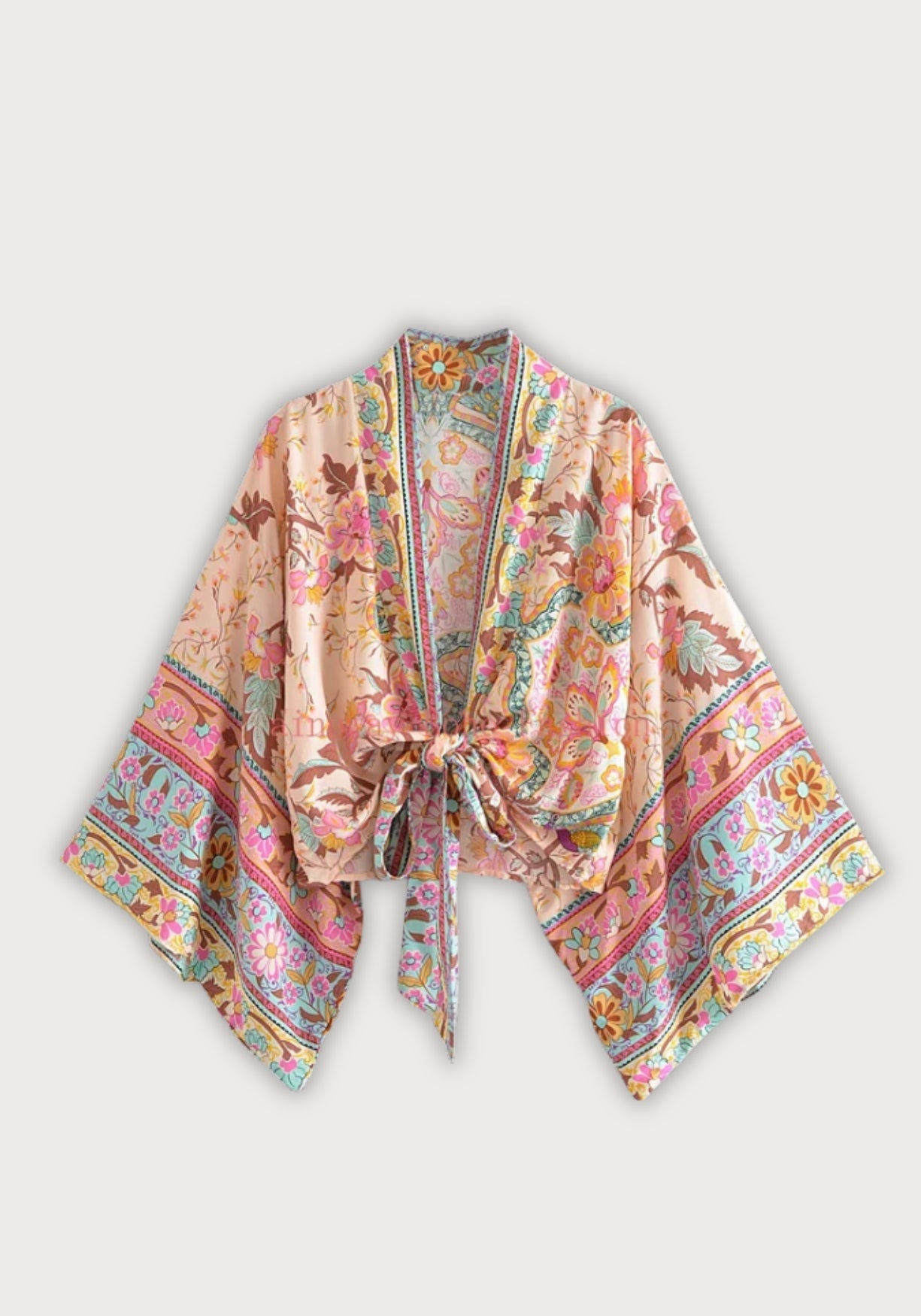 Kimono court cache-cœur à imprimé floral Ce kimono court cache-cœur est une ode à la douceur estivale et à la féminité bohème . Sa coupe ample et fluide épouse les mouvements du corps avec légèreté, tandis que sa ceinture à nouer souligne subtilement