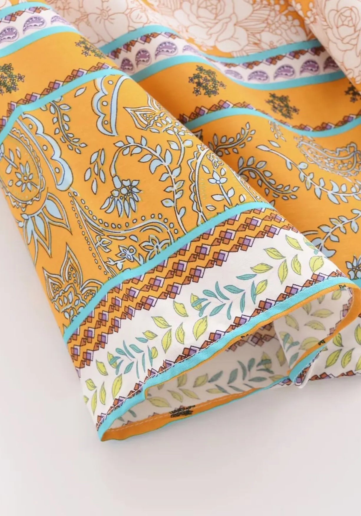 Kimono court à dominante ocre Ce kimono court se distingue par ses teintes ocre lumineuses et son motif floral tout en finesse. Les contours de fleurs blanches semblent esquissés à la main, comme sur une toile oubliée au soleil. Des détails bleu turq