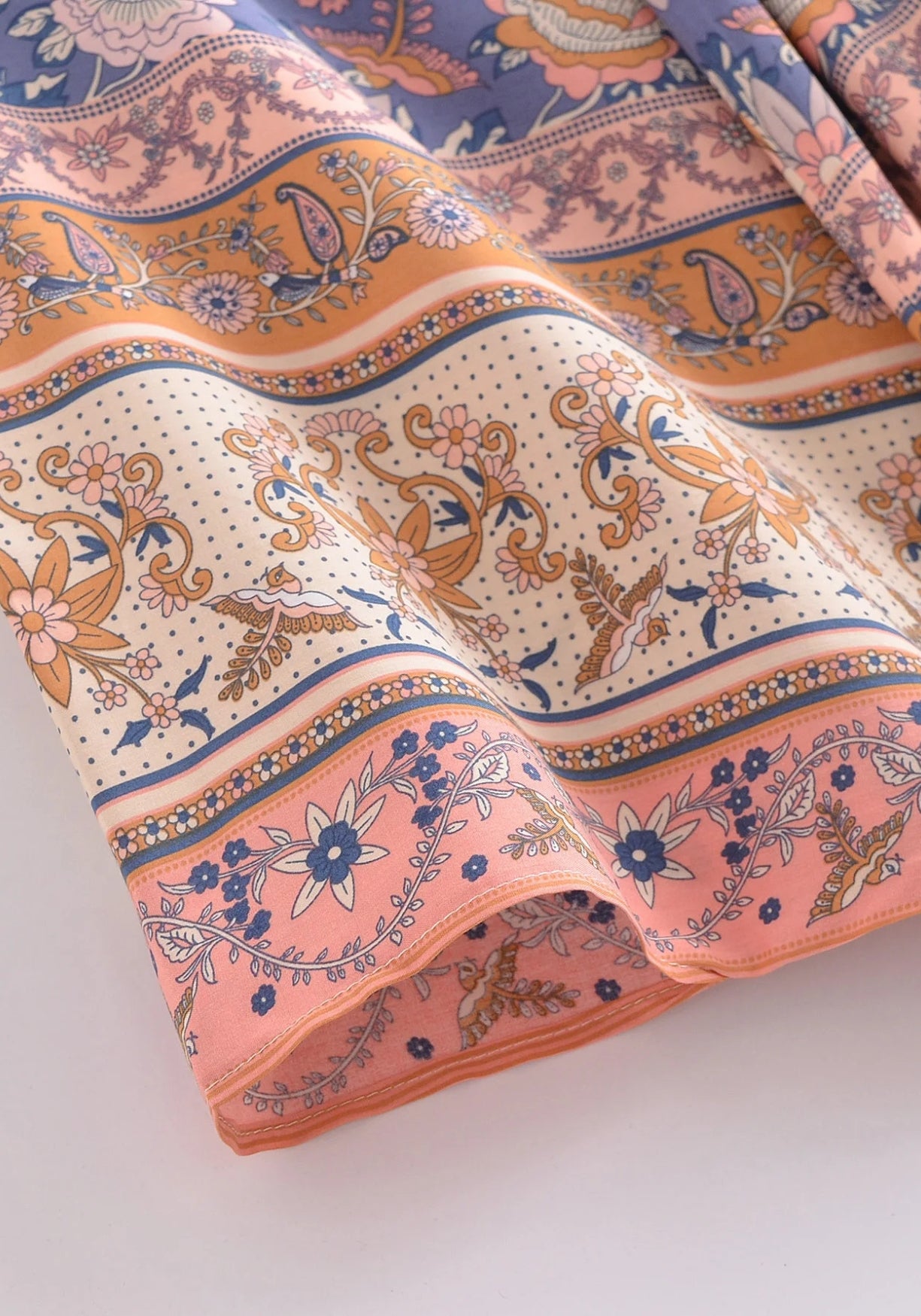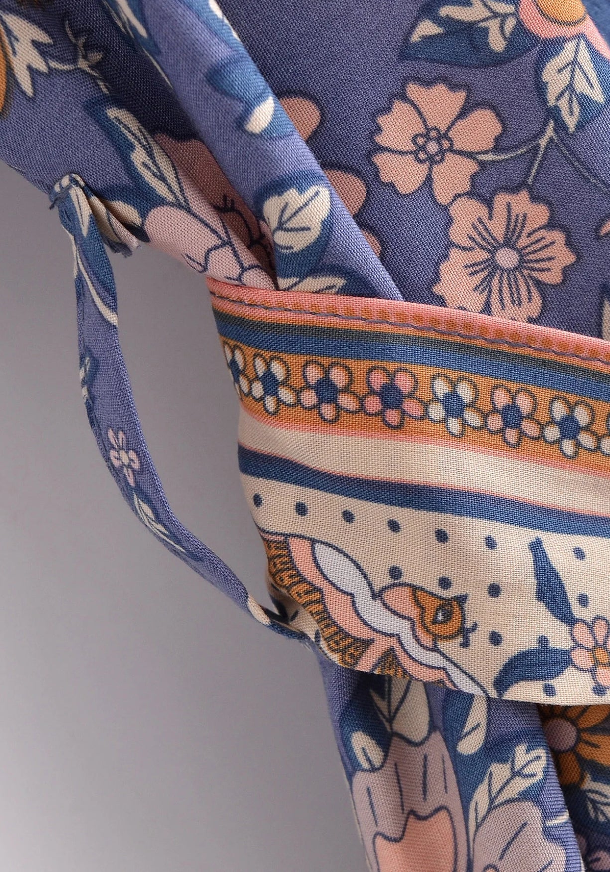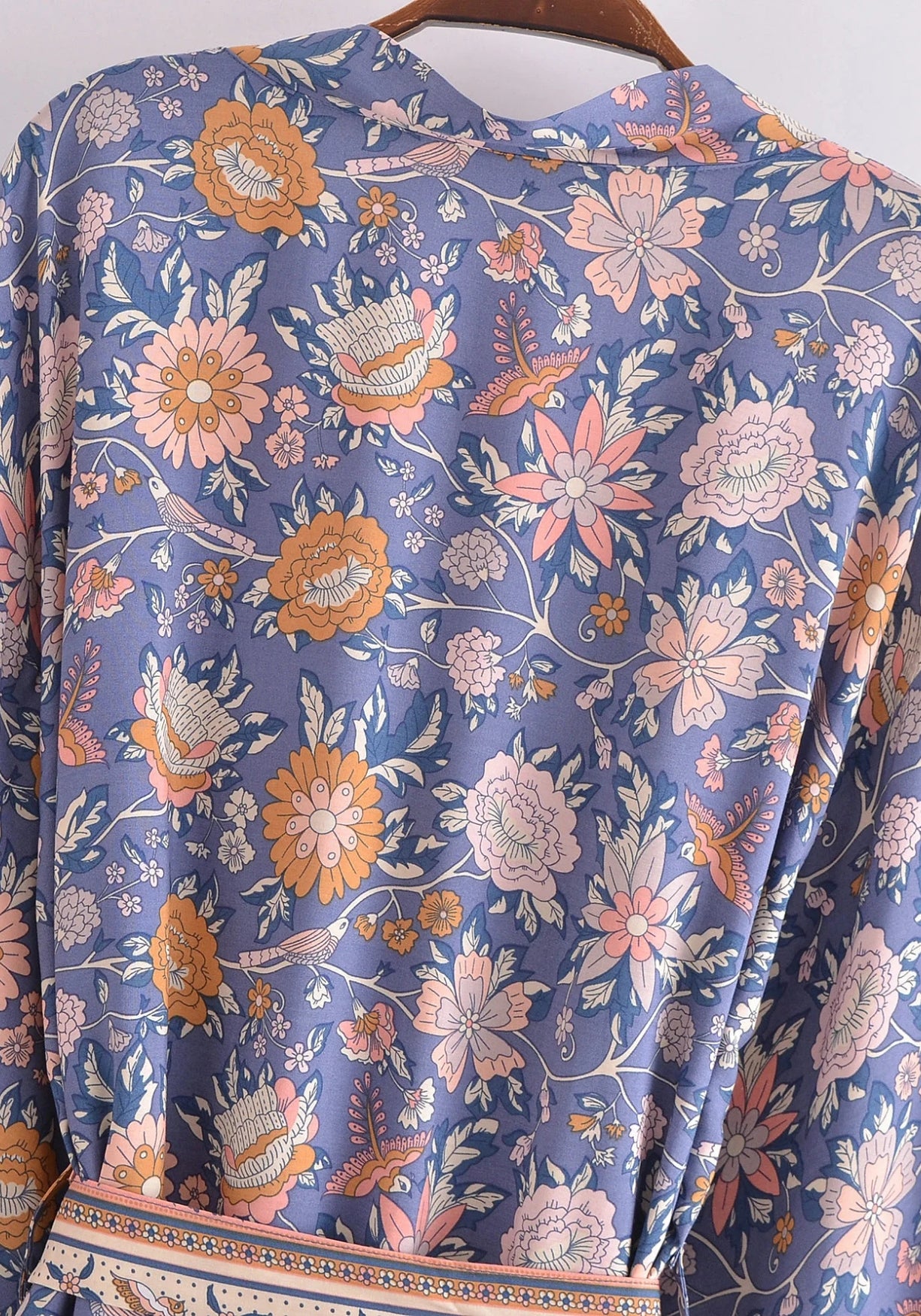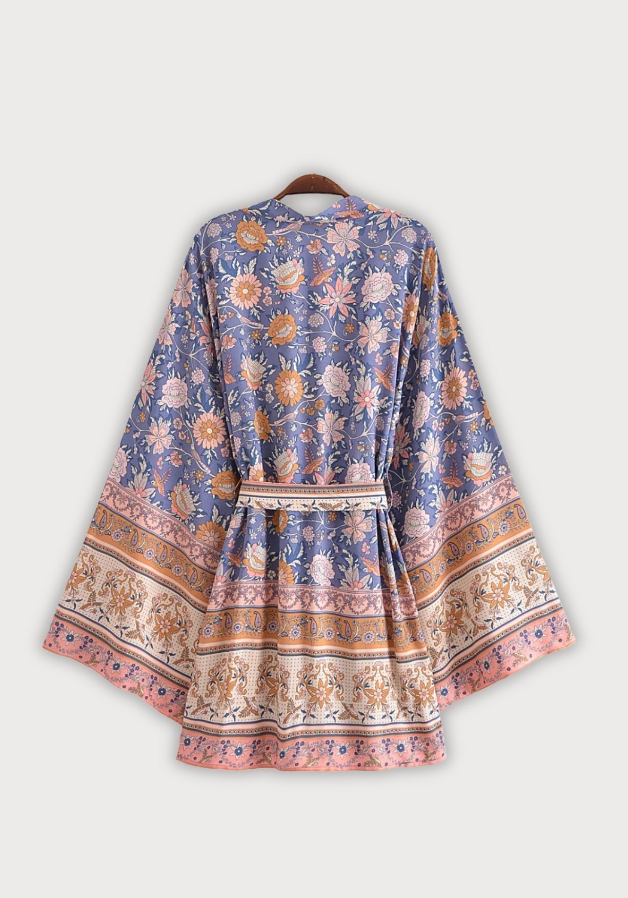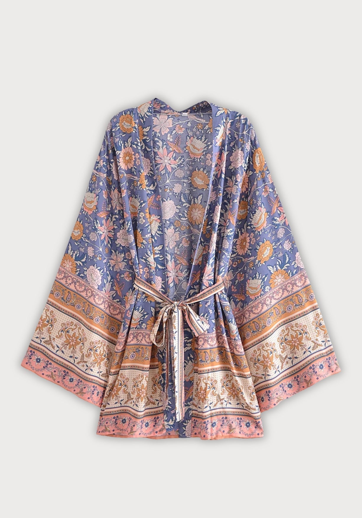 Kimono court fleuri bleu lavande Plongez dans un doux mélange de teintes lavande, crème et corail, subtilement réchauffées par des détails orangés. Ce kimono court dévoile un motif floral délicat, peuplé d’oiseaux, de feuillages stylisés et de pois d