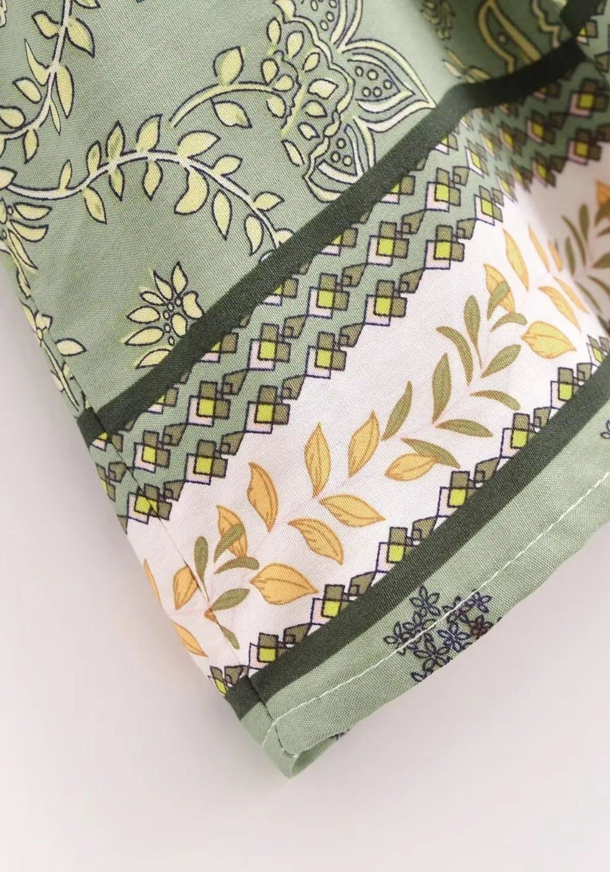 Kimono court vert sauge à motifs floraux Ce kimono court en vert sauge évoque un calme végétal, comme une promenade silencieuse entre les feuillages d’un jardin oublié. Son tissu léger, parsemé de fleurs dessinées comme au trait, mêle délicatesse et simplicité. On y retrouve des nuances douces de crème, de vert tendre et de jaune pâle, soulignées de fines bordures graphiques qui rappellent les imprimés textiles anciens. Il se pose sur les épaules sans insister, et bouge avec vous, sans contrainte. Sa ceinture ton sur ton permet de varier les façons de le porter — librement ouvert sur une robe d’été , ou noué pour en faire une pièce à part entière. Ce kimono n’attire pas le regard : il l’accompagne, comme une évidence. Un souffle végétal à porter, entre fraîcheur et douceur, comme un matin d’été en silence. Composition : 100% viscose.