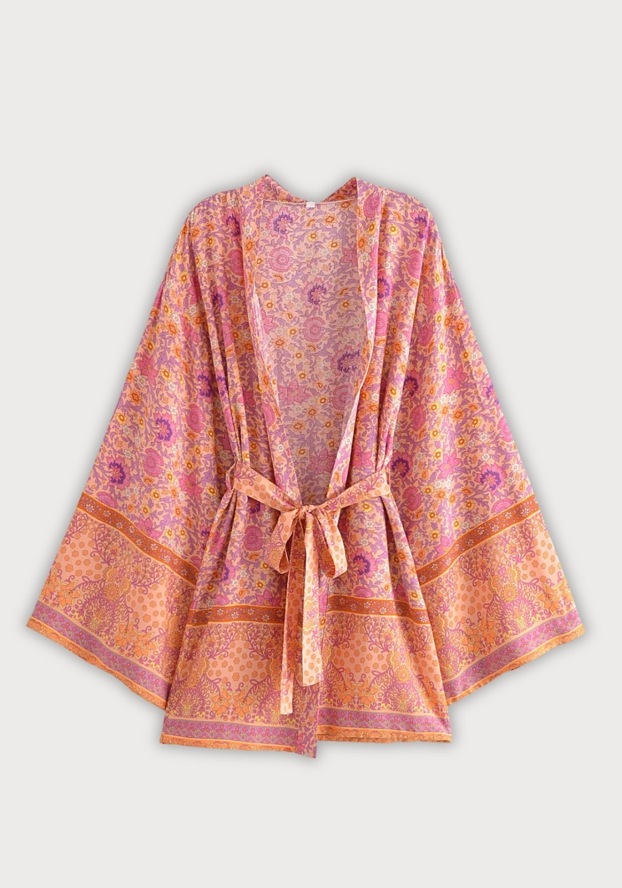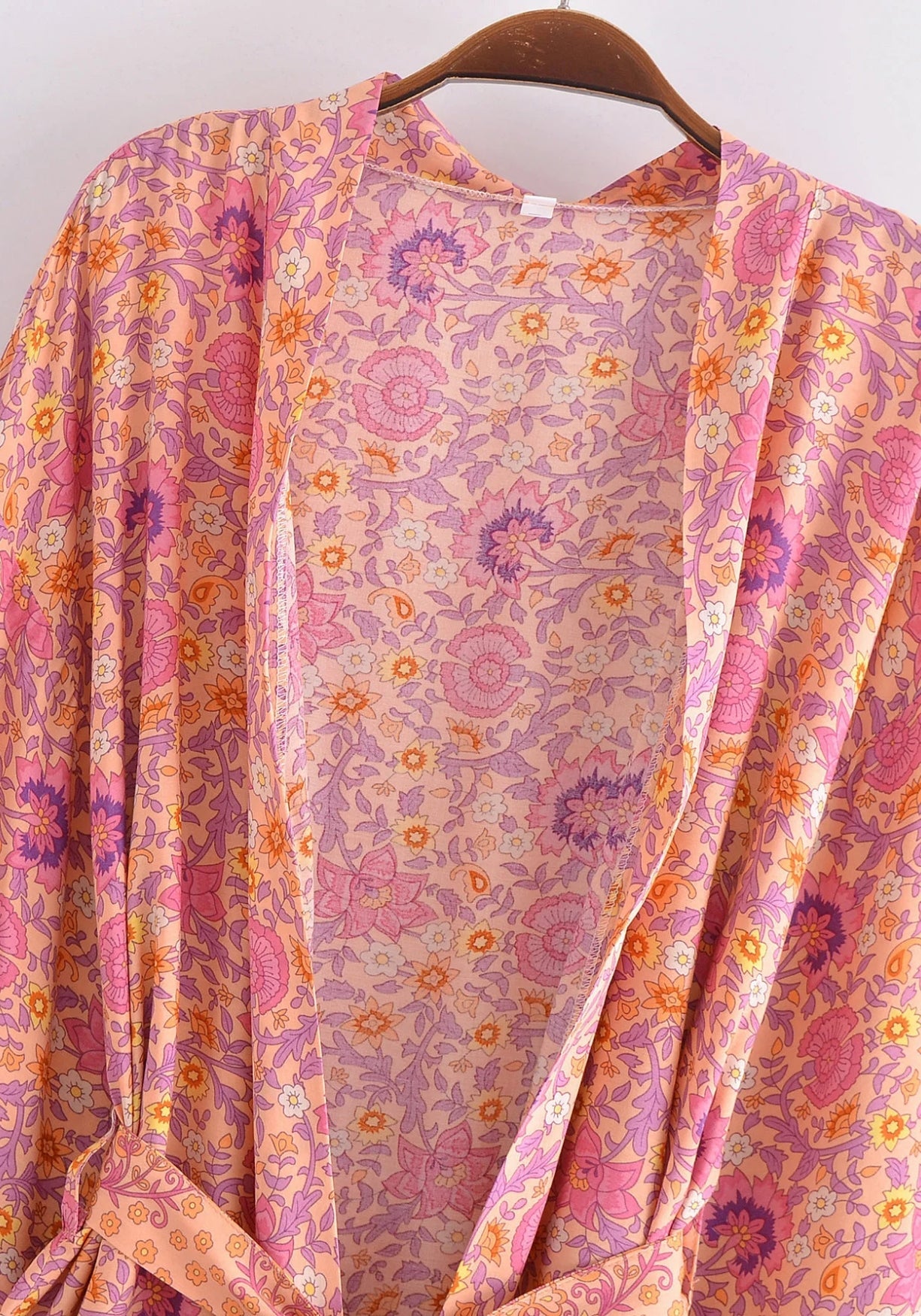 Kimono court pêche rosée fleuri Il y a des pièces qu’on enfile et qui changent instantanément l’atmosphère — ce kimono en fait partie. Son imprimé floral , doux comme une aquarelle, mêle des tons de pêche rosée , d’orange léger et de lavande fanée, c
