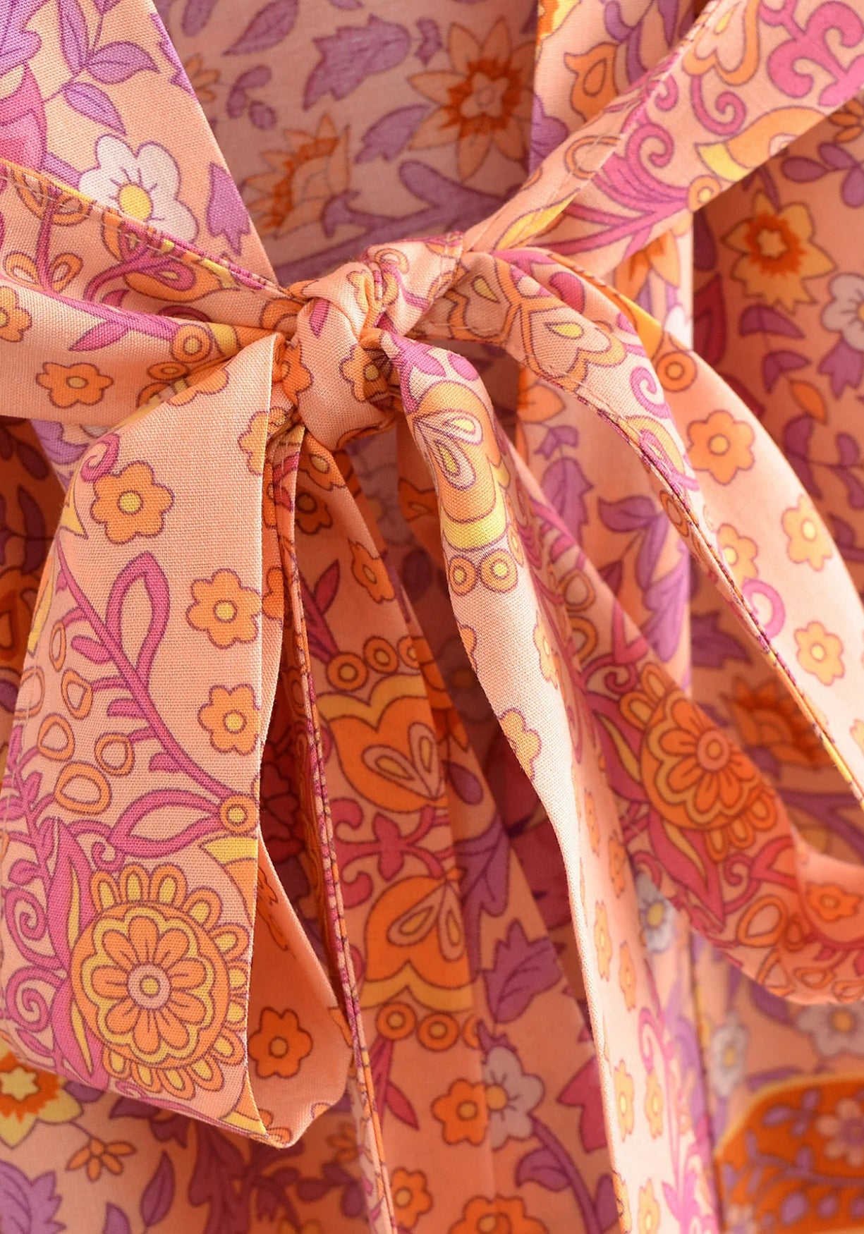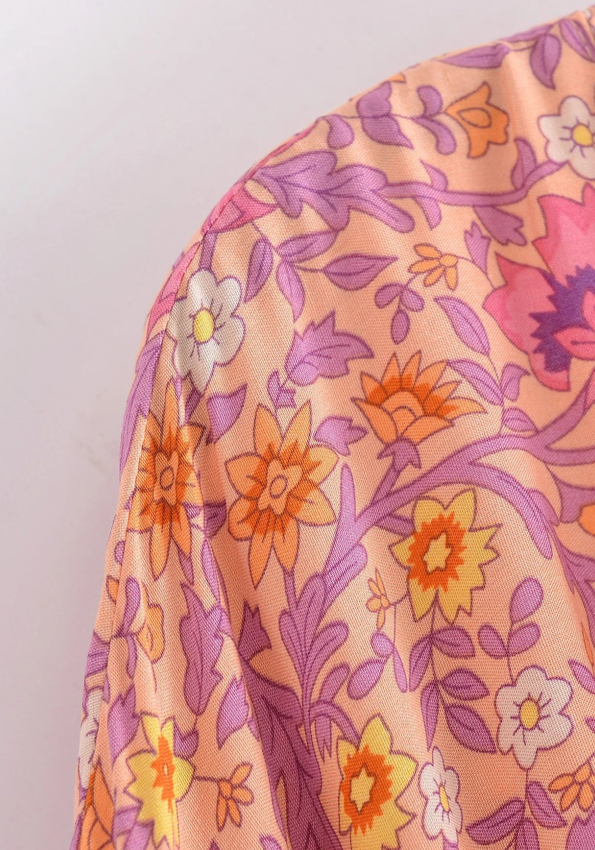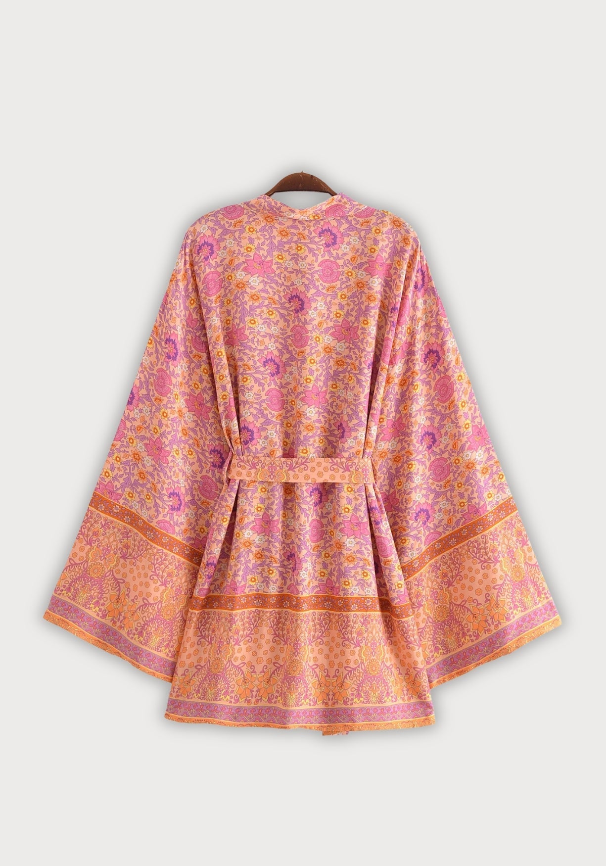 Kimono court pêche rosée fleuri Il y a des pièces qu’on enfile et qui changent instantanément l’atmosphère — ce kimono en fait partie. Son imprimé floral , doux comme une aquarelle, mêle des tons de pêche rosée , d’orange léger et de lavande fanée, comme si on capturait les dernières lueurs d’un après-midi d’été. Chaque fleur semble avoir sa propre histoire, dessinée avec tendresse dans un esprit vintage et solaire. Sa coupe ample flotte autour du corps avec cette aisance qu’on recherche les jours où l’on veut simplement se sentir bien. Le tissu est léger, agréable au toucher, presque imperceptible sur la peau. Les manches larges tombent naturellement, et la ceinture à nouer offre la liberté d’ajuster la silhouette à sa façon — lâche ou plus structurée, selon l’envie du moment. Que ce soit pour flâner chez soi, s’évader en vacances ou ajouter une touche bohème à un look simple, ce kimono court accompagne tout en douceur. Une robe bohème et lumineuse, pensée pour les esprits qui aiment conjuguer confort, beauté et spontanéité. Un souffle bohème et solaire, pour celles qui aiment vivre en douceur et en couleur. Composition : 100% viscose.