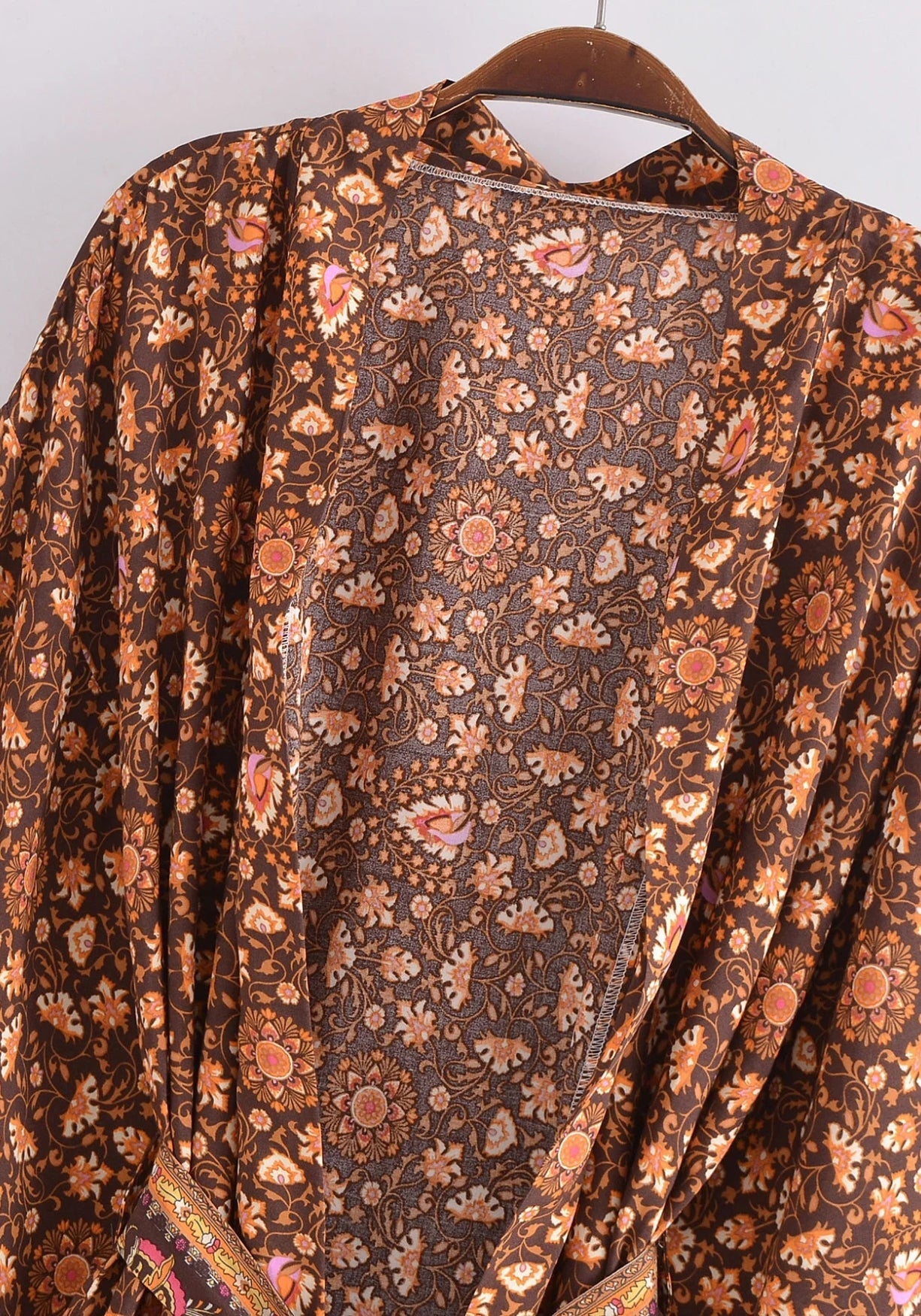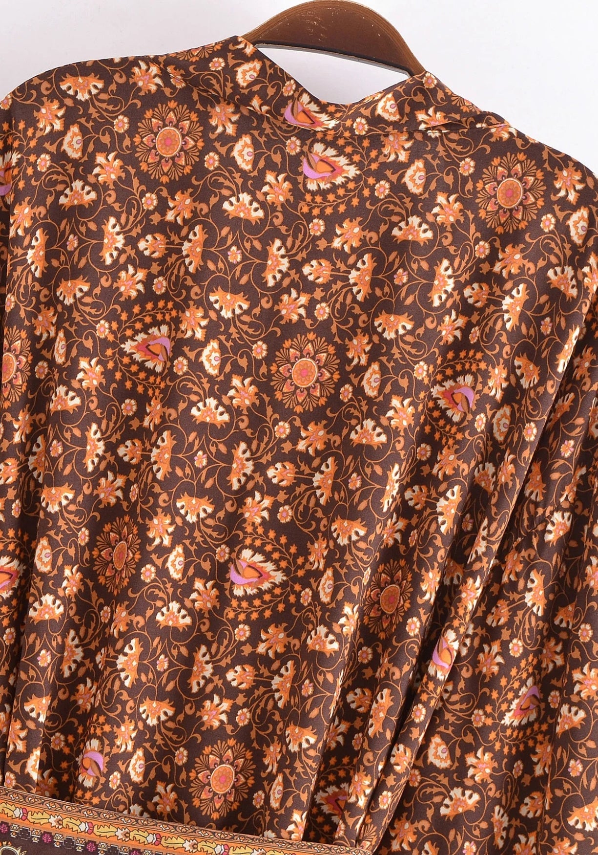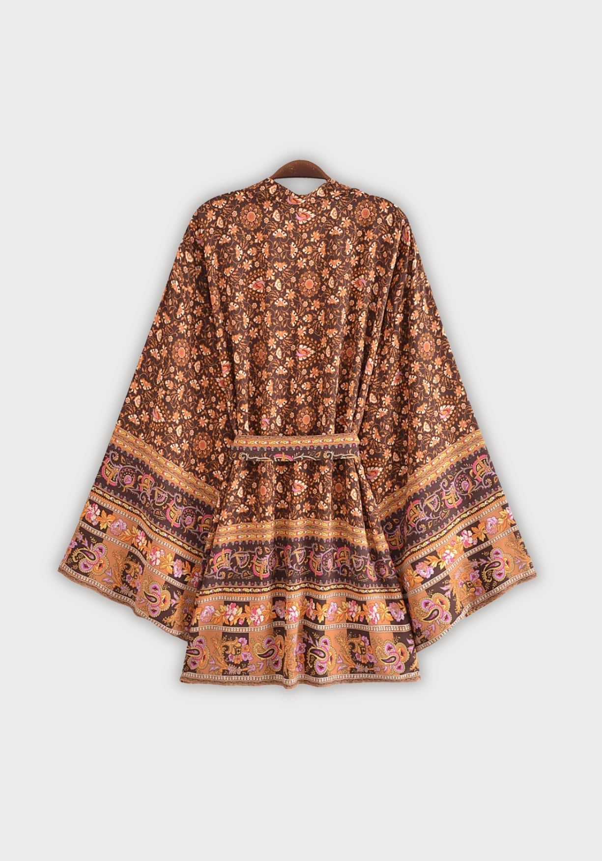 Kimono court à motif oriental brun Offrez-vous une escapade bohème avec ce kimono court au charme oriental, sublimé par un riche camaïeu de bruns, d’orangés et de touches violettes. Son imprimé floral et baroque mêle des motifs traditionnels à des in