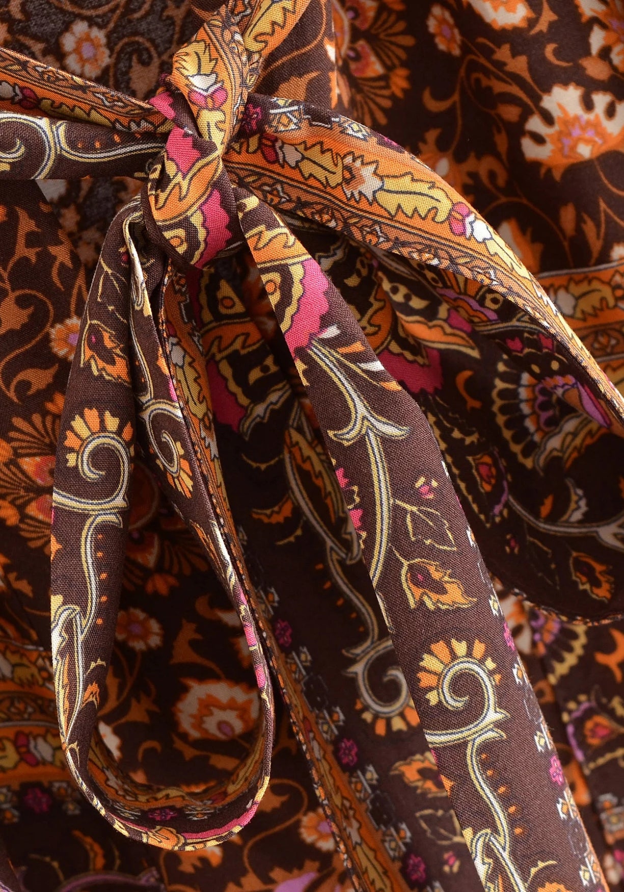 Kimono court à motif oriental brun Offrez-vous une escapade bohème avec ce kimono court au charme oriental, sublimé par un riche camaïeu de bruns, d’orangés et de touches violettes. Son imprimé floral et baroque mêle des motifs traditionnels à des inspirations orientales pour une allure à la fois vintage et solaire. Le tissu fluide et doux épouse naturellement les mouvements, offrant un tombé léger et aérien. La coupe courte se noue à la taille à l’aide de liens fins assortis, soulignant délicatement la silhouette tout en gardant un esprit décontracté. Les manches amples, style kimono , renforcent la liberté de mouvement et apportent une dimension théâtrale à l’ensemble. Les bordures inférieures sont rehaussées de bandes décoratives richement imprimées, encadrant la pièce comme une œuvre d’art textile. Ce kimono se porte aussi bien ouvert sur un haut simple que fermé façon blouse légère. Un kimono qui fait voyager — entre palais persans et marchés bohèmes. Composition : 100% viscose.