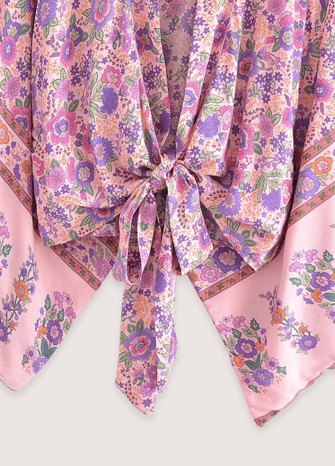 Kimono court fleuri bohème pour femme Découvrez notre kimono court, une pièce unique pour votre garde-robe. Ce vêtement, conçu pour les femmes, allie élégance et tradition japonaise . Cet habit rosé illustre un motif floral avec pivoines, marguerite