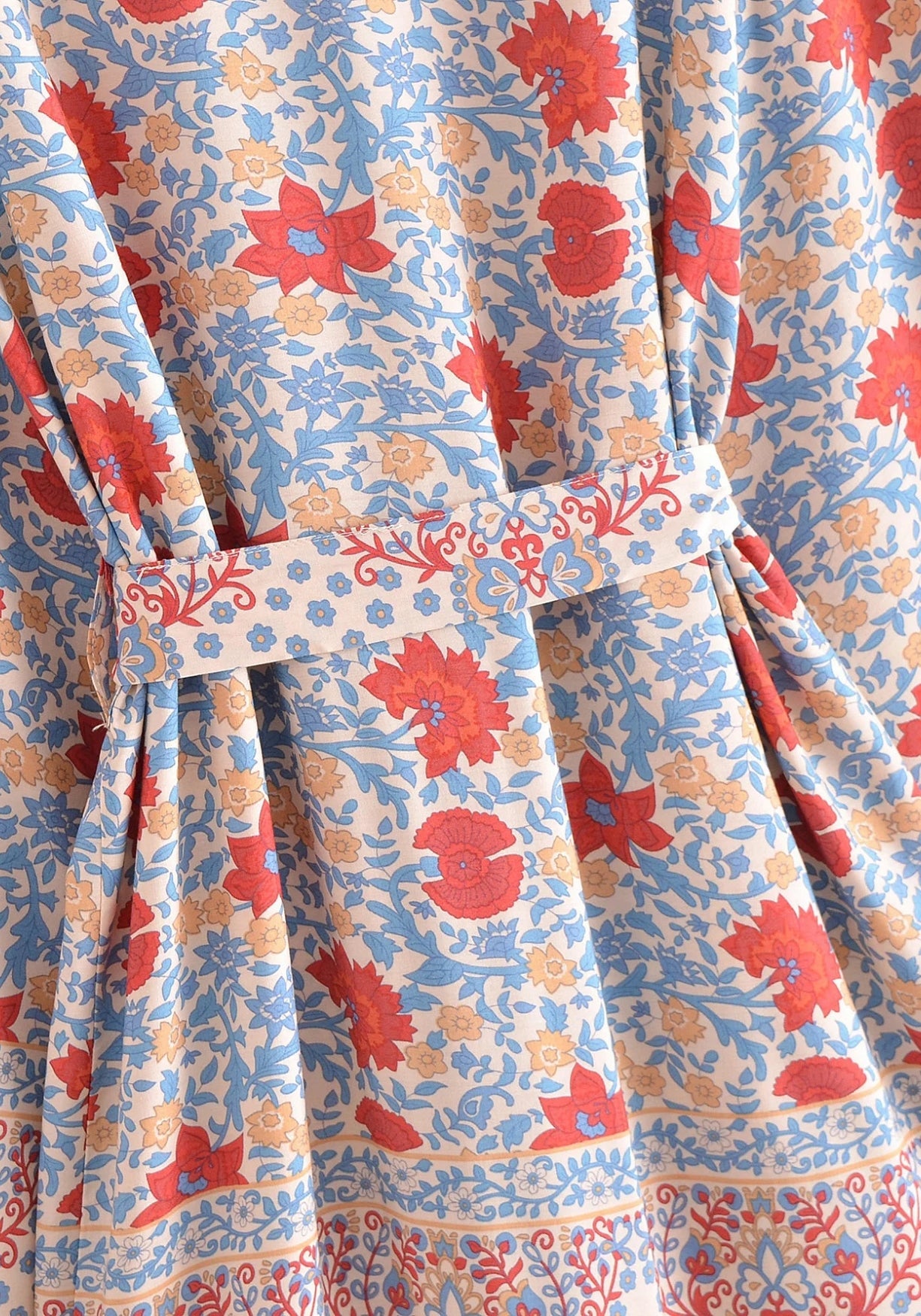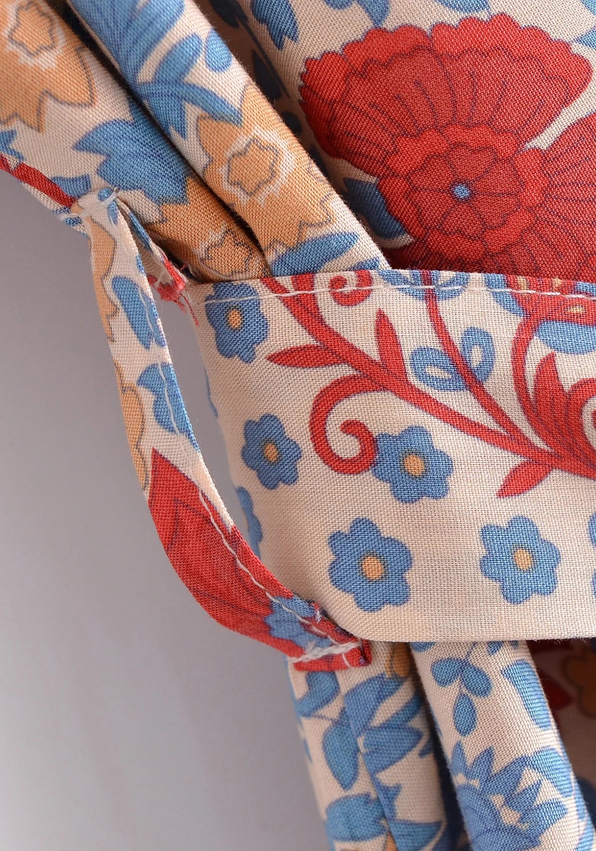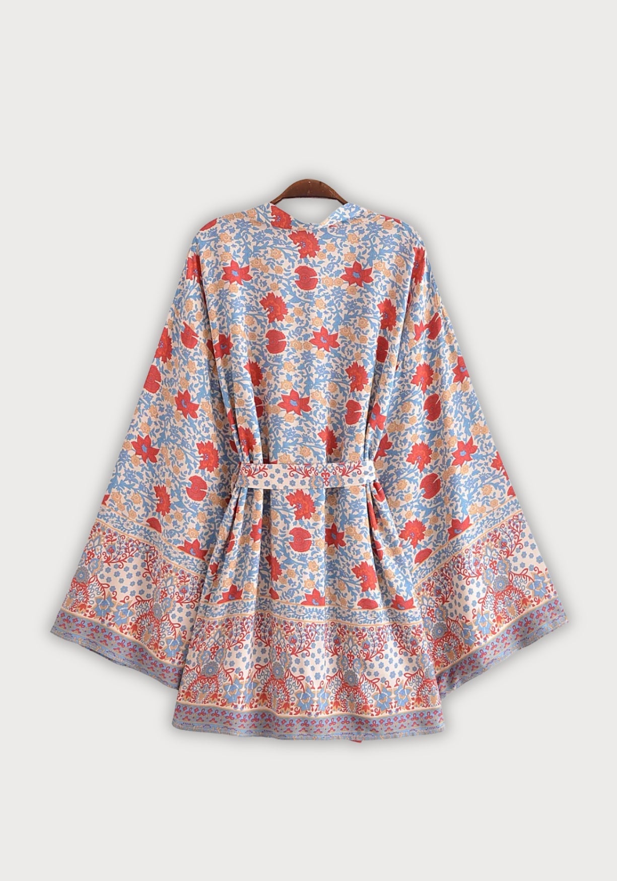 Kimono court fleuri bleu et rouge Éveillez vos sens avec ce kimono court aux teintes vives et contrastées, où les fleurs rouge coquelicot , bleu ciel et jaune doux s’épanouissent sur un fond écru délicat. L’ensemble évoque un paysage oriental stylisé