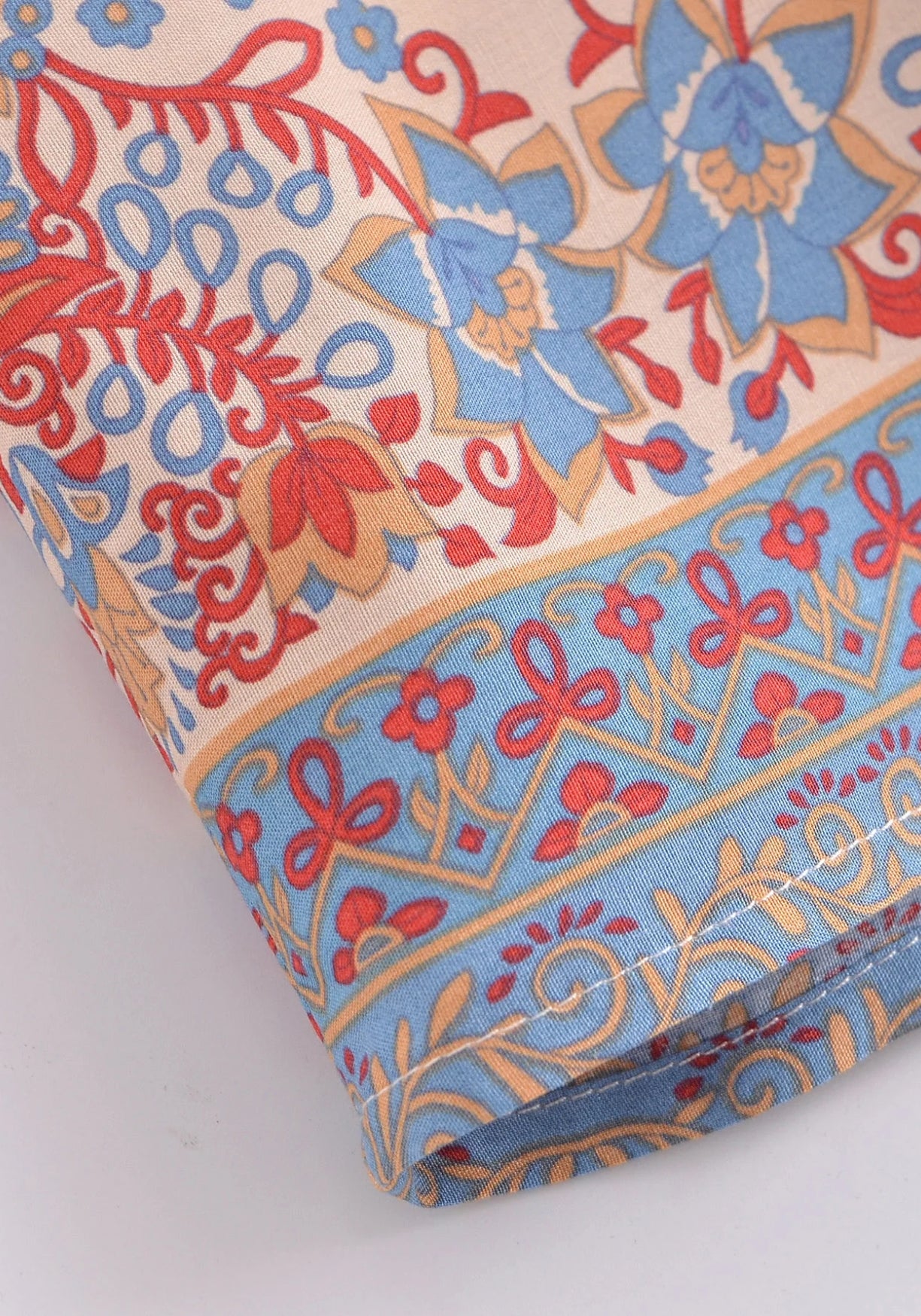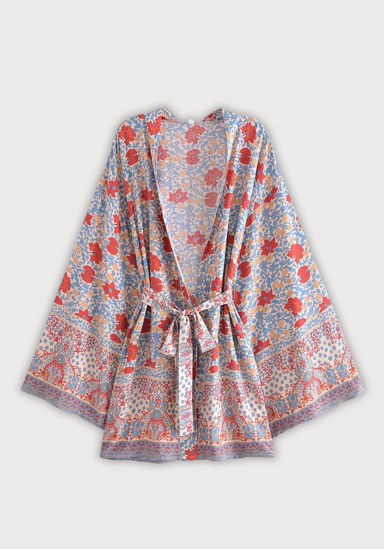 Kimono court fleuri bleu et rouge Éveillez vos sens avec ce kimono court aux teintes vives et contrastées, où les fleurs rouge coquelicot , bleu ciel et jaune doux s’épanouissent sur un fond écru délicat. L’ensemble évoque un paysage oriental stylisé, chaleureux et poétique, entre héritage floral vintage et fraîcheur estivale. Les bordures finement dessinées ajoutent une dimension artisanale qui souligne l’âme bohème du modèle. Conçu dans une viscose légère , il enveloppe le corps avec douceur et souplesse. Sa coupe ample s’adapte à toutes les silhouettes avec aisance, tandis que la ceinture ajustable permet de structurer la taille ou de le porter ouvert pour un effet plus décontracté. Les manches larges d’inspiration japonaise accentuent son allure élégante et fluide, parfaite pour les journées au soleil, les vacances ou les moments de bien-être chez soi. Une pièce solaire qui mêle énergie, féminité et liberté dans un esprit bohème chic. Composition : 100% viscose.