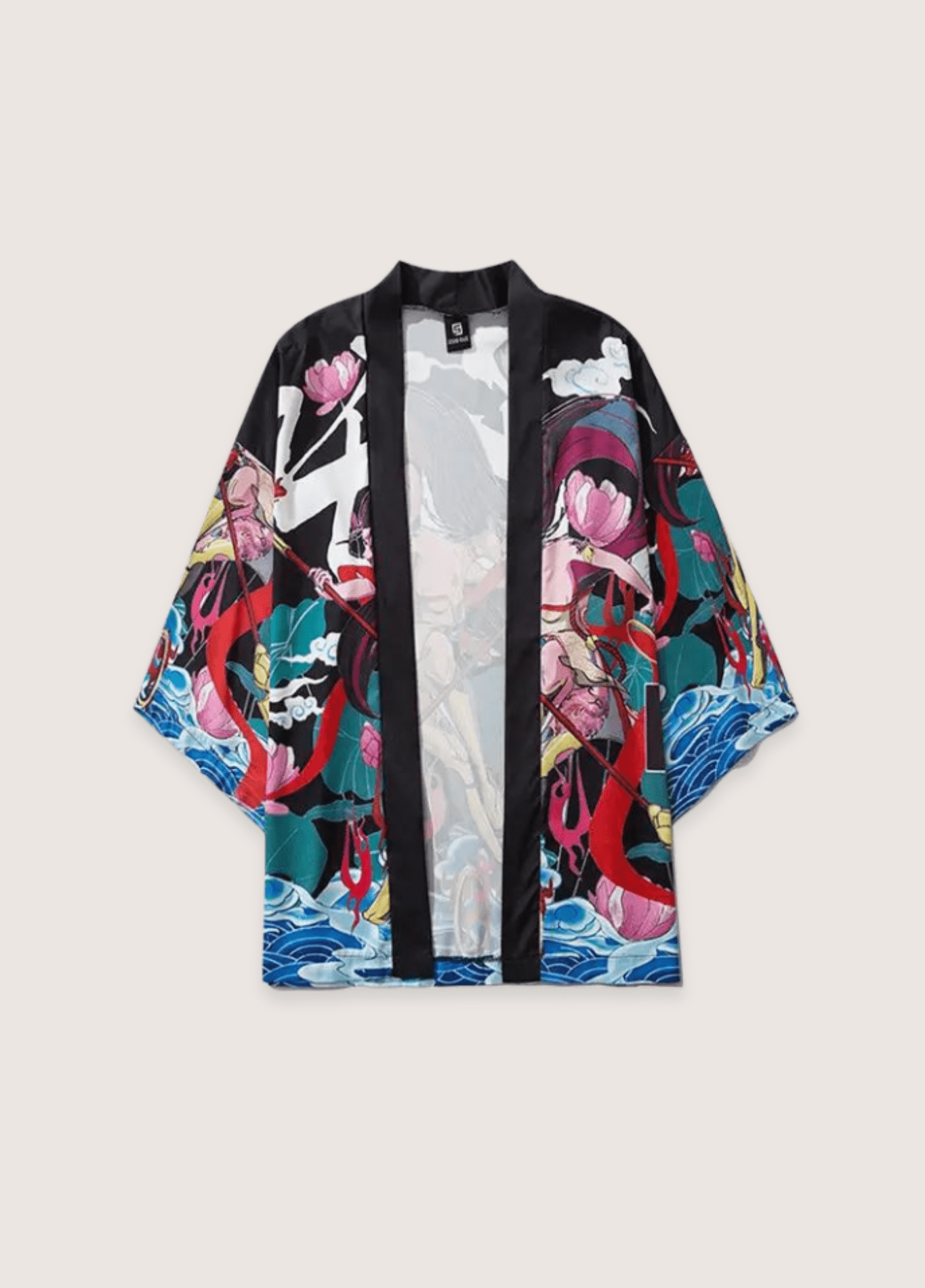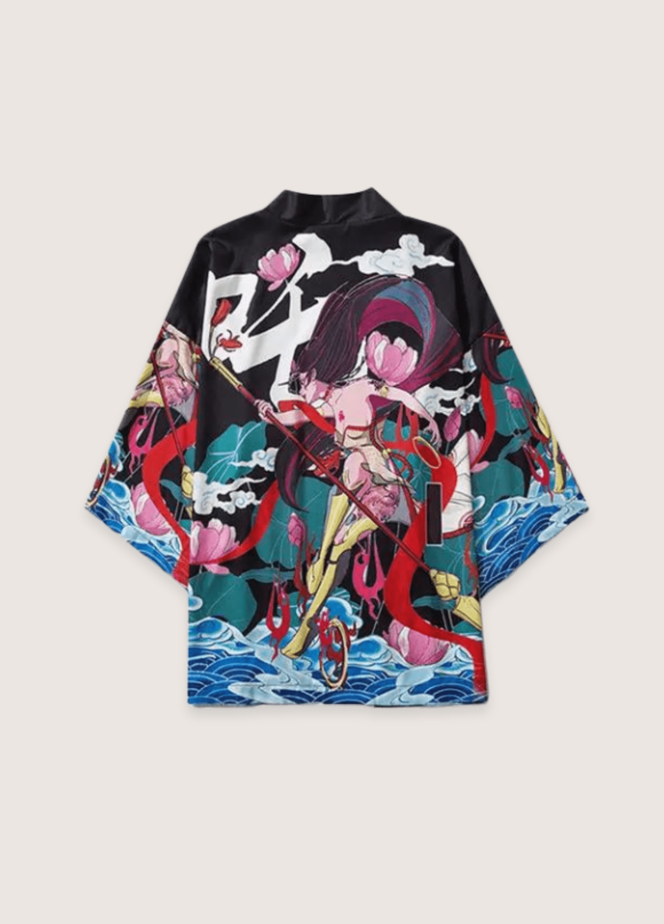 Kimono japonais pour homme et femme Découvrez notre kimono japonais Femme Samurai , une pièce unique pour votre garde-robe. Ce vêtement , conçu pour les hommes et les femmes, allie élégance et tradition japonaise . Ce kimono illustre au dos, l’univers des samurai . Le motif central est une femme guerrière , armée d’un long bâton, entourée de fleurs de lotus et de vagues bleues. Le tissu de cette tenue présente un fond noir. Les couleurs rouge , vert , rose et bleu ajoutent une touche d’originalité. Les manches trois-quarts amples donnent une allure décontractée à cette pièce unique . Le kimono s’ouvre sur le devant. Unisexe, ce kimono court s’adapte aussi bien aux hommes qu’aux femmes. Une tenue décontractées et intemporelle. Plus qu’un simple habit , c’est un accessoire de mode polyvalent