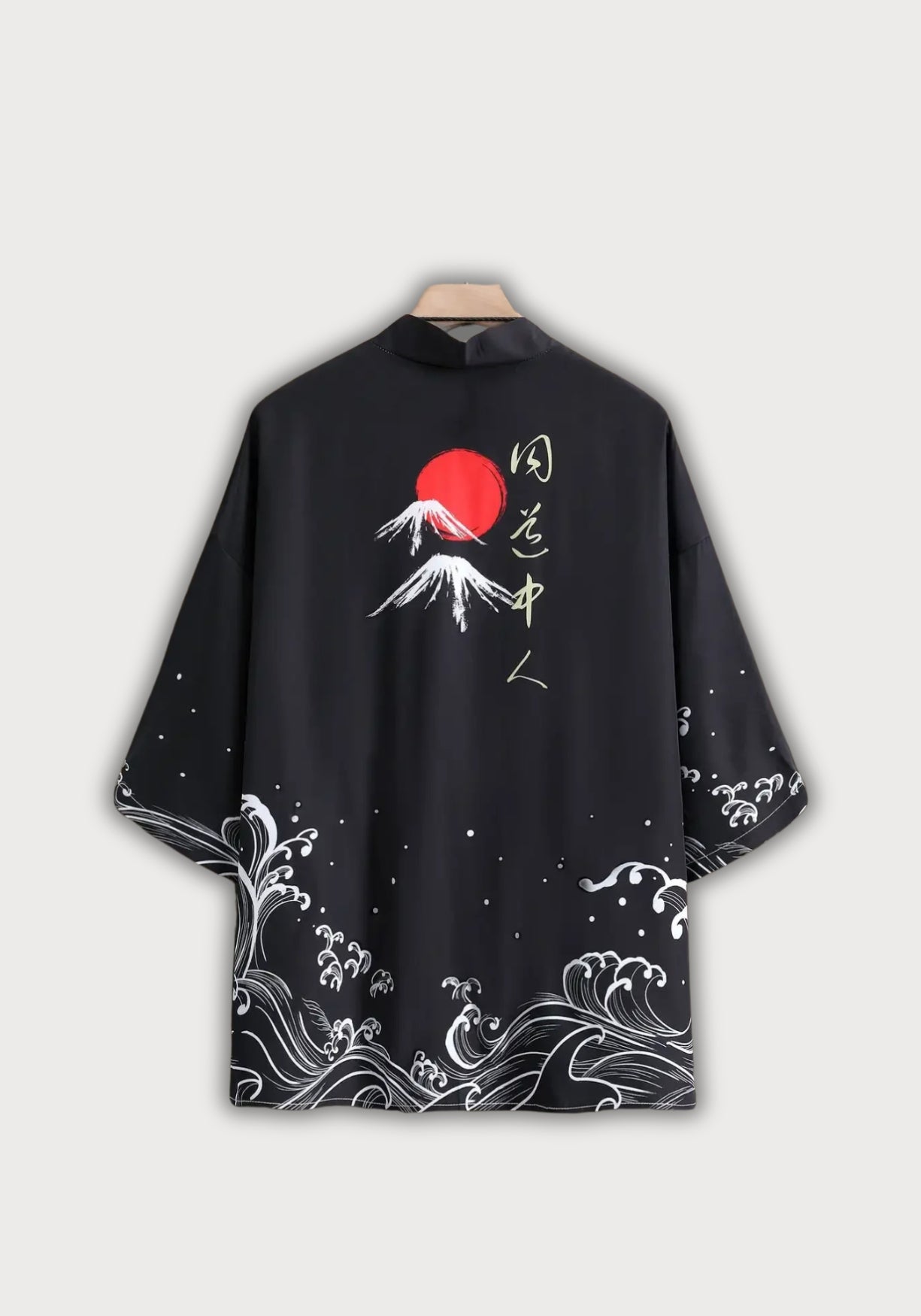 Kimono japonais pour homme Ce kimono japonais moderne s’inspire des éléments les plus puissants de l’esthétique nippone : la force des vagues, la sérénité du mont Fuji et la pureté du soleil levant. Pensée comme une pièce d’art à enfiler, cette veste
