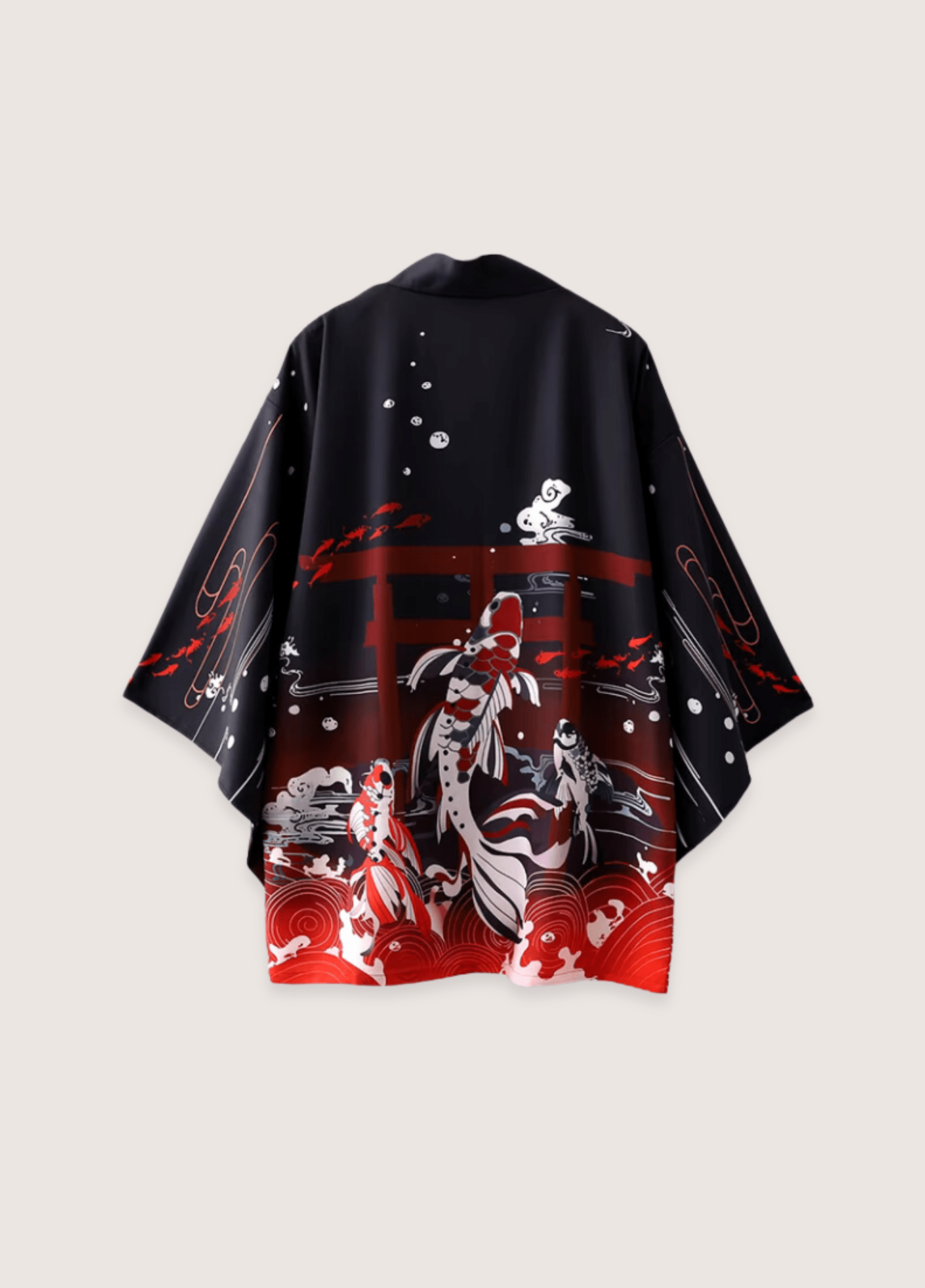 Kimono japonais pour homme et femme Découvrez notre kimono japonais noir Élégance Aquatique , une pièce unique pour votre garde-robe. Ce vêtement , conçu pour les hommes et les femmes, allie élégance et tradition japonaise . Son tissu noir profond évoque la nuit japonaise. Au bas du kimono , des lignes blanches sur fond rouge représentent des vagues. Au dos, des carpes koï nagent devant un torii rouge . Il marque l’entrée d’un monde mystique. Des points blancs parsèment le noir. Les manches amples présentent des lignes blanches et dorées ainsi que des poissons rouges. Le col est ouvert et plongeant. Une tenue élégante et intemporelle. Plus qu’un simple habit , c’est un accessoire de mode polyvalent . Taille unique: Longueur : 73 cm Manches : 28 cm Épaule : 62 cm Buste : 120 cm Composition:
