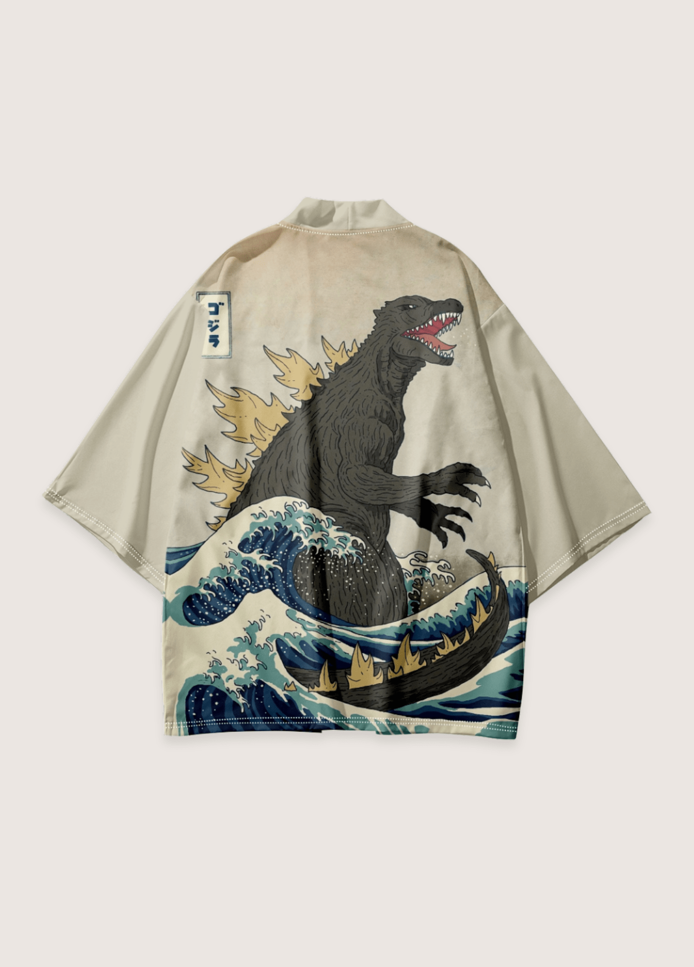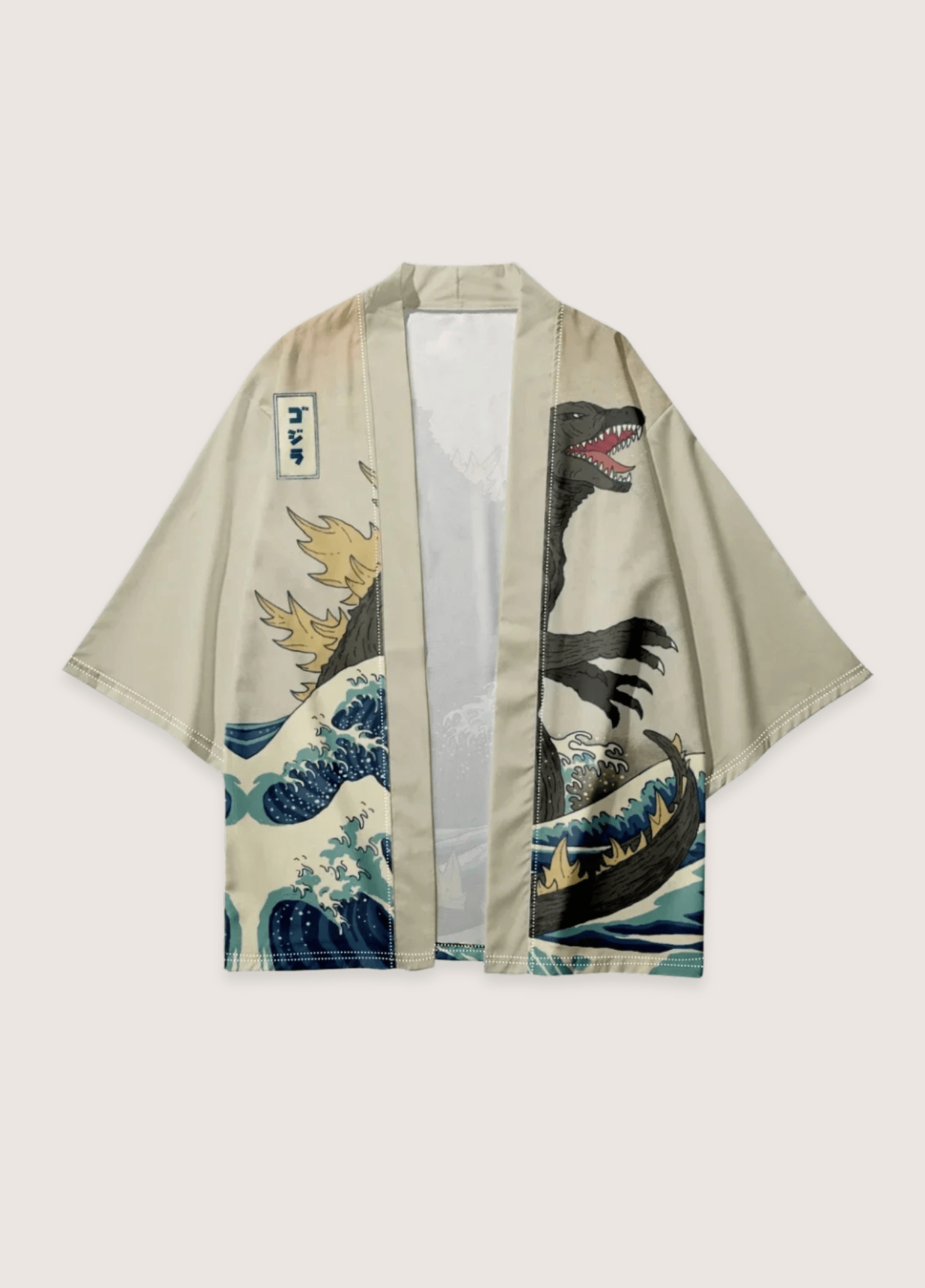 Kimono japonais homme femme Découvrez notre kimono japonais style haori, une pièce unique pour votre garde-robe. Ce vêtement, conçu pour les hommes et les femmes, allie style contemporain et inspiration japonaise. Ce kimono se distingue par son imprimé pop culture avec l’iconique Godzilla . Le tissu beige sable présente la célèbre « Grande Vague de Kanagawa » avec ses tons de bleu profond et turquoise. Godzilla est représenté dans des tons de gris anthracite avec ses épines dorsales dorées. La coupe traditionnelle du kimono est modernisée par des manches trois-quarts et une silhouette ample. Le style oversize et la fermeture ouverte créent une allure décontractée et contemporaine. Une signature en kanji placée dans un cartouche traditionnel, apporte une touche d’authenticité. Ce kimono japon