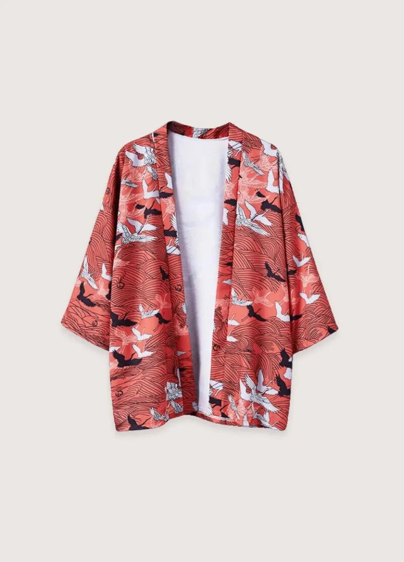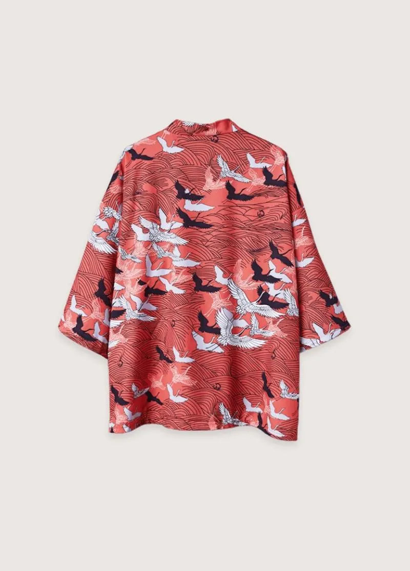 Kimono traditionnel japonais aux grues élégantes tsuru Le kimono japonais traditionnel grues que nous vous présentons incarne l’essence même de l’art vestimentaire nippon. Cette pièce d’exception rouge éclatante, ornée de majestueux oiseaux tsuru bla