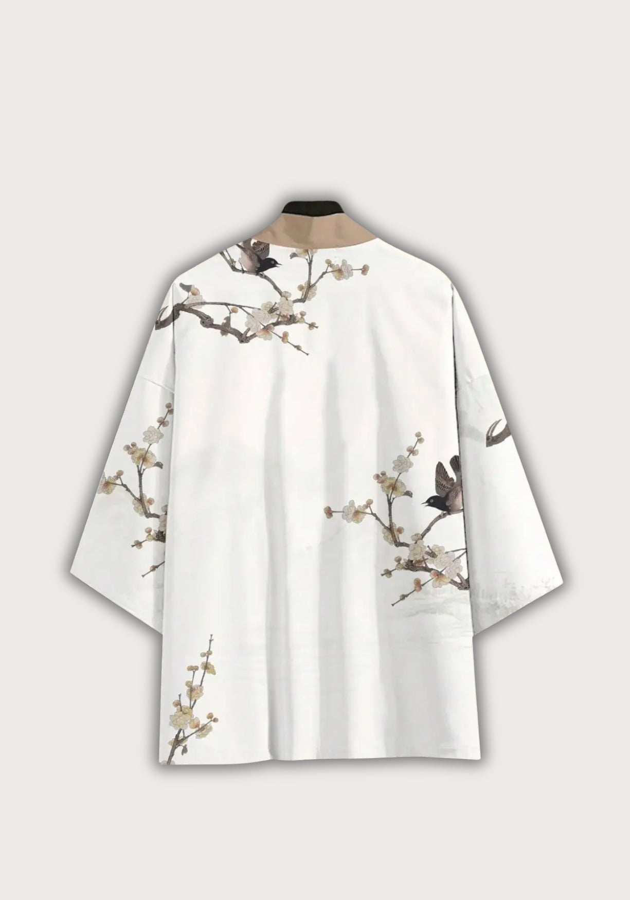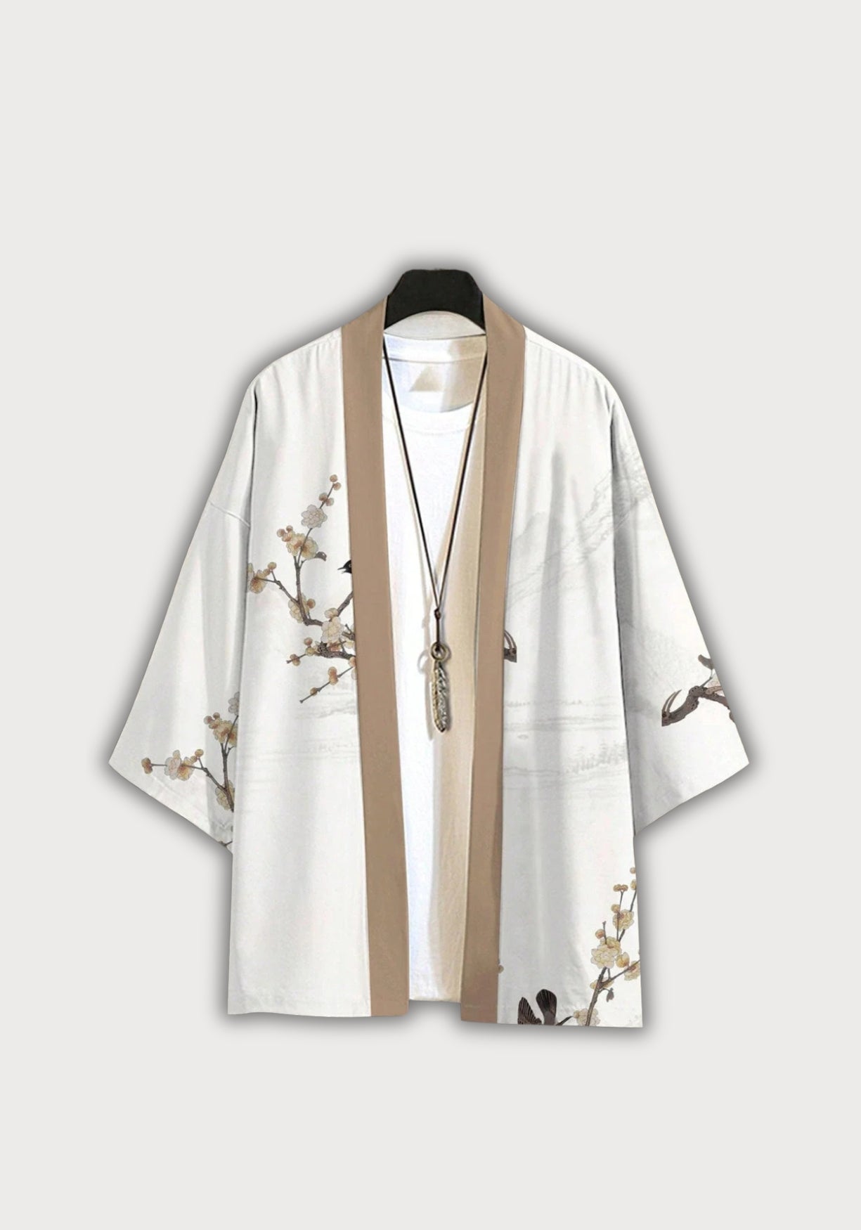 Kimono japonais imprimé pour homme Évoquant la poésie d’un jardin printanier, ce kimono japonais léger et fluide s’inspire des estampes traditionnelles. Son imprimé raffiné met en scène de délicates branches de prunier en fleurs où se perchent discrètement des oiseaux, symbole de paix et de sérénité dans la culture asiatique. Le col droit contrasté couleur sable vient souligner l’élégance épurée de l’ensemble. Confectionné en polyester respirant, ce kimono d’été est pensé pour allier confort et légèreté. Sa coupe ample et ses manches courtes légèrement descendues assurent une silhouette décontractée sans rien perdre de son charme. Une pièce facile à porter, que ce soit sur un t-shirt blanc ou en superposition pour un style plus habillé. Un vêtement qui parle d’harmonie et de simplicité, à porter comme une seconde peau quand l’envie d’un luxe discret se fait sentir. Un kimono moderne, imprégné de douceur et d’équilibre, pensé pour ceux qui cultivent la beauté des choses simples. Tissu principal : polyester.