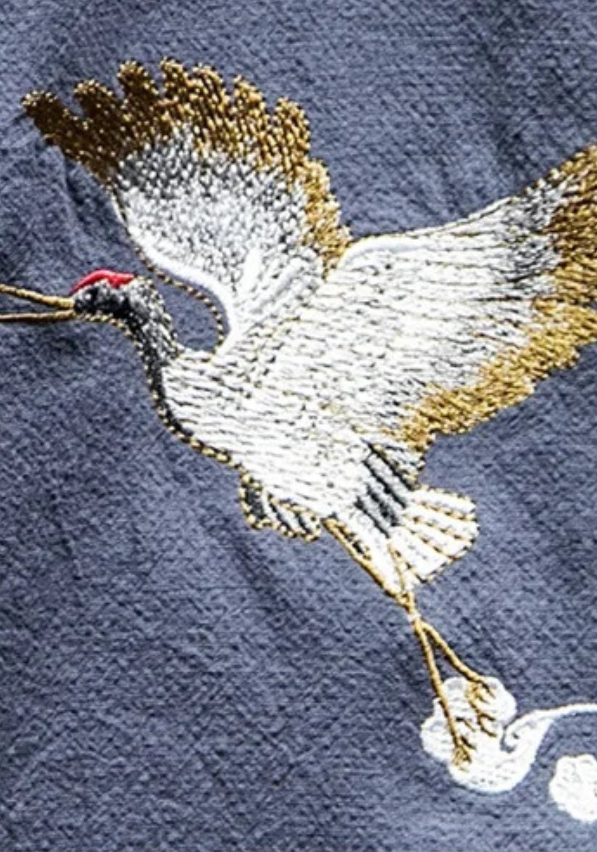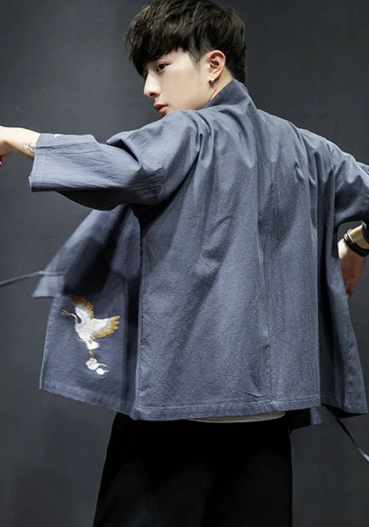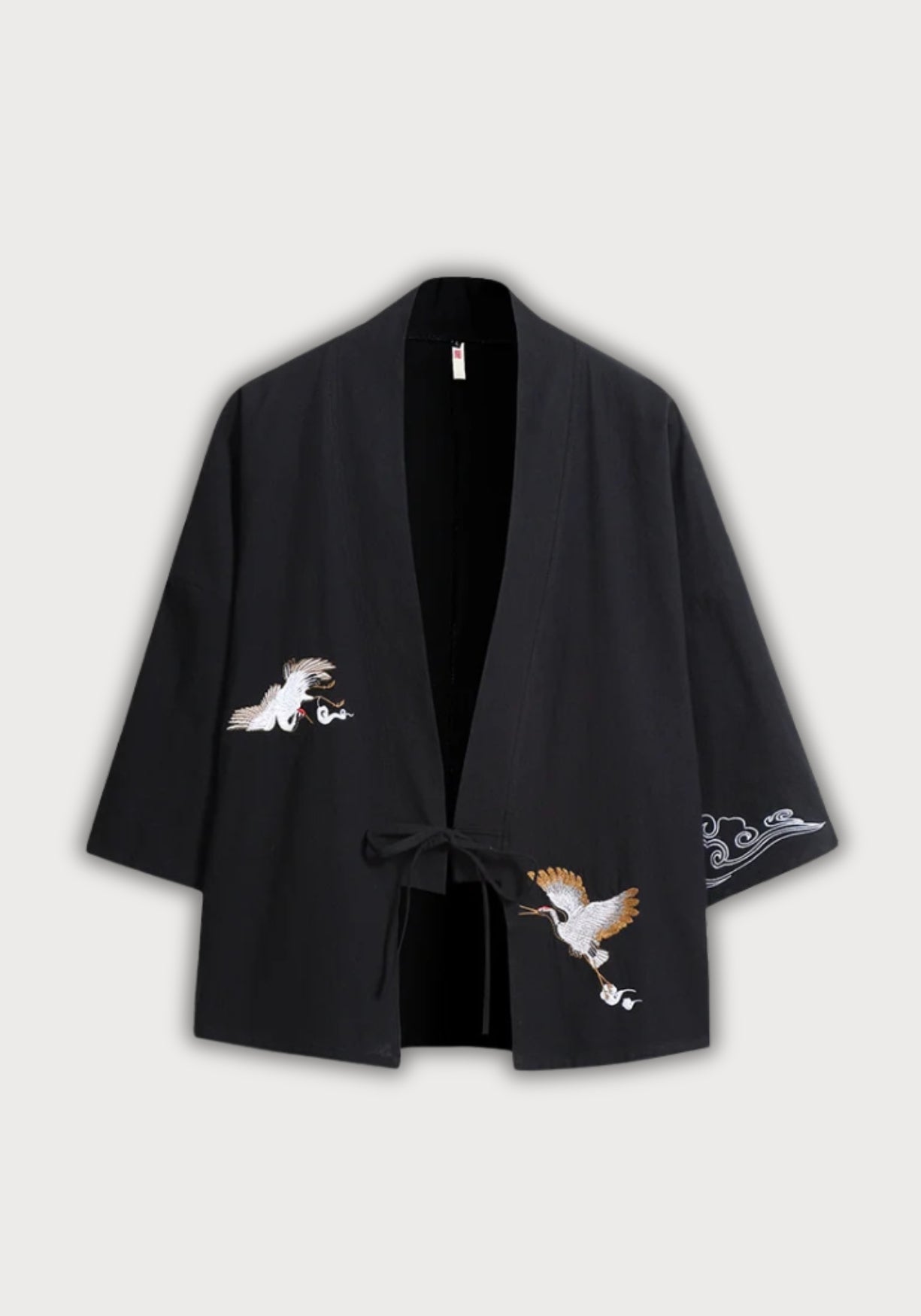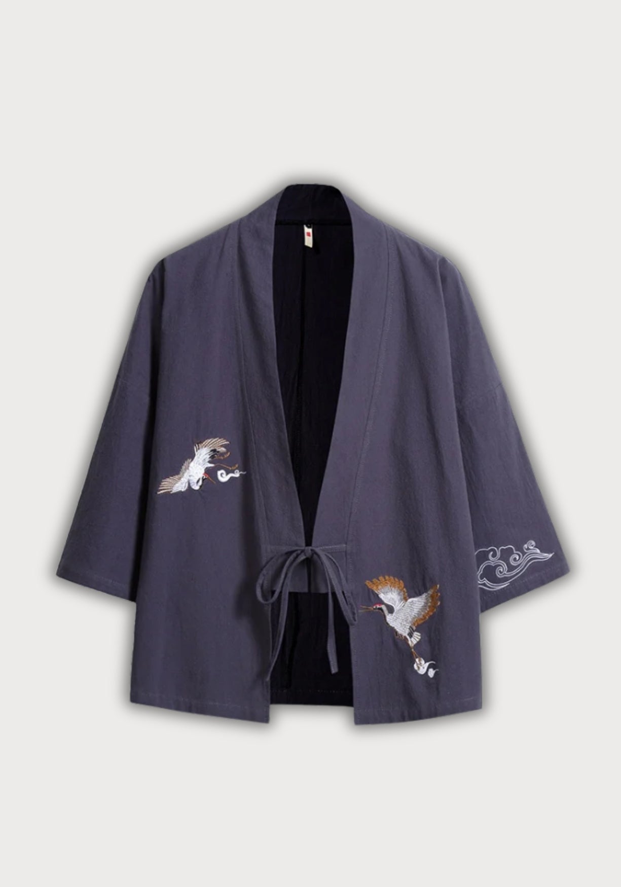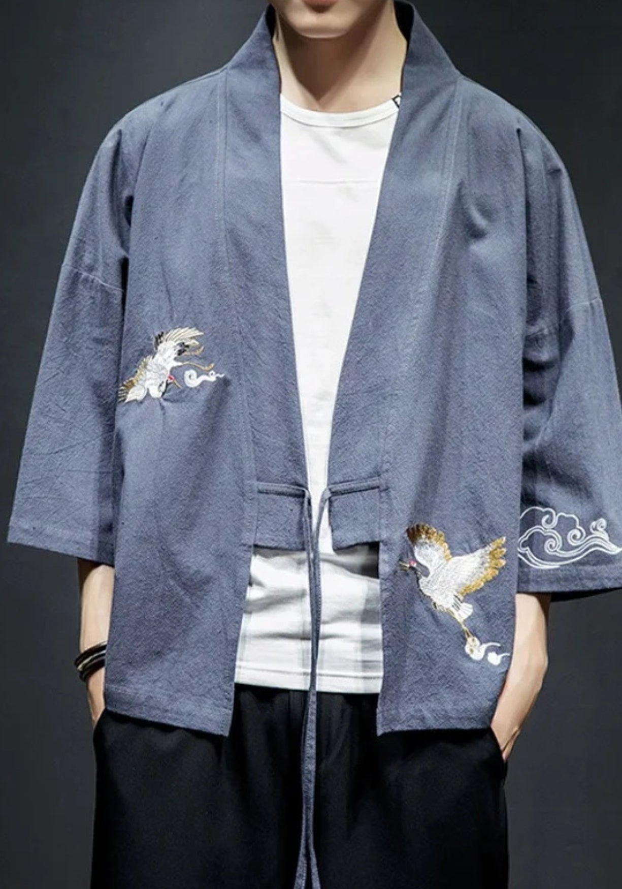 Kimono japonais pour homme Cette veste kimono brodée est une réinterprétation raffinée du vêtement traditionnel japonais . Confectionnée en coton doux et léger, elle procure un confort idéal pour les journées estivales et les soirées fraîches de mi-saison. Avec ses manches trois-quarts et son col de type châle ouvert , elle conjugue aisément élégance classique et décontraction moderne. Les broderies délicates représentant des grues majestueuses en plein vol ornent subtilement l’avant de la veste, symbolisant harmonie, sérénité et longévité. Les manches présentent quant à elles des broderies représentant des motifs nuageux stylisés, apportant une touche de poésie et évoquant l’imagerie traditionnelle asiatique. Chaque broderie, soigneusement réalisée, souligne le souci du détail et l’authenticité de cette pièce. Polyvalente et facile à porter, ce kimono court s’intègre naturellement dans un style casual chic. Elle se marie parfaitement avec un simple t-shirt uni ou une chemise légère, exprimant ainsi avec finesse votre goût pour la culture japonaise, la qualité des matières et un luxe discret au quotidien. Portez l’élégance japonaise, avec simplicité et distinction. Composition : 100% coton