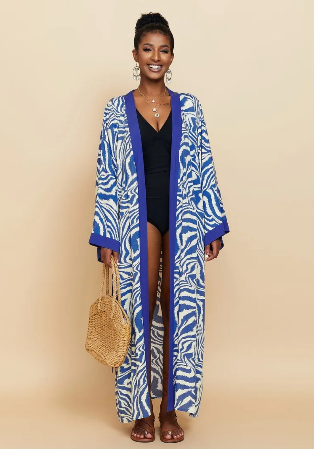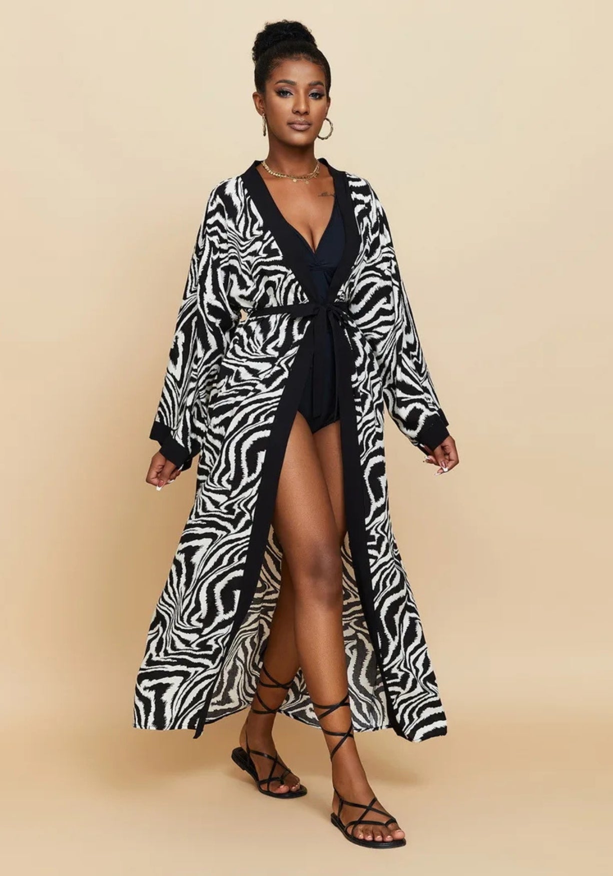 Kimono long à motif pour femme Osez une allure audacieuse avec ce kimono long à motif zébré . Sa coupe fluide, ses manches longues et son imprimé animalier revisité font de lui une pièce d’exception, idéale pour sublimer vos tenues de plage ou vos es