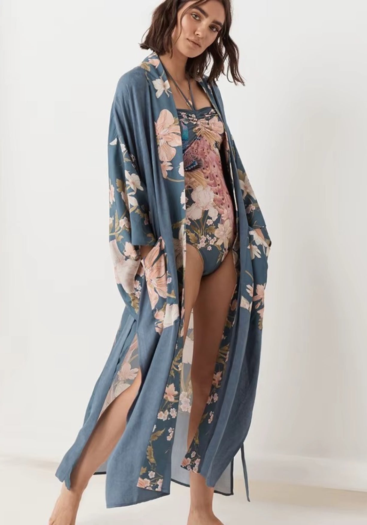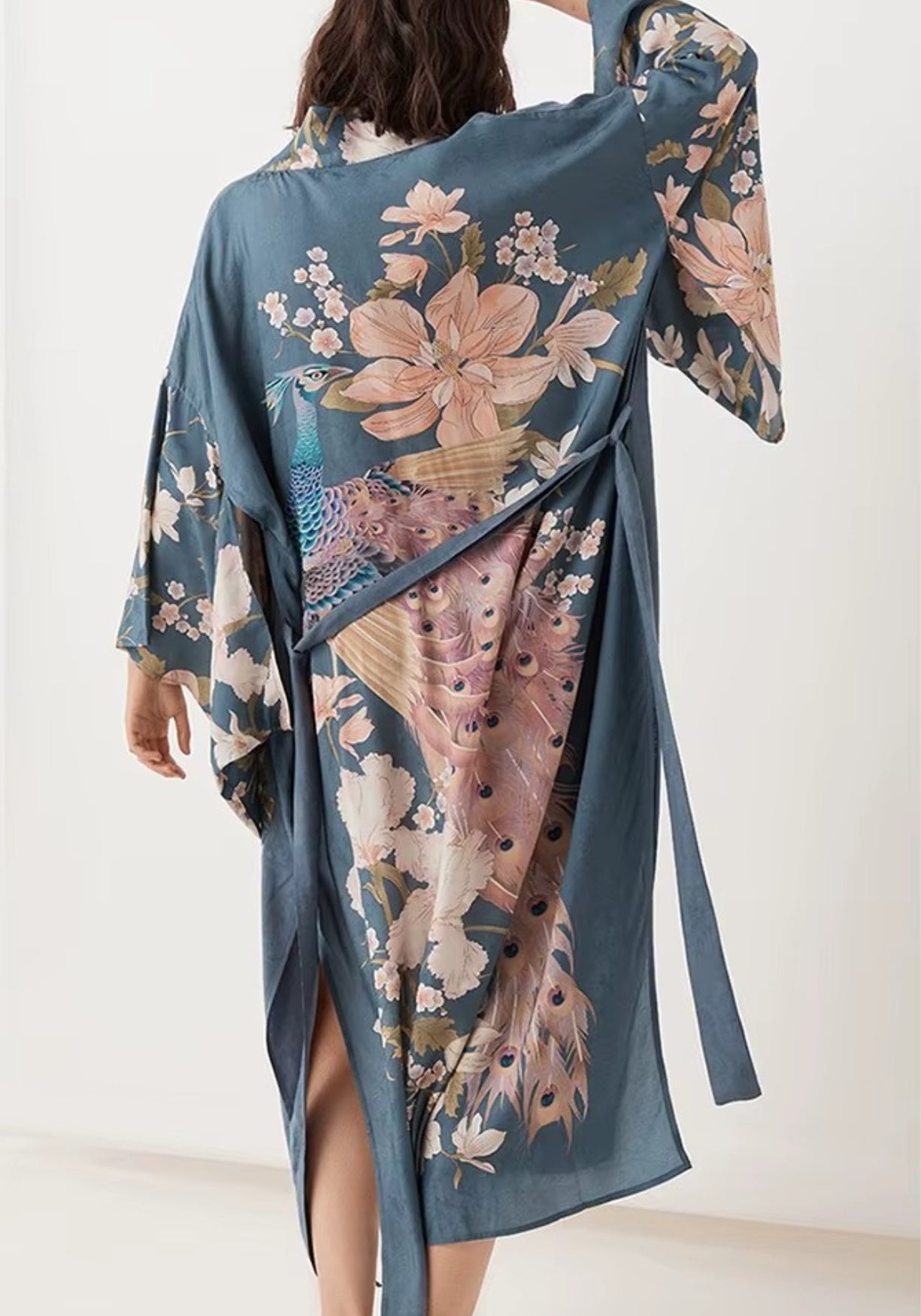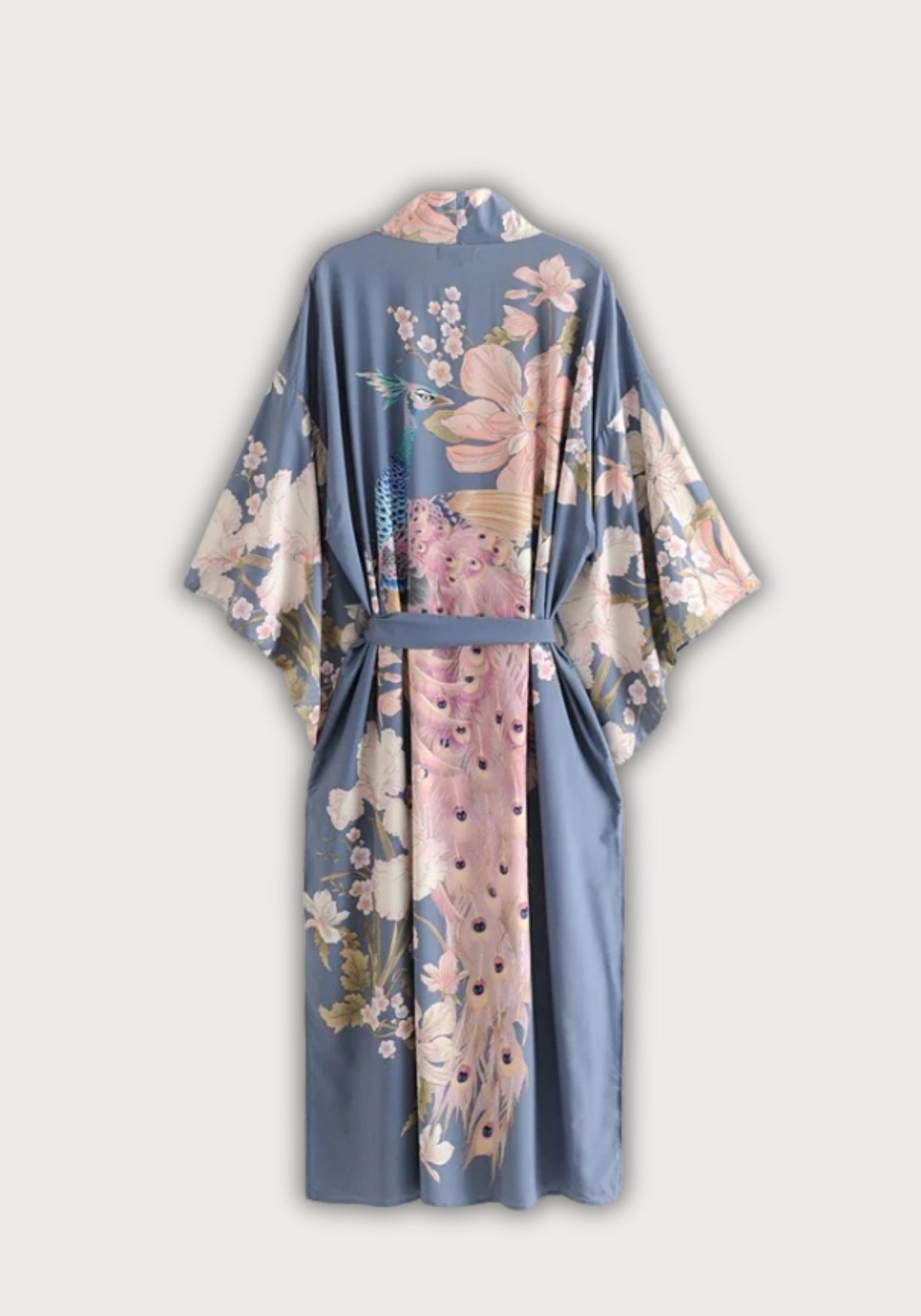 Kimono long à imprimé paon et fleurs Laissez-vous envoûter par la poésie visuelle de ce kimono long à imprimé paon et fleurs . Sa coupe ample et droite, sublimée par des manches chauve-souris et une ceinture ton sur ton à nouer, crée une silhouette l
