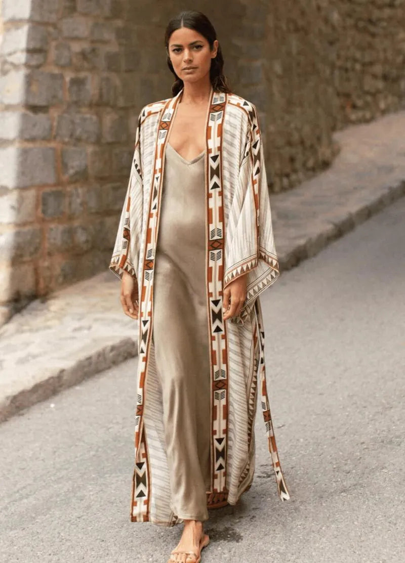 Kimono ethnique beige long en coton pour femme bohème Ce kimono long coton ethnique beige sublime votre silhouette grâce à son drapé majestueux et ses motifs géométriques sophistiqués. Confectionné dans un tissu fluide de qualité supérieure , ce vêtement traditionnel japonais offre une élégance intemporelle avec ses teintes chaudes de terre cuite et de noir sur fond crème délicat. Pourquoi choisir cette tunique orientale d’exception ? Cette pièce maîtresse transforme instantanément votre garde-robe grâce à sa coupe longue flatteuse qui s’adapte à toutes les morphologies. Ses manches amples permettent une liberté de mouvement incomparable, tandis que le tombé parfait du tissu apporte une sophistication naturelle. Idéale pour les femmes recherchant un style bohème chic, cette création allie