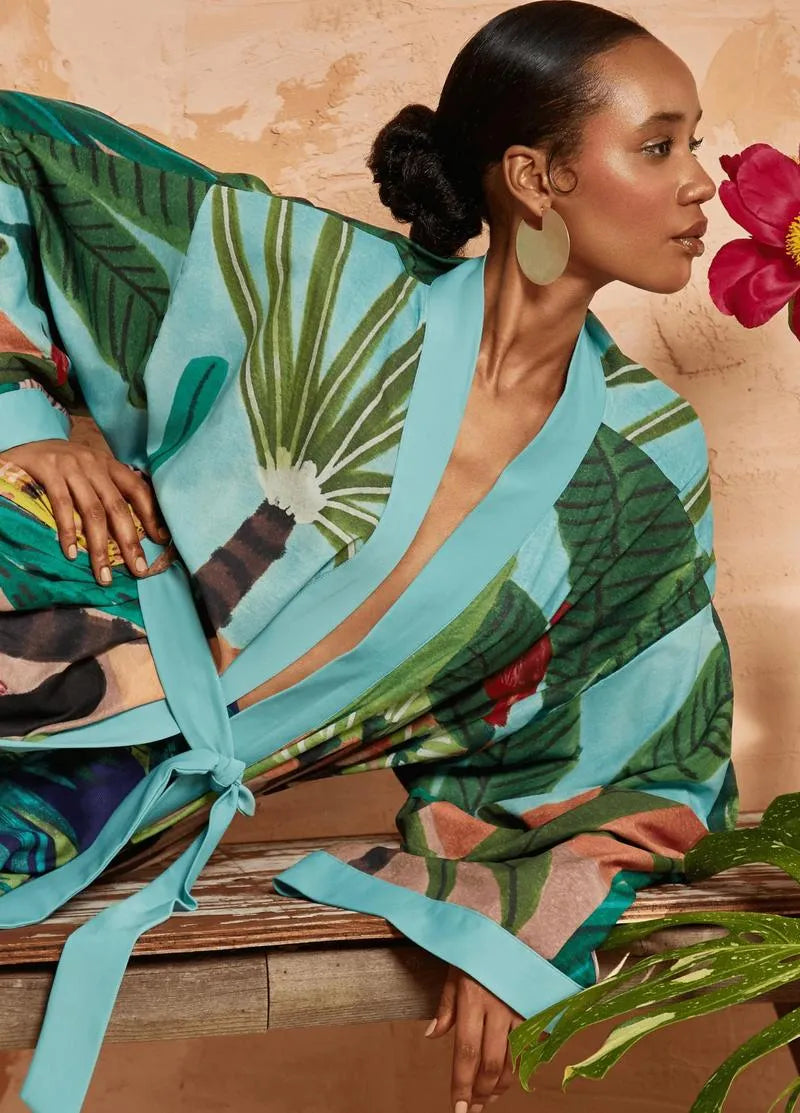 Kimono tropical long d’été pour femme : l’élégance orientale aux motifs exotiques Ce kimono long été tropical capture l’essence de l’artisanat japonais traditionnel dans une version estivale rafraîchissante. Confectionné dans un tissu fluide et respirant, ce vêtement traditionnel japonais révèle des motifs tropicaux aux teintes turquoise et vertes qui évoquent les jardins zen nippons. Sa coupe ample offre une liberté de mouvement absolue tout en sculptant délicatement la silhouette féminine. Pourquoi choisir ce kimono tropical pour vos journées d’été ? Cette tunique orientale se distingue par sa polyvalence exceptionnelle et son drapé naturel . Que vous l’associiez à un maillot de bain pour une escapade exotique ou que vous l’adoptiez comme pièce maîtresse d’une tenue décontractée chic, ce