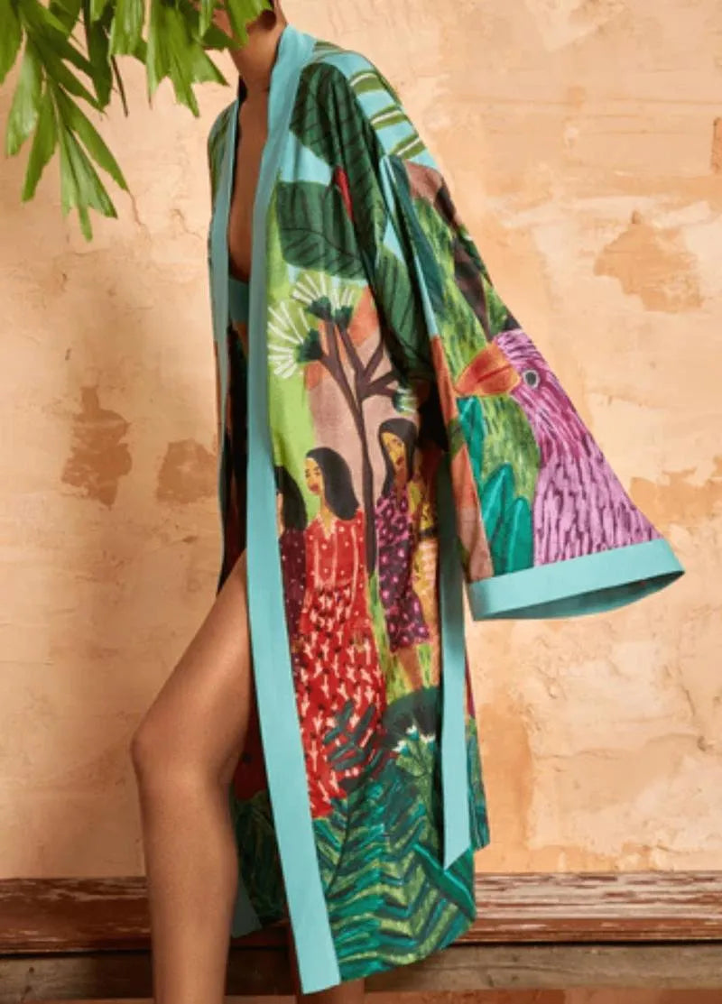 Kimono tropical long d’été pour femme : l’élégance orientale aux motifs exotiques Ce kimono long été tropical capture l’essence de l’artisanat japonais traditionnel dans une version estivale rafraîchissante. Confectionné dans un tissu fluide et respi