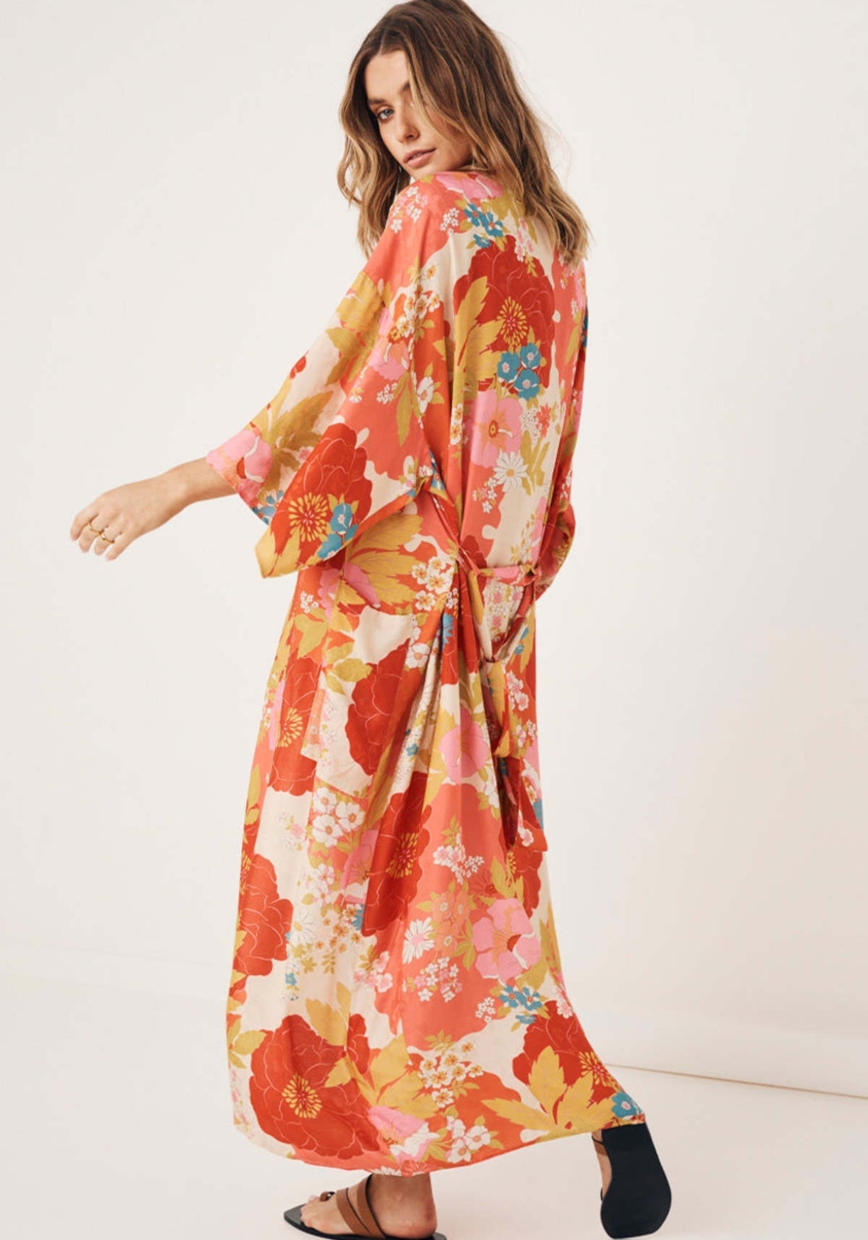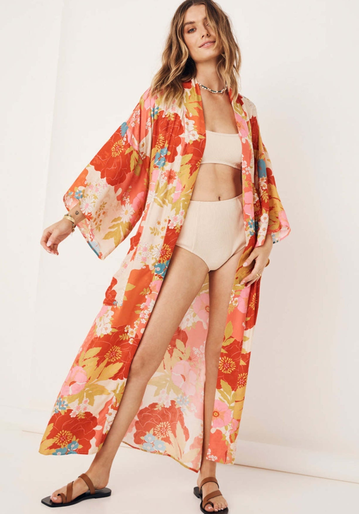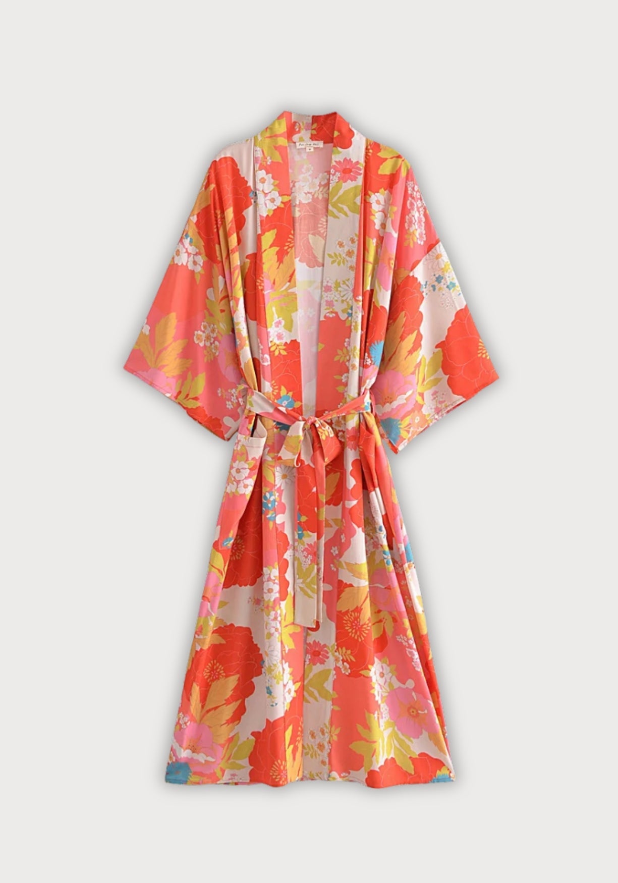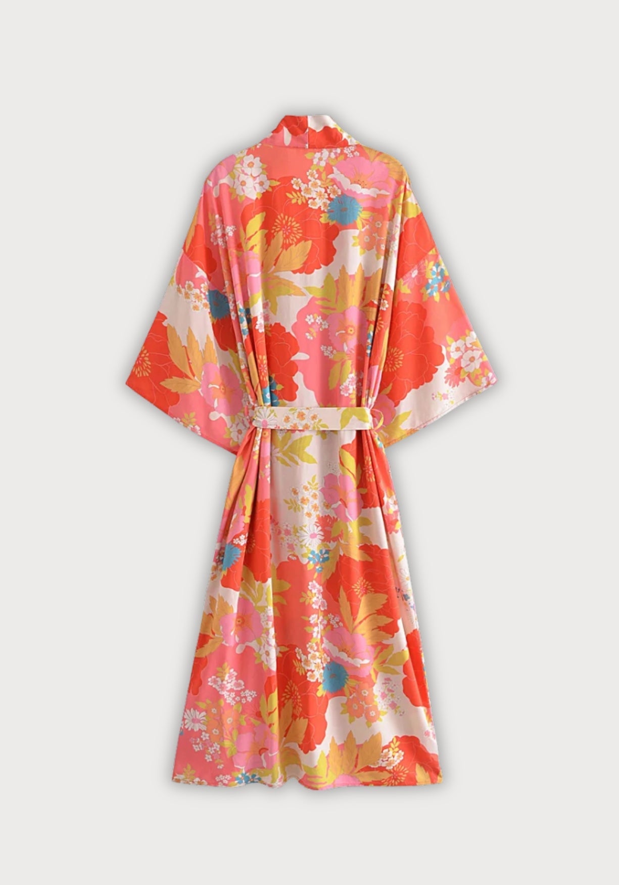 Robe kimono rouge corail pour femme Ce kimono long fleuri rouge corail incarne la légèreté et la joie des beaux jours. Confectionné dans un tissu fluide et soyeux, il révèle un superbe motif floral aux tons chaleureux de rouge corail, rose, jaune dor