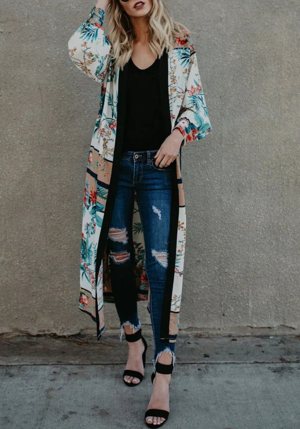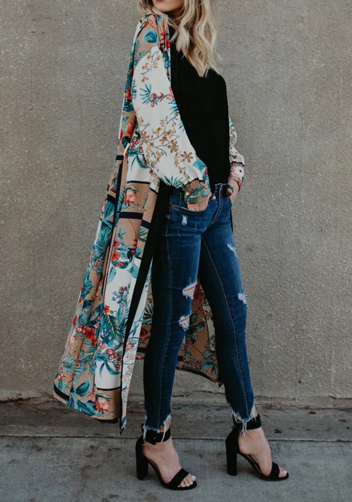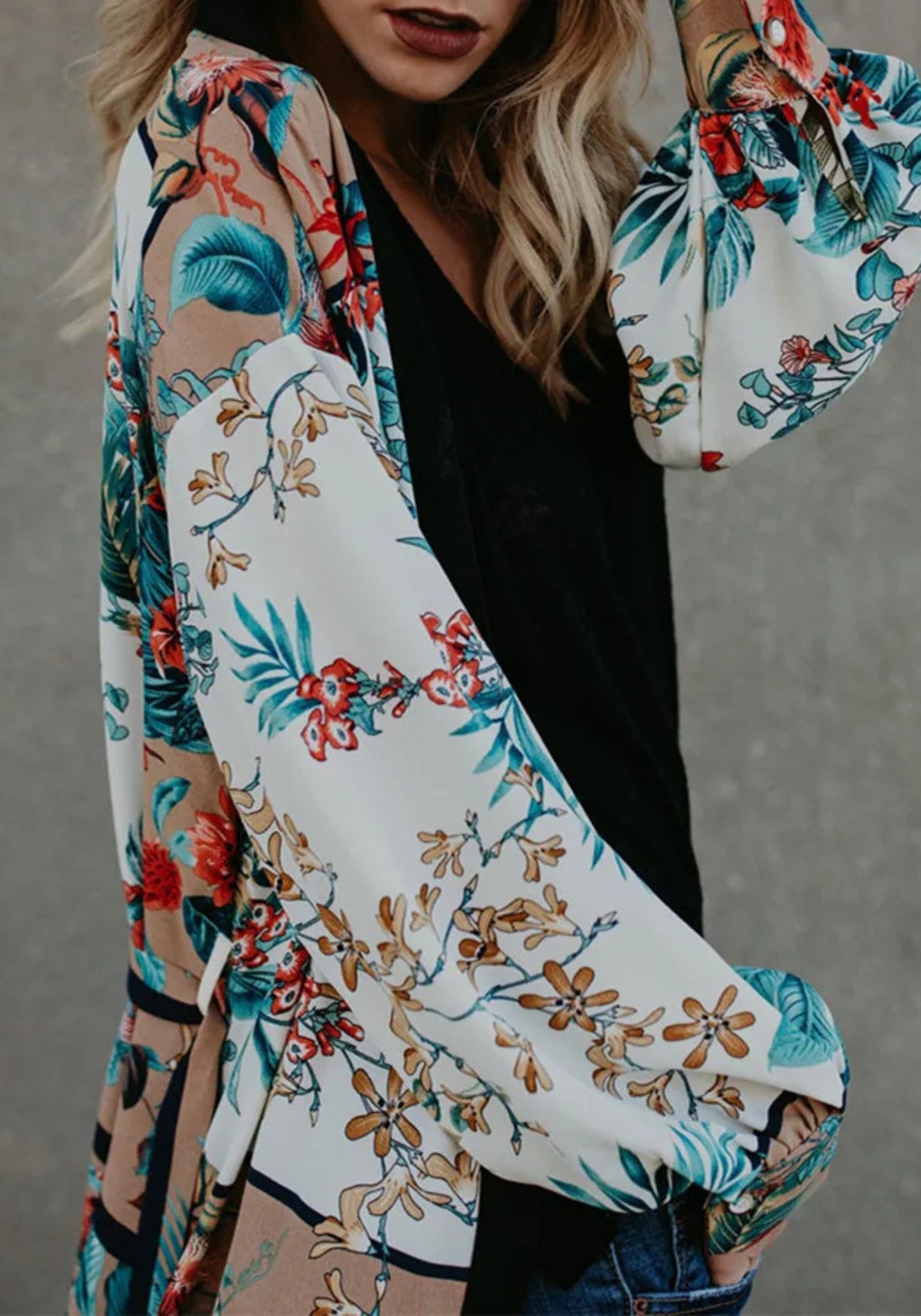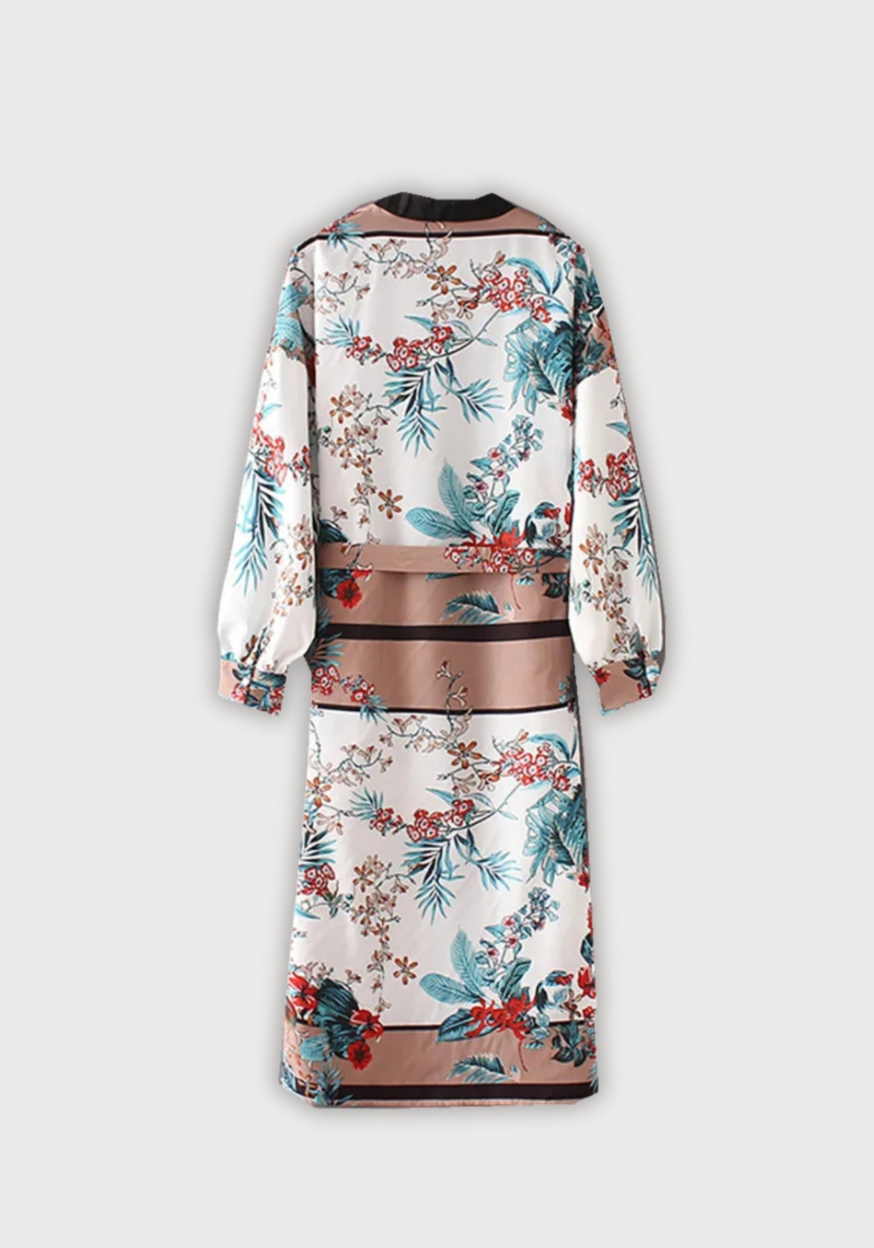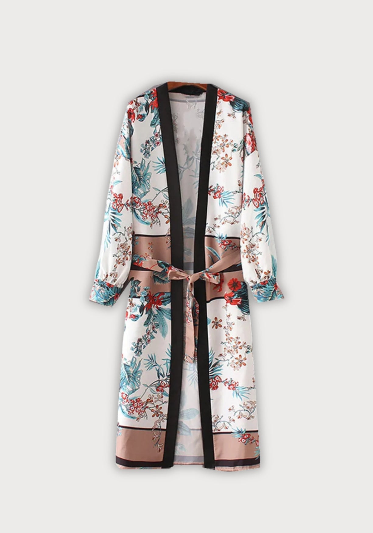 Kimono long satiné à fleurs tropicales Ce kimono long au tombé fluide est une véritable pièce de caractère, pensée pour sublimer les silhouettes avec légèreté. Confectionné en polyester doux et satiné , il offre un fini légèrement brillant et agréable au toucher, parfait pour jouer les superpositions raffinées. Son imprimé botanique s’épanouit sur un fond blanc nuancé , ponctué de motifs floraux éclatants dans des tons de rouge profond, bleu turquoise, beige sable et brun doré. Des rameaux délicats et des feuillages tropicaux s’entrelacent pour créer un effet de fresque exotique. La coupe ample est structurée par une bordure noire contrastante sur toute la longueur du col, qui apporte un équilibre moderne et graphique à l’ensemble. Les manches longues , légèrement bouffantes aux poignets, offrent un beau volume qui accompagne le mouvement. Ce kimono est ajustable à la taille grâce à une ceinture ton sur ton, pour une silhouette à la fois libre et élégamment soulignée. Un kimono d’évasion, pensé comme une peinture vivante — pour celles qui voyagent à travers la beauté. Composition : 100% polyester.