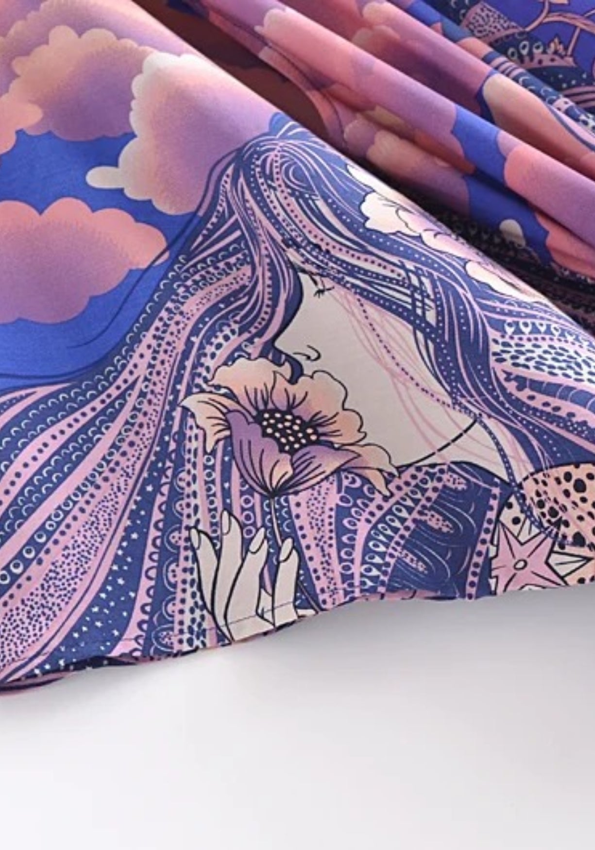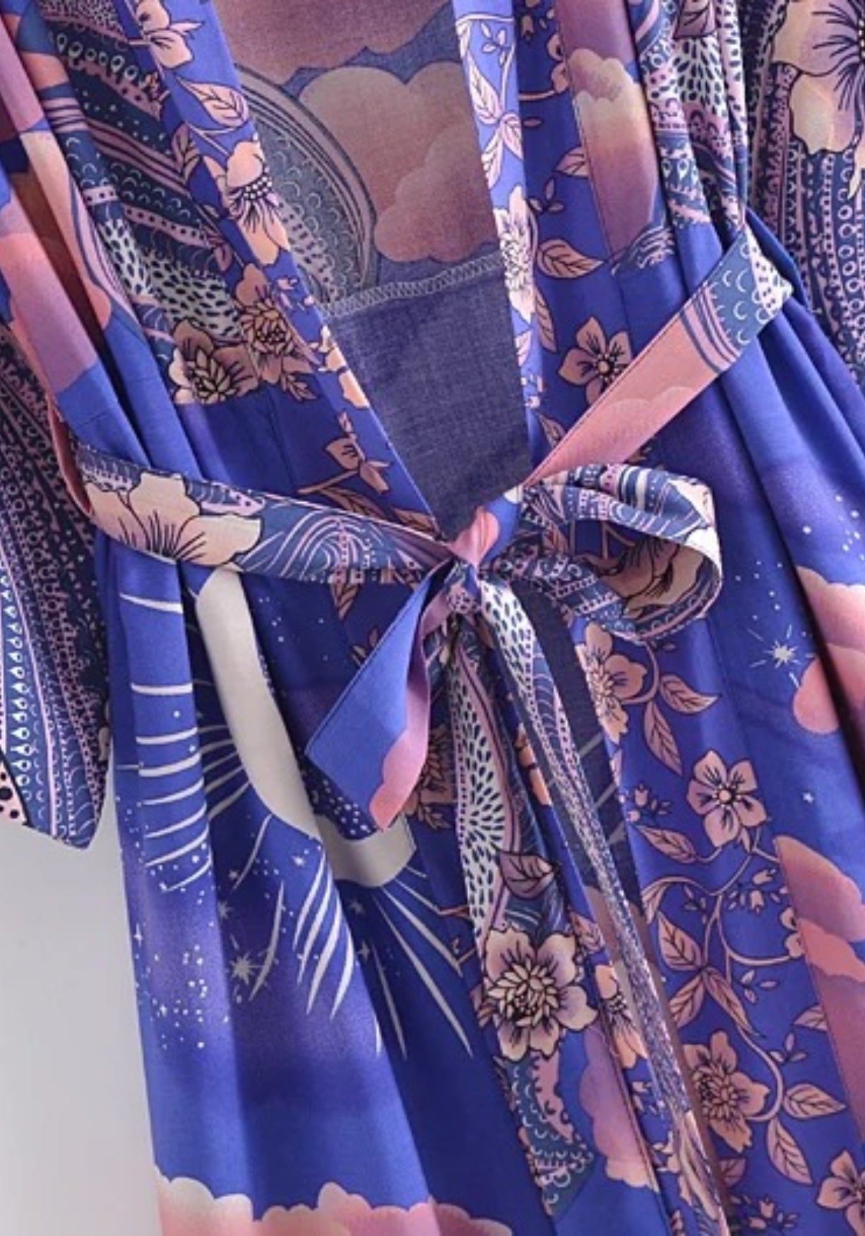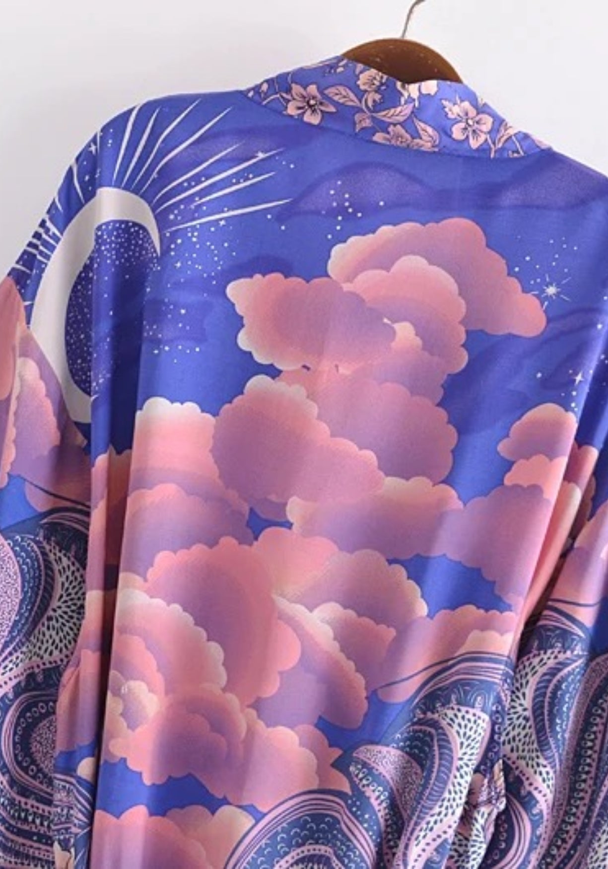 Kimono court bohème lune violette et nuages Plongez dans un rêve étoilé avec ce kimono long au motif céleste . Son tissu fluide et soyeux, fait d’un mélange doux de coton et rayonne , dévoile un ciel nocturne vibrant où les nuages rose pêche ondulent