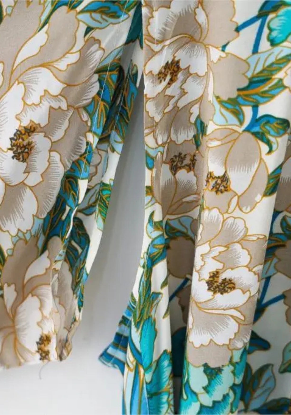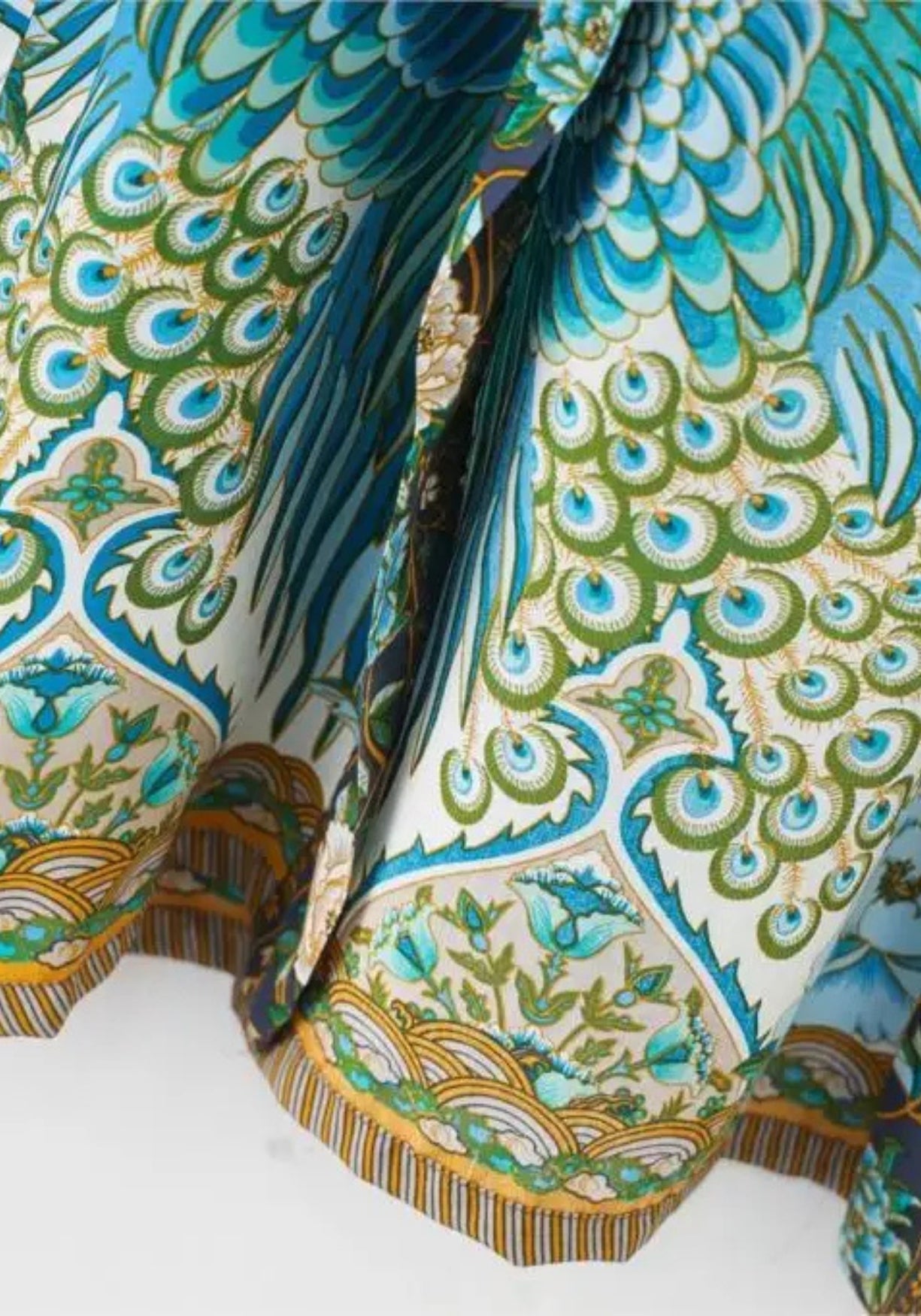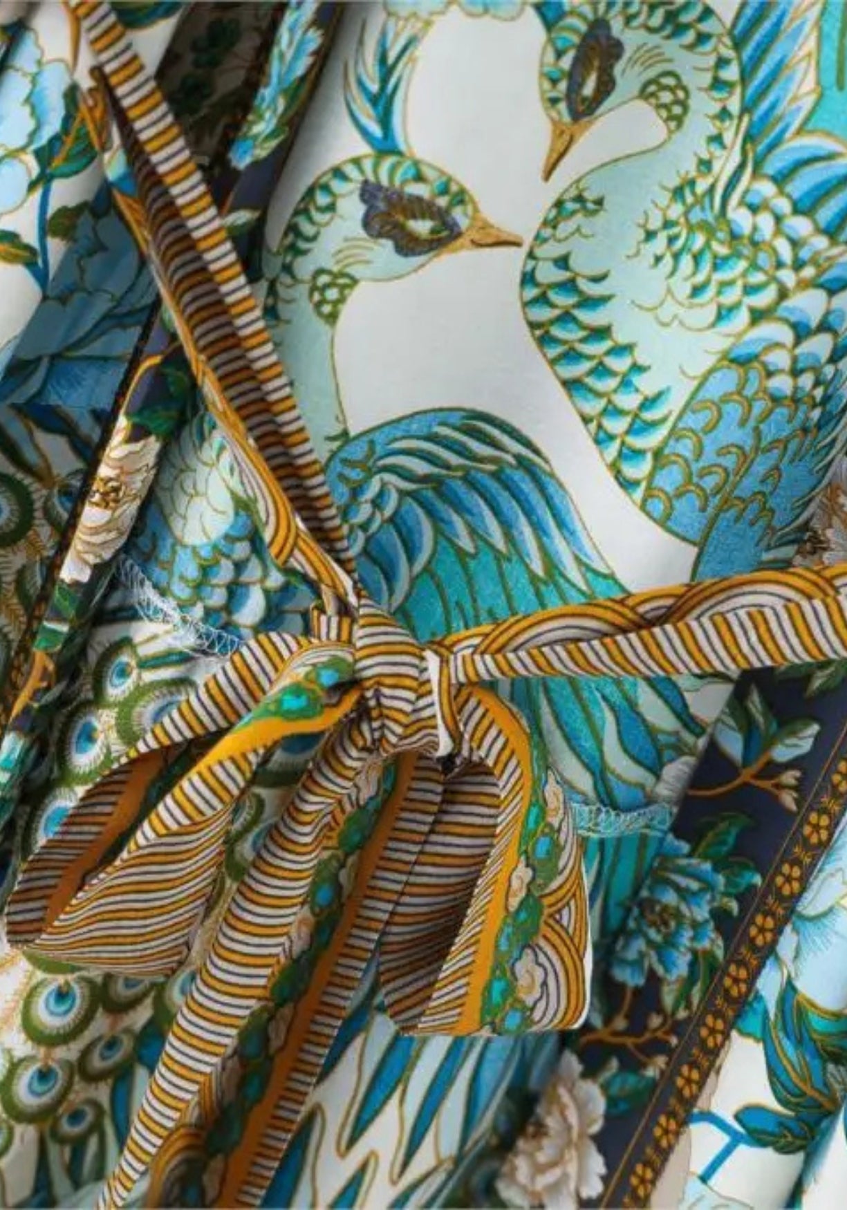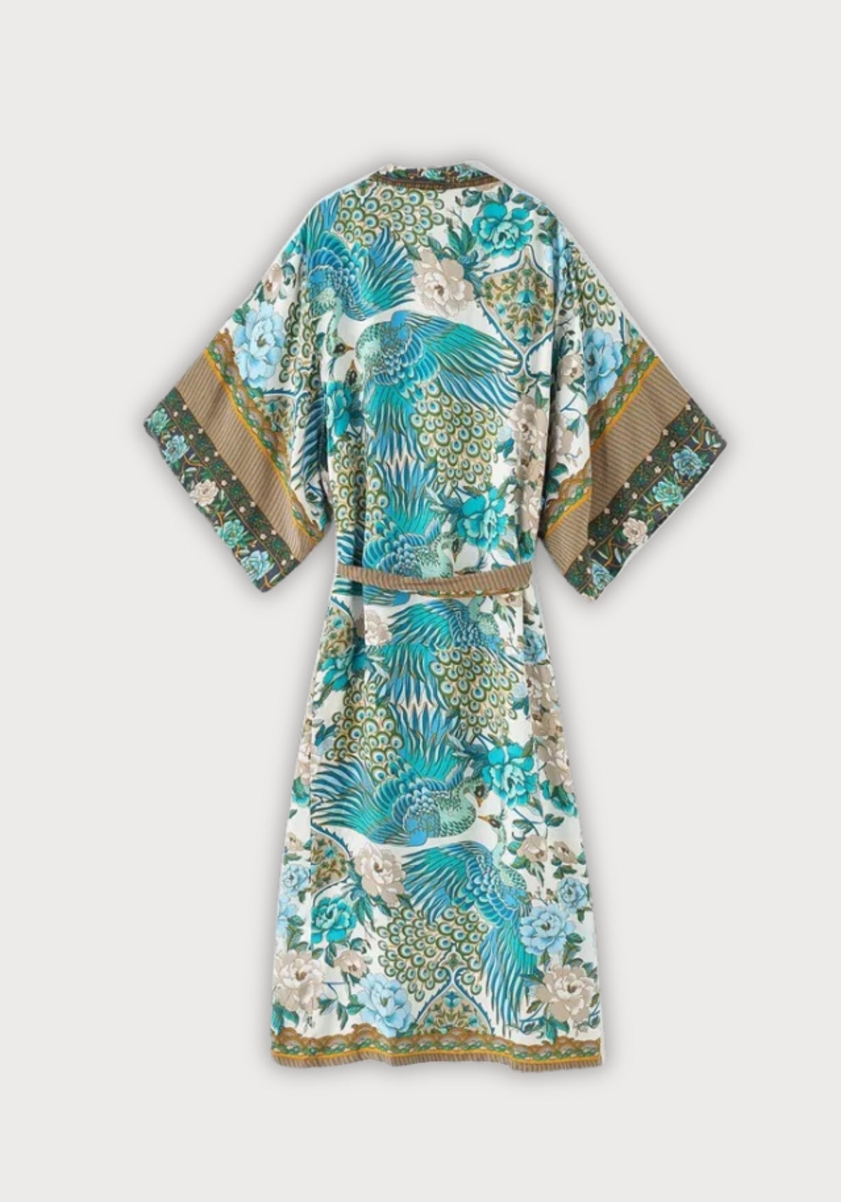 Kimono long aux motifs floraux de paon Ce kimono pour femme est une invitation à la douceur. Sa coupe ample et fluide enveloppe le corps sans le contraindre, pour une sensation de légèreté immédiate. Le tissu est doux au toucher, soyeux sans briller excessivement, agréable à porter dès le matin ou pour une soirée calme. Il glisse sur la peau avec élégance et accompagne les gestes avec une grâce naturelle. Le motif est d’une richesse rare : deux paons se font face, entourés de leurs plumes majestueuses aux teintes bleu-vert profond . Le fond est ponctué de fleurs délicates , de feuillages et de détails inspirés des estampes asiatiques . Chaque partie du tissu est un petit monde à observer, comme une peinture vivante. Les manches larges, la bordure rayée et la ceinture à nouer ajoutent du caractère à l’ensemble. C’est le genre de robe qu’on aime autant pour son confort que pour son esthétique. À la maison, sur la plage ou pour sublimer une tenue simple, elle trouve facilement sa place. Elle ne suit pas les tendances : elle traverse le temps avec charme et douceur. Laissez ce kimono raconter votre histoire, avec élégance, douceur… et un soupçon de magie. Composition : 100% viscose.