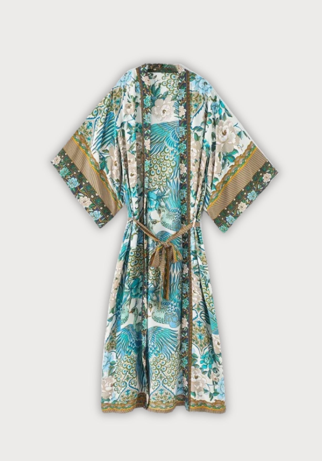 Kimono long aux motifs floraux de paon Ce kimono pour femme est une invitation à la douceur. Sa coupe ample et fluide enveloppe le corps sans le contraindre, pour une sensation de légèreté immédiate. Le tissu est doux au toucher, soyeux sans briller