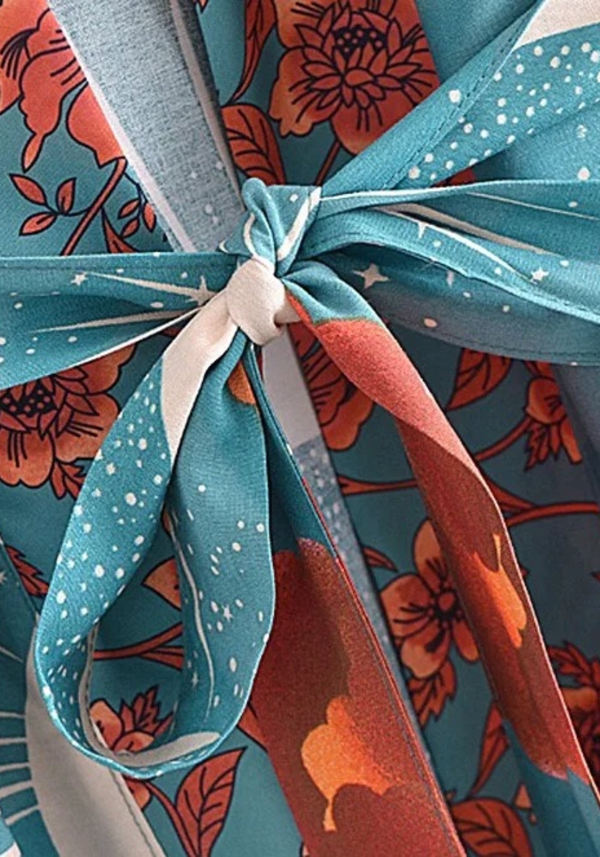 Nos kimonos sont en tissus légers (polyester, viscose, satin). Lavage en machine à 30°C recommandé, ou lavage à la main. Séchage à l'air libre, repassage à basse température.