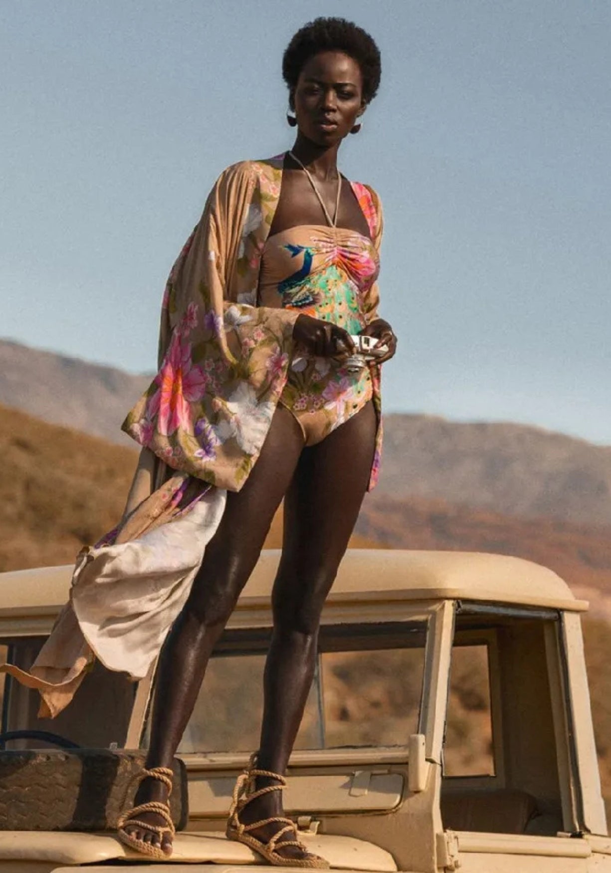 Kimono long nude aux motifs floraux et paon Ce kimono long aux nuances sable et bois de rose est une ode au raffinement bohème . Son tissu fluide est orné de fleurs géantes aquarellées et de sublimes plumes de paon aux reflets pastel, comme si la nature avait été peinte à même le vêtement. Le col et les manches, subtilement contrastés, encadrent délicatement la silhouette. Léger et enveloppant, il glisse sur la peau comme une caresse. Son imprimé évoque la douceur d’un jardin au lever du jour, entre fleurs épanouies, feuillages doux et éclats de bleu turquoise. Ce kimono se noue à la taille avec une ceinture large, soulignant la taille sans effort, et flotte avec élégance à chacun de vos mouvements. Une robe longue qui évoque le voyage, la sensualité et les dimanches lents. Composition : 100% polyester.