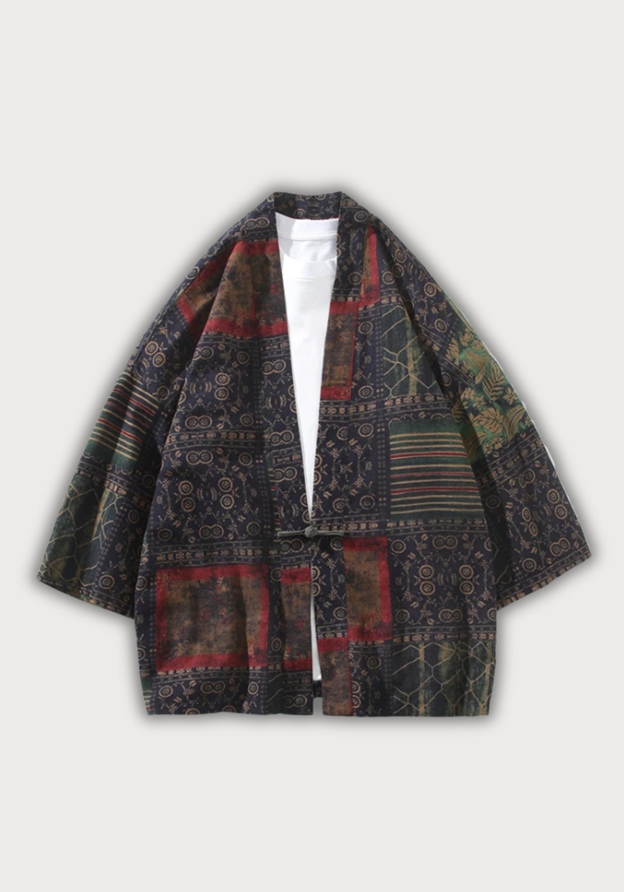 Kimono patchwork bleu marine à motifs rouge et vert unisexe Cette veste style kimono en coton-lin revisite l’élégance traditionnelle japonaise avec un patchwork aux teintes profondes et aux motifs sophistiqués. Sur une base sombre subtilement patinée