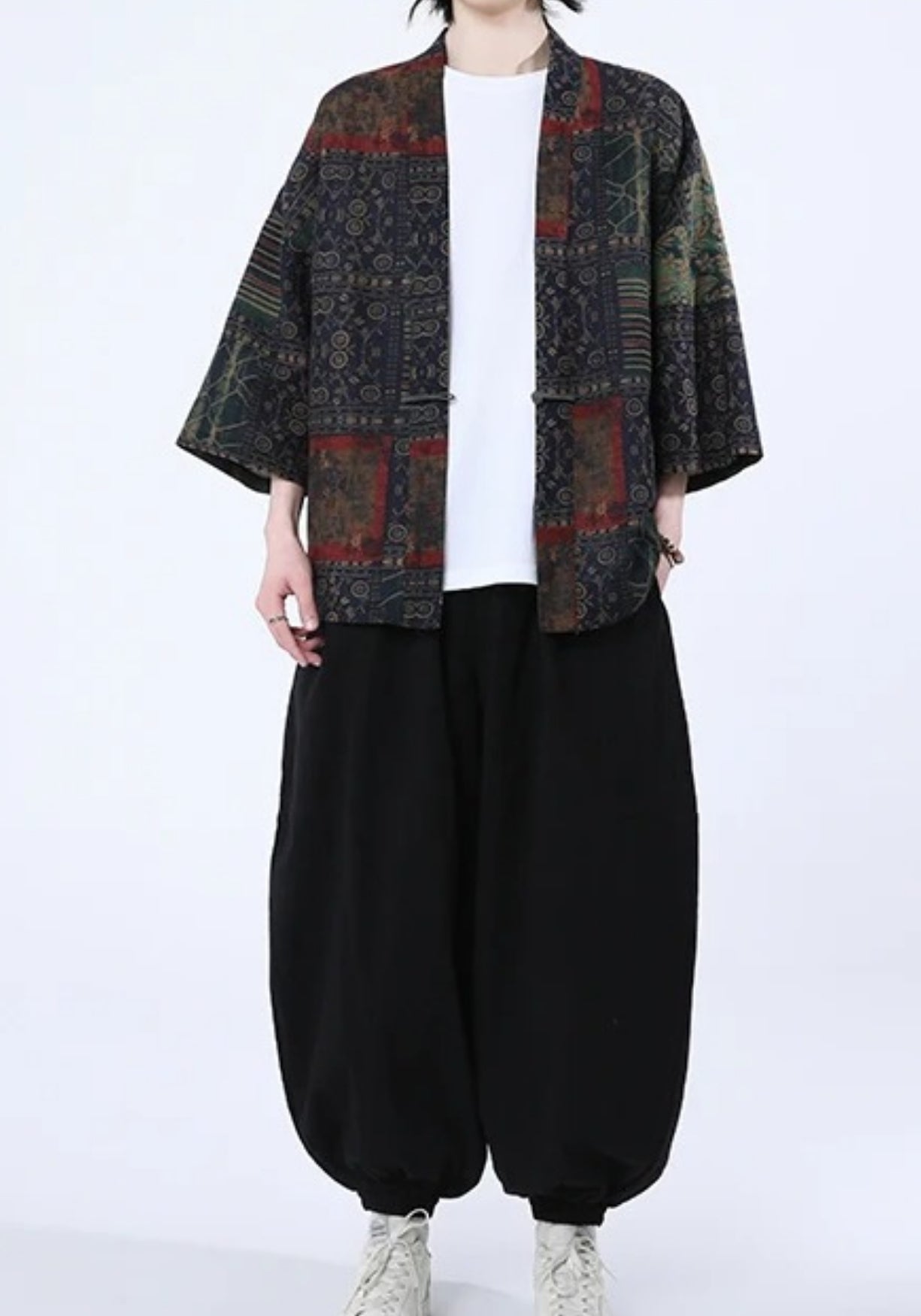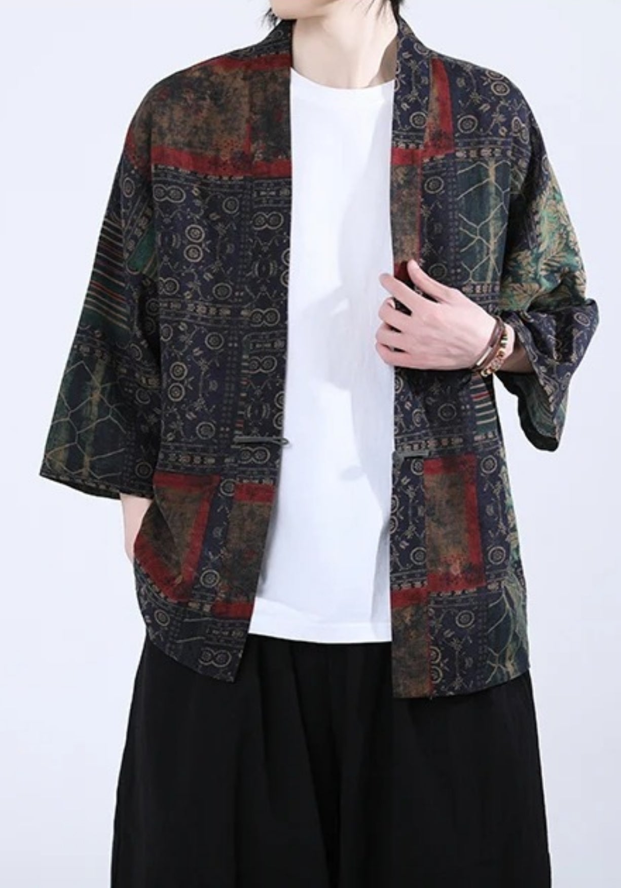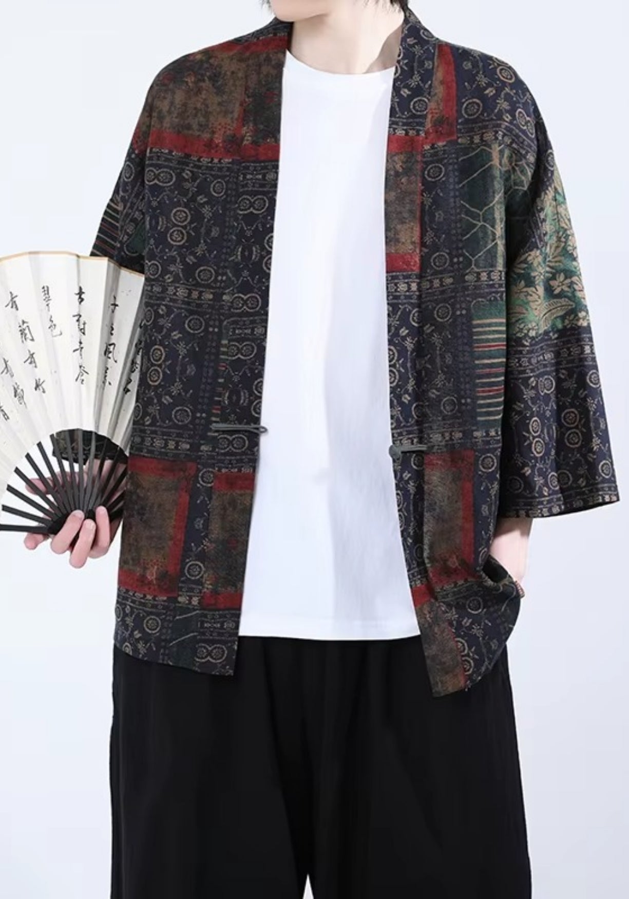 Kimono patchwork bleu marine à motifs rouge et vert unisexe Cette veste style kimono en coton-lin revisite l’élégance traditionnelle japonaise avec un patchwork aux teintes profondes et aux motifs sophistiqués. Sur une base sombre subtilement patinée, se déploient des touches de rouge terre, de vert émeraude et d’ocre vieilli, formant un jeu visuel riche et harmonieux. Chaque panneau est orné de symboles et de textures inspirés des étoffes anciennes, mêlant géométries fines, dessins floraux et motifs traditionnels. Sa coupe fluide et droite, ses manches trois-quarts et son col ouvert en font une pièce légère et facile à superposer. Le tissu respirant, mélange de coton et de lin, assure un confort optimal, que ce soit pour une tenue décontractée ou un style plus affirmé. Parfait sur un simple t-shirt blanc ou une chemise, il apporte une profondeur et une authenticité uniques à votre silhouette. Adoptez le raffinement des étoffes japonaises et donnez à votre style une âme intemporelle. Composition : Coton Lin
