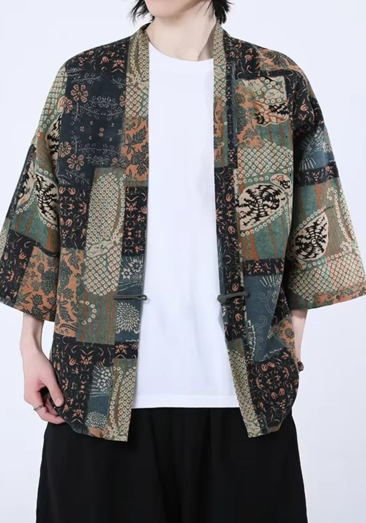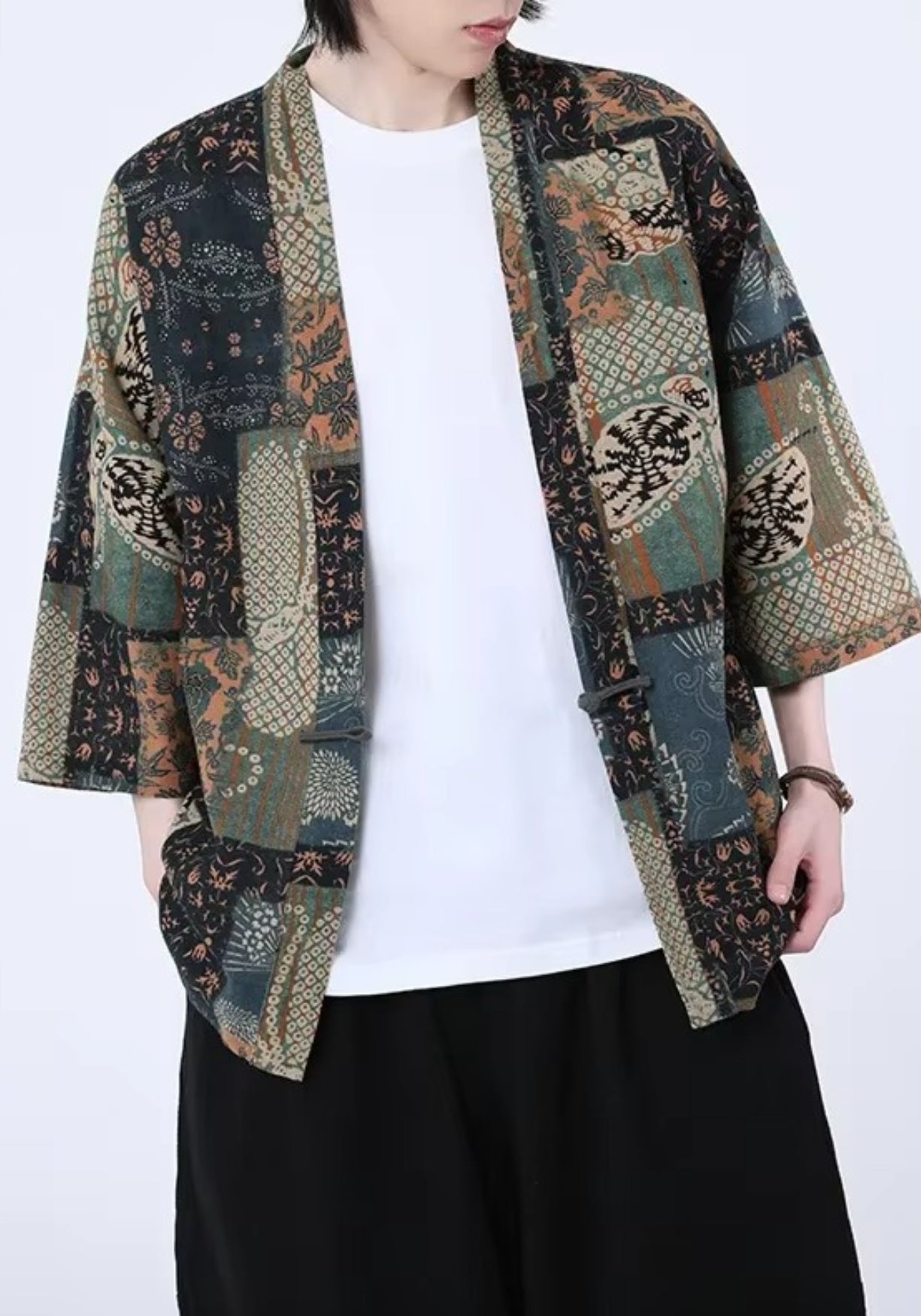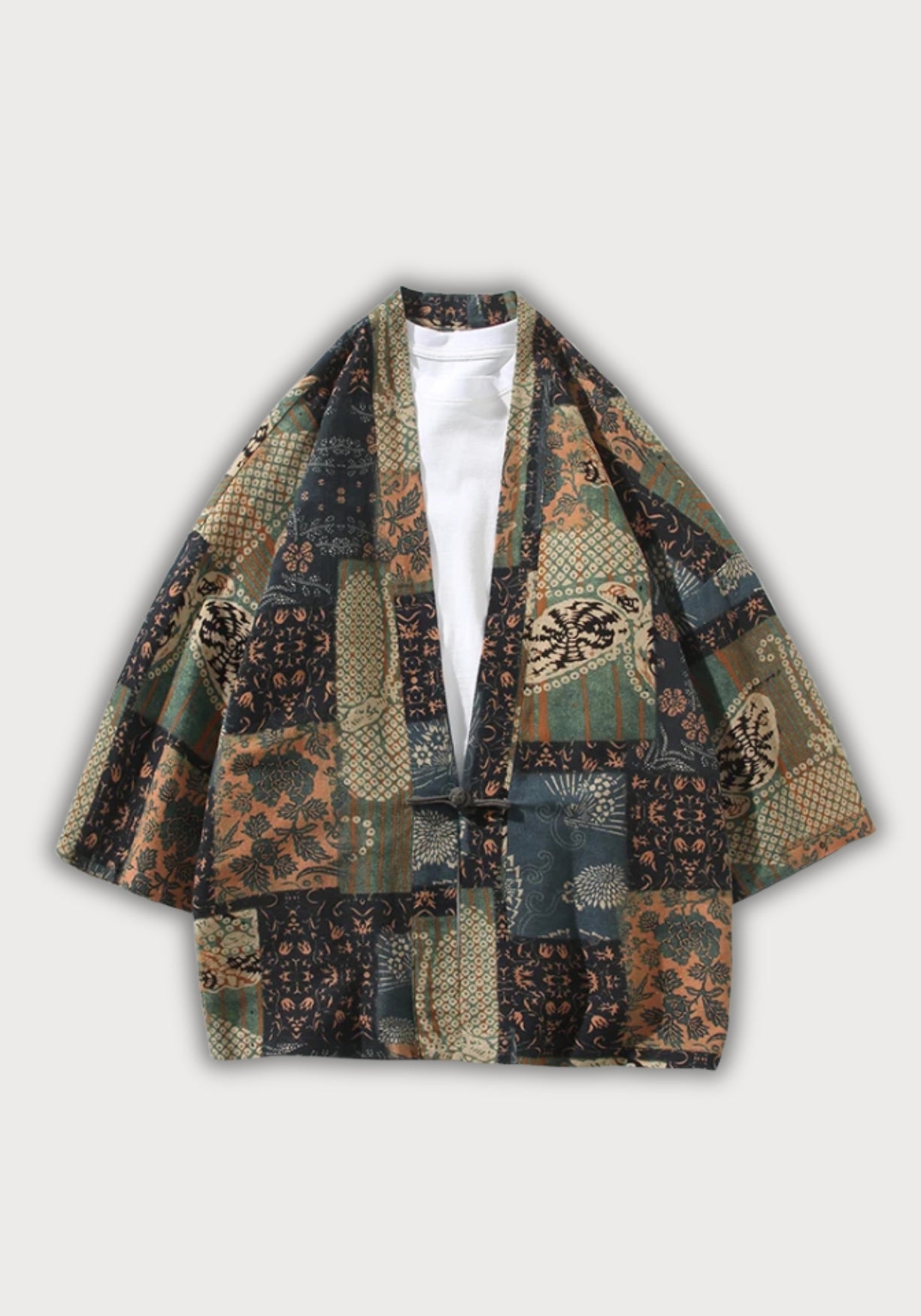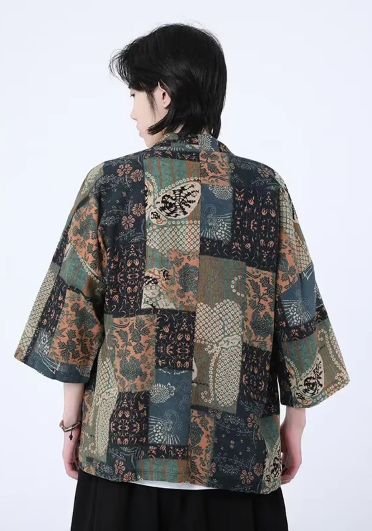 Kimono patchwork vert canard et bleu pétrole unisexe Cette veste kimono revisite le style traditionnel japonais avec un patchwork raffiné mêlant motifs floraux, géométriques et inspirations folkloriques. Ses teintes profondes – vert canard, beige sab