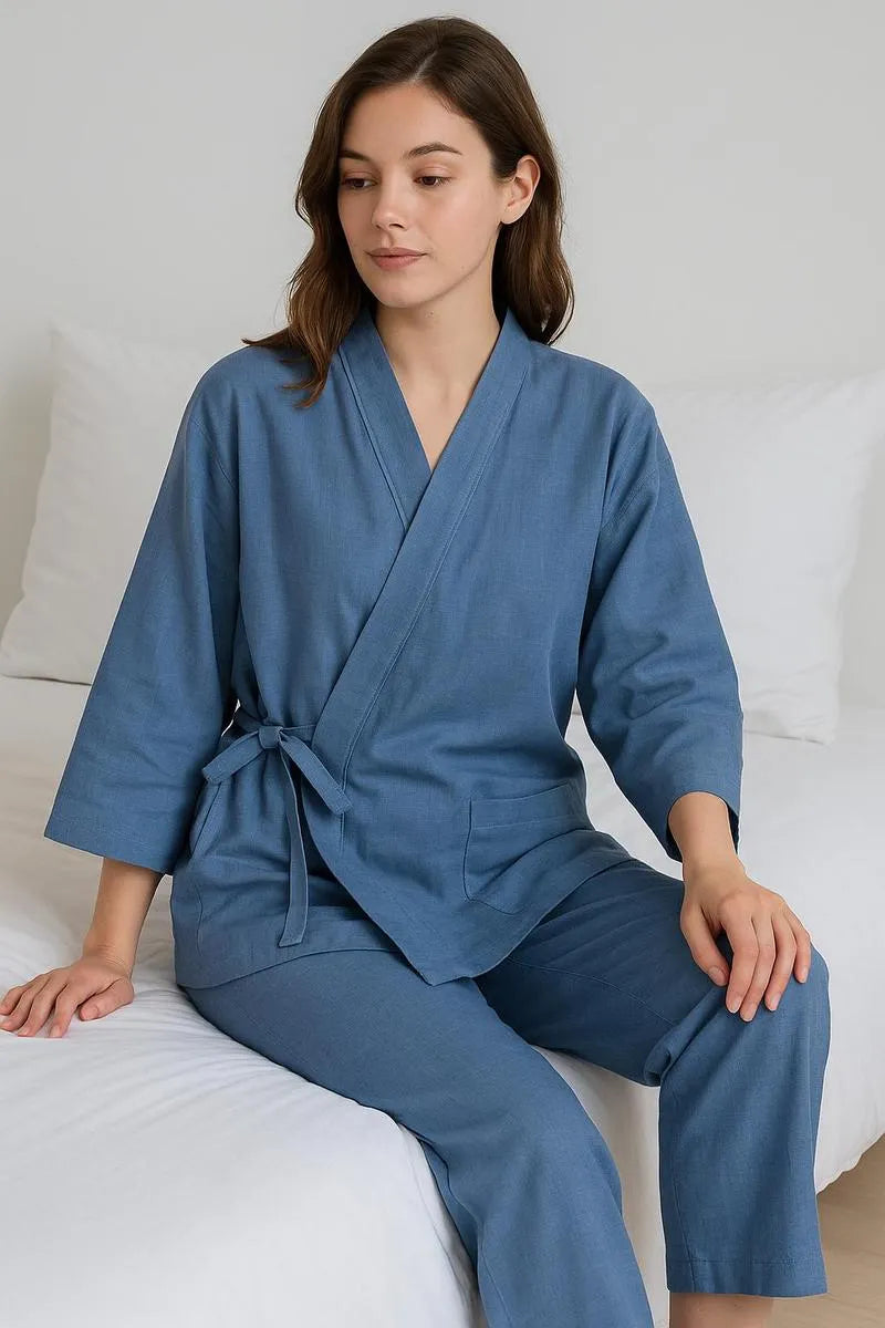 Pyjama bleu pour femme à coupe kimono élégante Ce kimono pyjama bleu femme incarne l’essence même du confort japonais allié à une élégance intemporelle. Confectionné dans un lin premium respirant , cet ensemble de nuit transforme chaque instant de dé