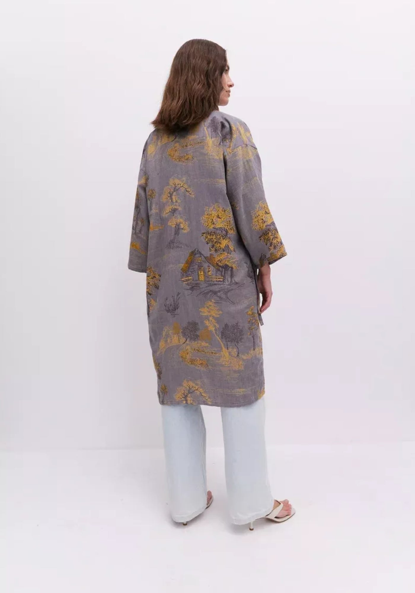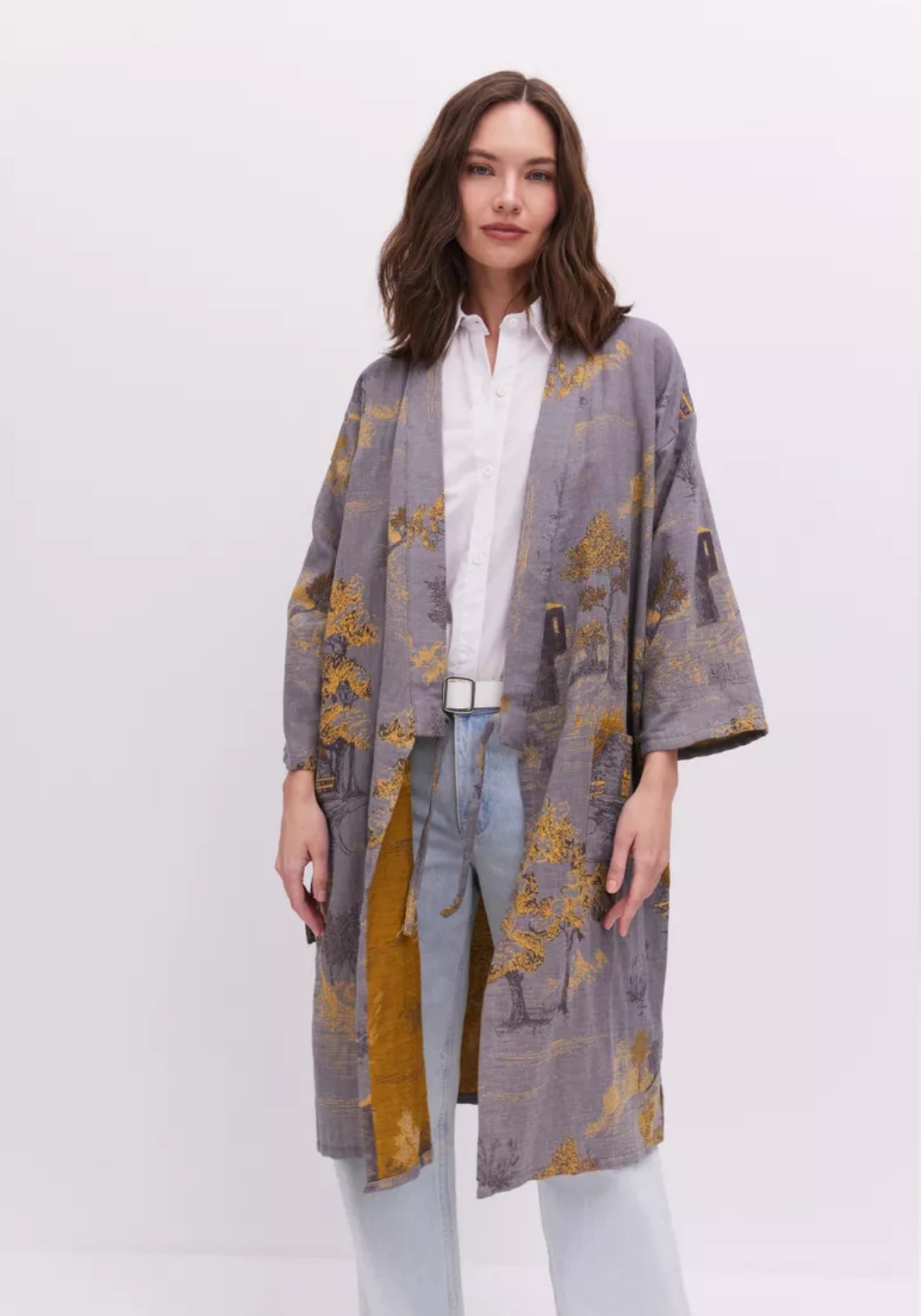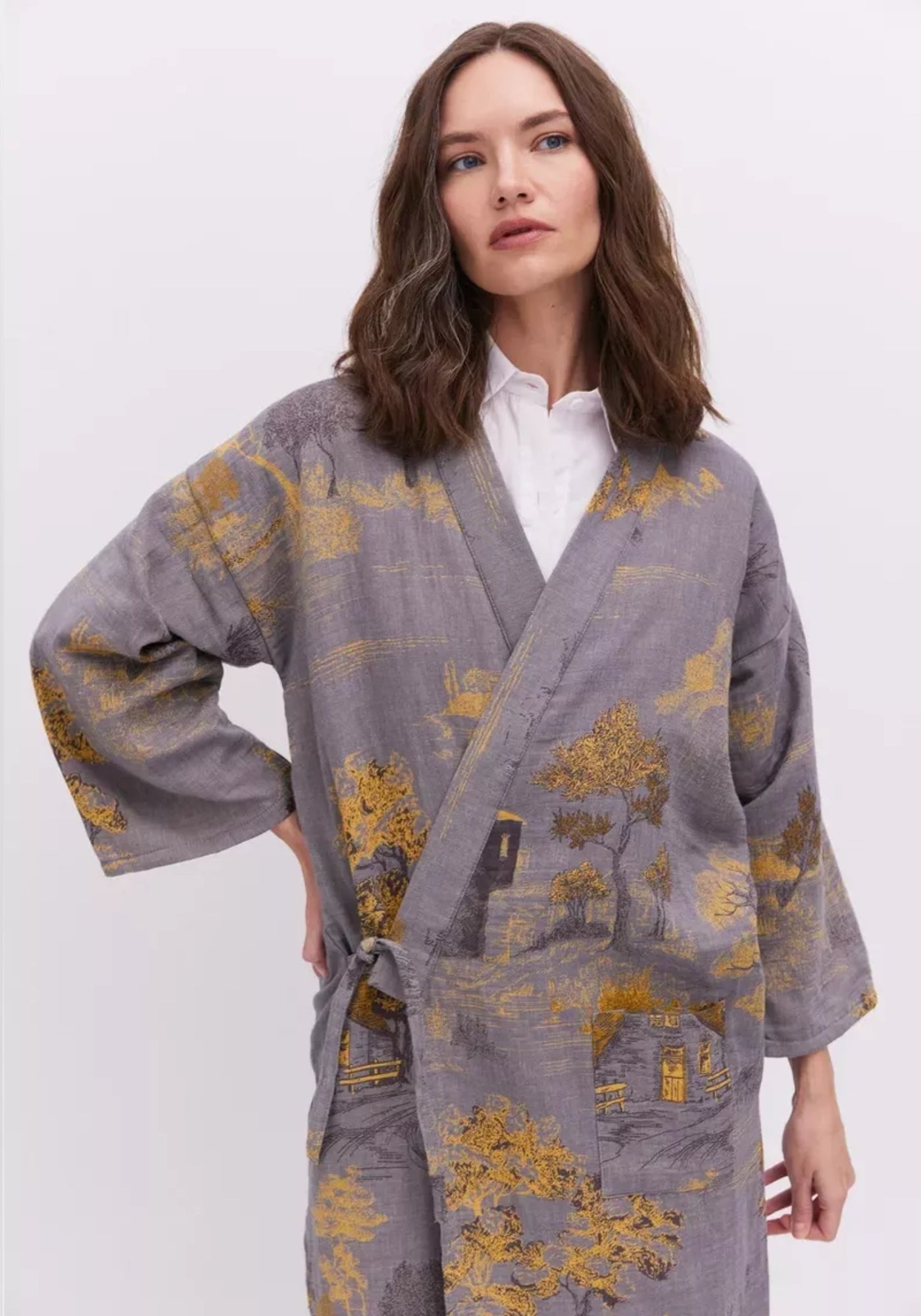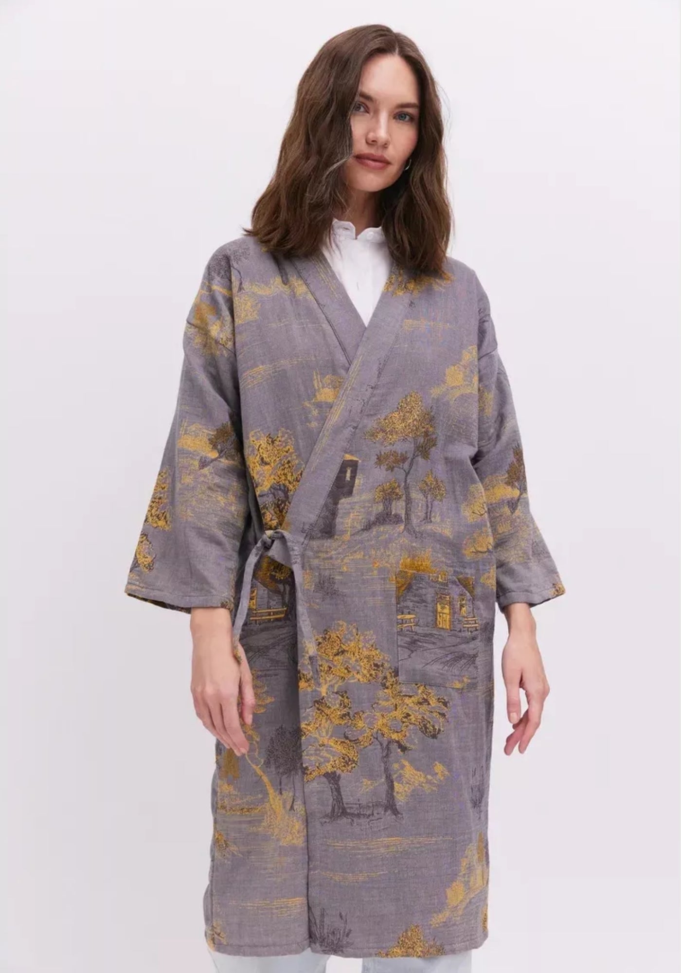 Peignoir kimono gris en coton Ce peignoir kimono gris pour femme se distingue par son charme intemporel et sa texture naturelle. Confectionné à 100 % en coton , il allie légèreté et confort, tout en laissant respirer la peau. Sa couleur gris clair, subtilement nuancée, révèle des reflets différents selon la lumière, apportant une touche changeante et apaisante. Les motifs dorés tissés représentant des paysages et des arbres apportent une dimension poétique et artisanale à la pièce. Chaque détail, du nouage latéral aux manches larges, est pensé pour offrir une silhouette fluide et élégante. Facile à enfiler, il s’adapte à vos moments de détente tout en conservant un style raffiné. Ce kimono long se porte aussi bien à la maison comme peignoir d’intérieur qu’en veste légère pour un look décontracté et chic. Sa coupe droite et ample offre une liberté de mouvement agréable, idéale pour les instants de calme ou les matinées tranquilles. Un kimono d’intérieur poétique, où confort et élégance se rencontrent. Composition : 100% coton.