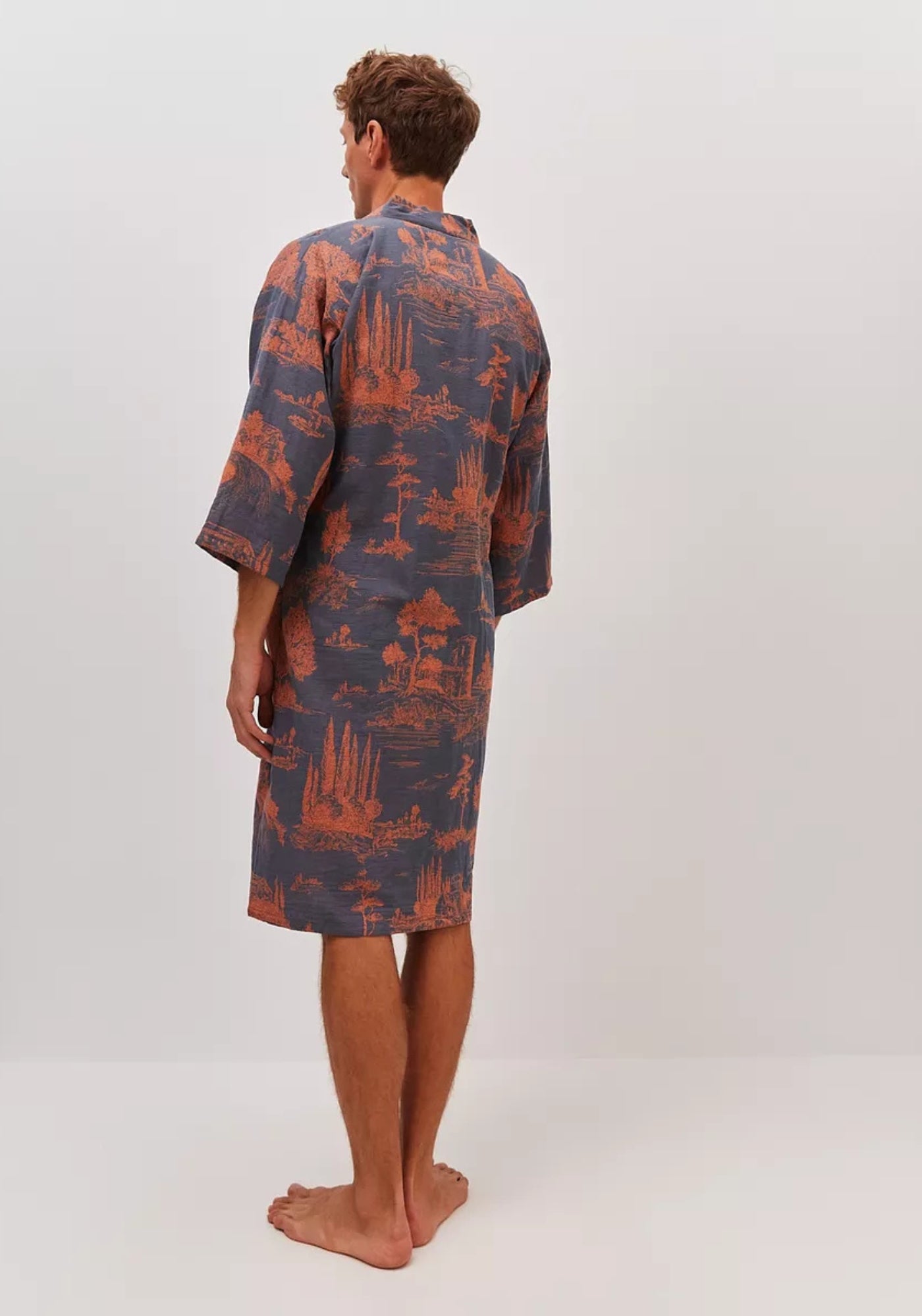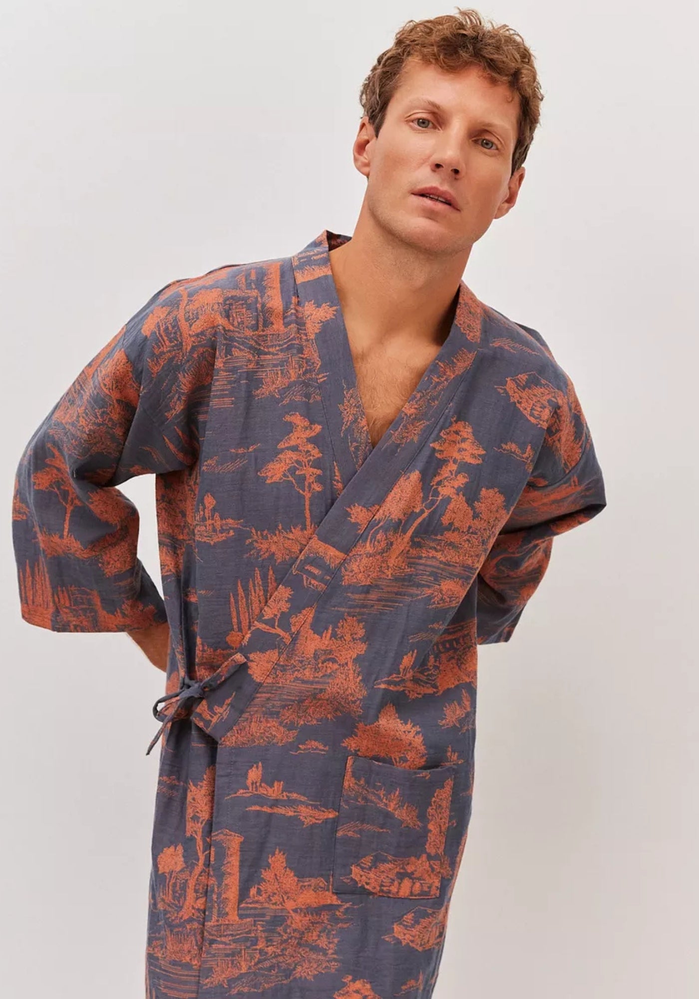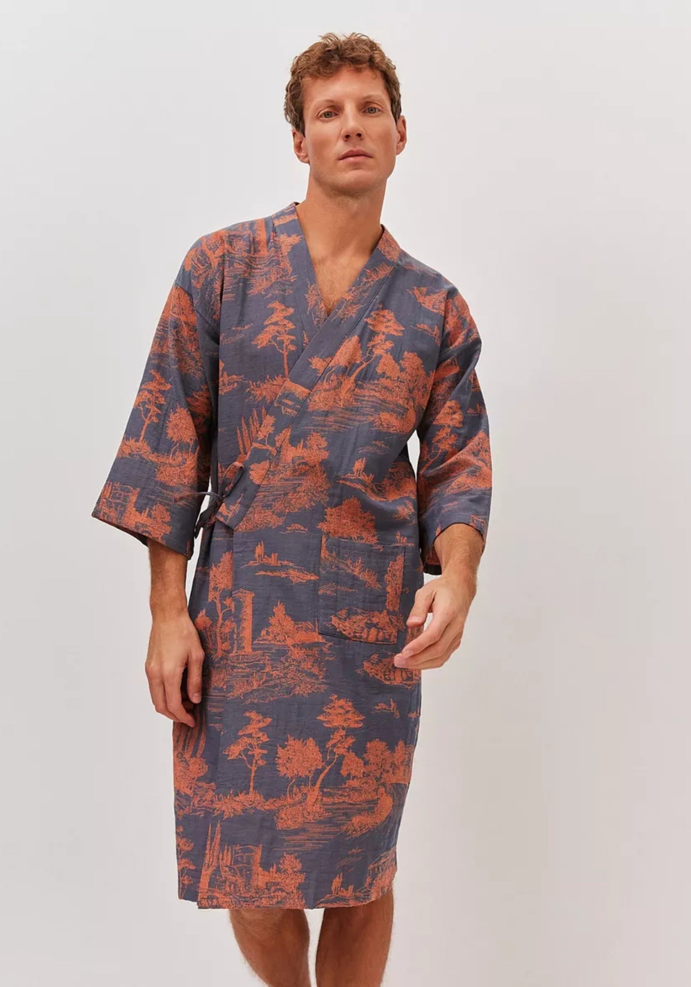 Peignoir kimono homme bleu à motifs orangés Ce peignoir kimono homme allie confort, élégance et esprit japonais. Confectionné en 100 % coton respirant , il est léger, agréable sur la peau et idéal pour les moments de détente à la maison. Son tissu doux assure un tombé naturel tout en laissant une liberté de mouvement optimale. Son fond bleu aux nuances ardoise est mis en valeur par des motifs orangés inspirés de paysages japonais, créant un contraste subtil et sophistiqué. Sa coupe droite, ses manches amples et sa ceinture latérale s’inspirent du peignoir kimono japonais traditionnel , tout en restant facile à porter au quotidien. Polyvalent, ce peignoir kimono bleu pour homme se porte aussi bien comme peignoir de bain kimono après la douche que comme veste d’intérieur élégante. Léger, respirant et naturellement raffiné, il apporte une touche zen et moderne à vos moments de détente. Un peignoir kimono homme alliant style japonais, confort et simplicité. Composition : 100 % coton.