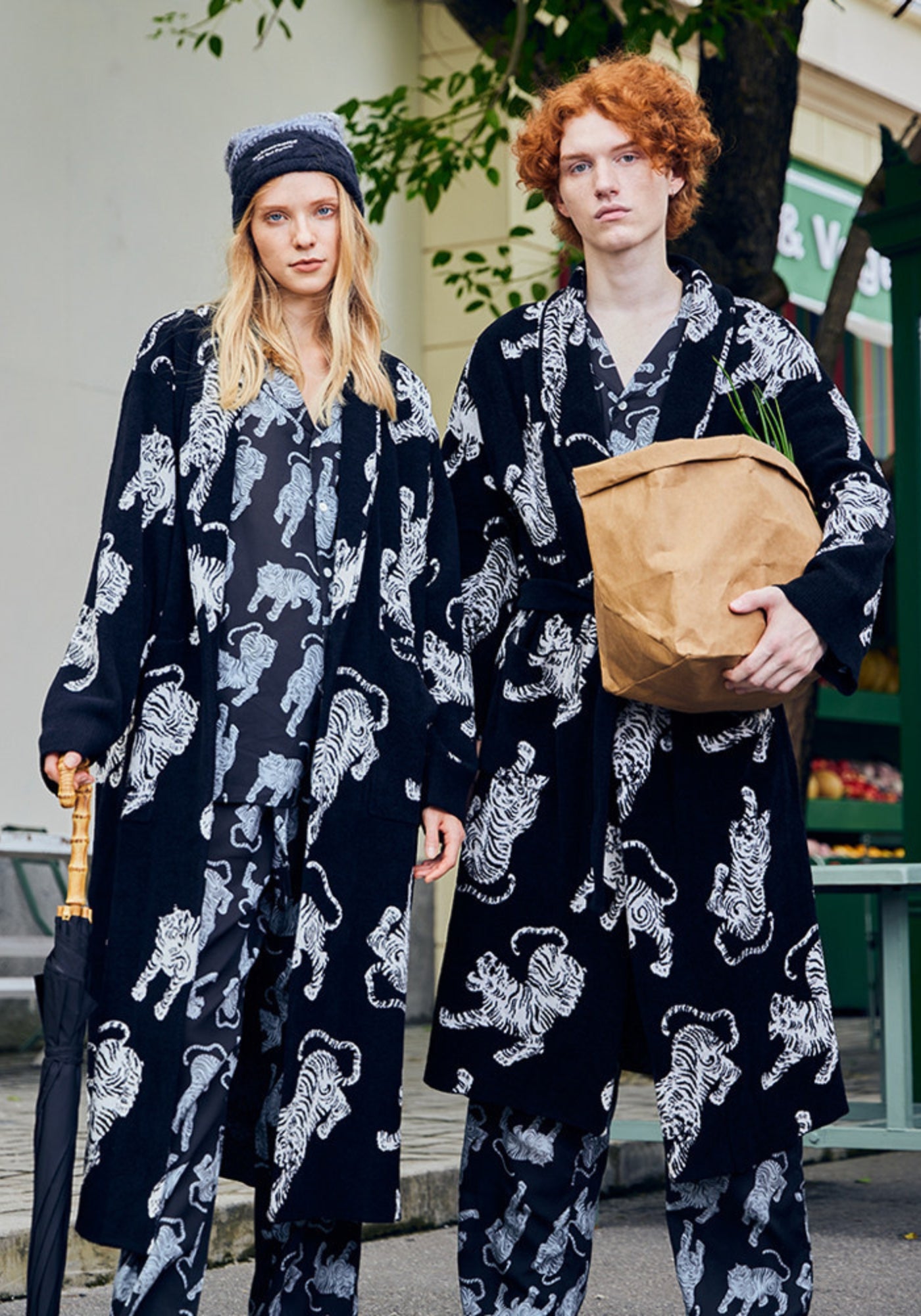 Peignoir kimono noir à motif tigre – unisexe Ce peignoir kimono noir revisite l’esprit du vêtement d’intérieur japonais dans une version moderne, chaude et ultra confortable. Pensé comme une pièce hybride entre peignoir kimono unisexe et pyjama kimon