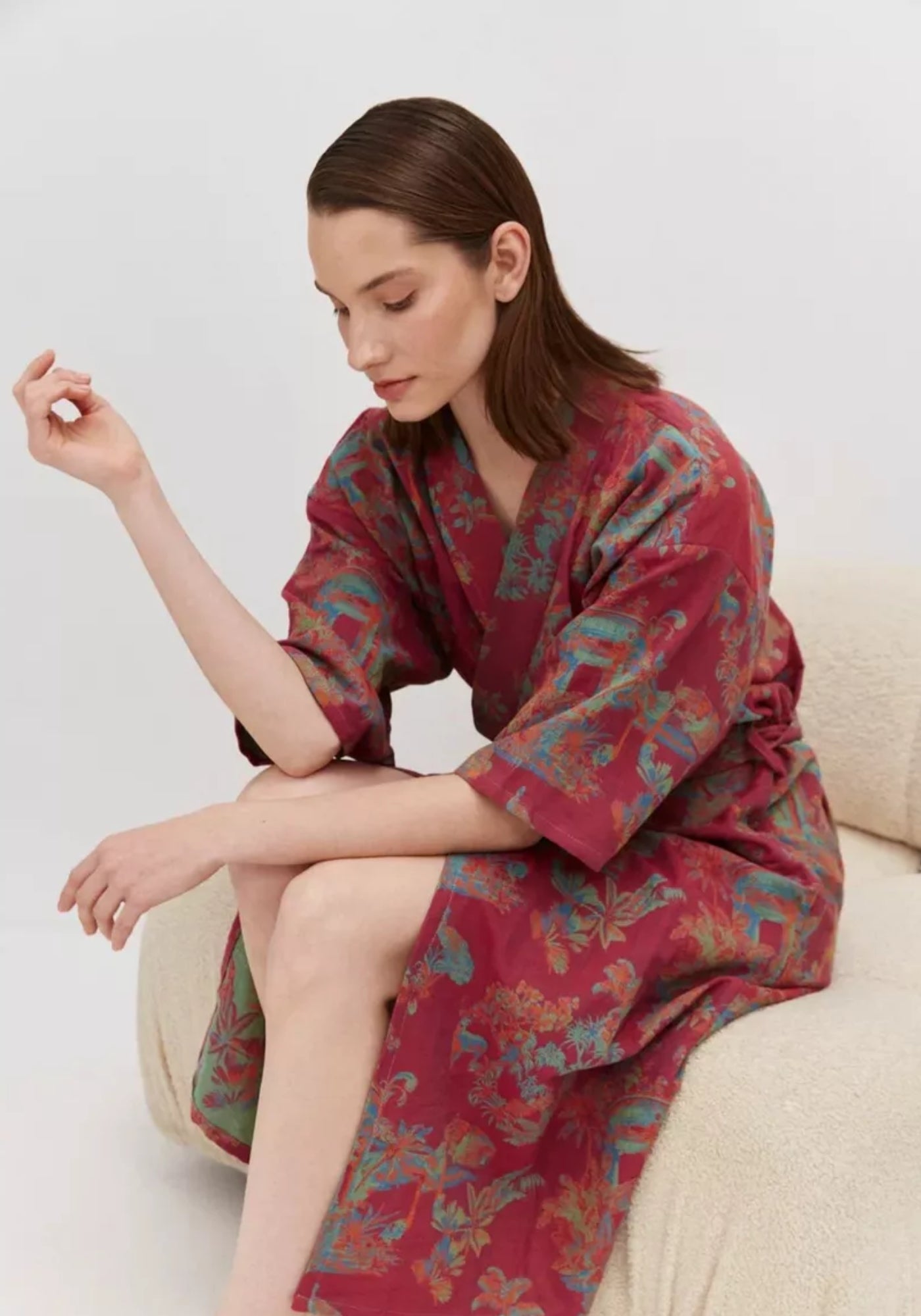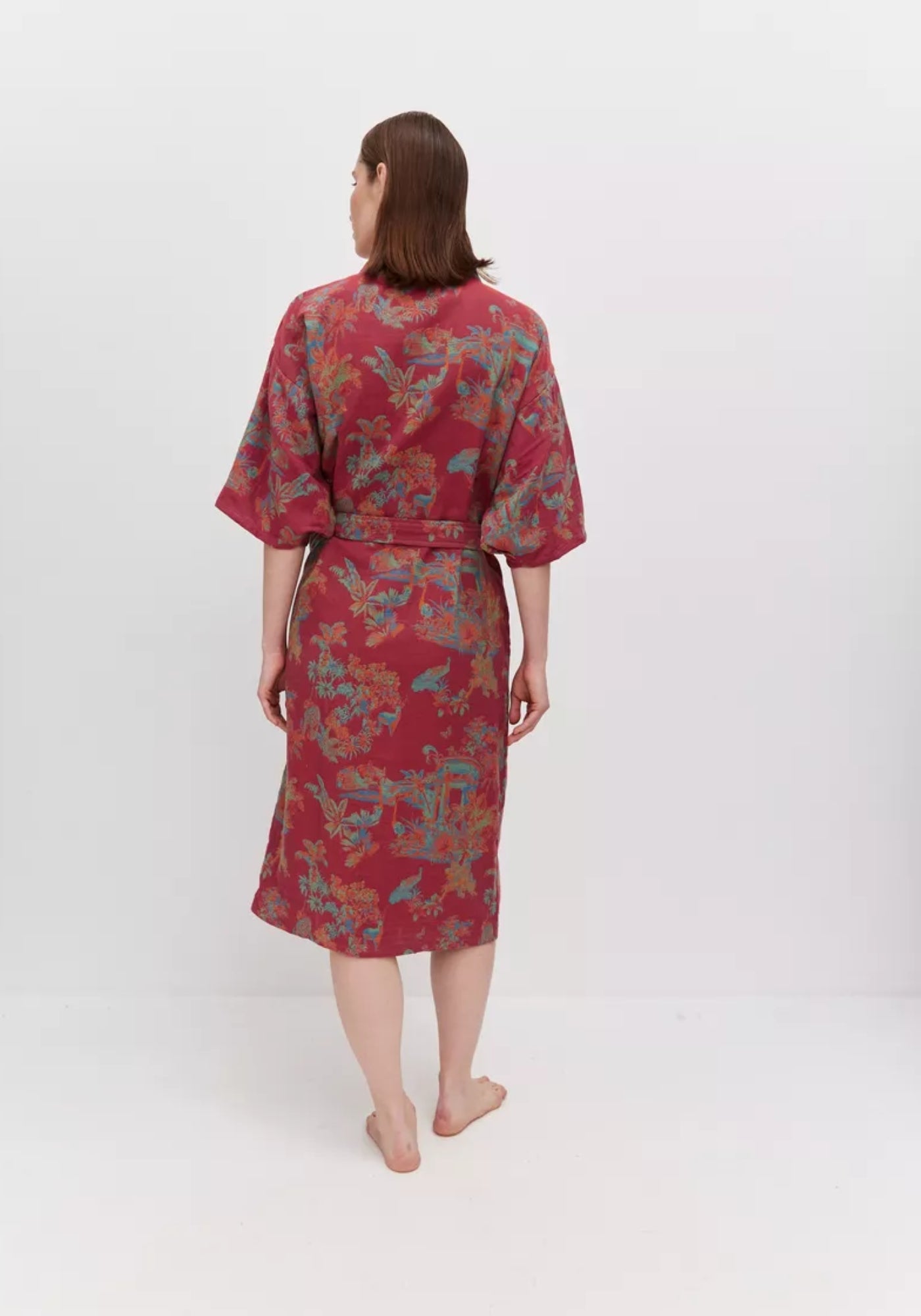 Peignoir kimono rouge pour femme Ce peignoir kimono rouge pour femme allie élégance et confort dans une coupe fluide inspirée du Japon traditionnel. Confectionné en 100 % coton léger , il offre un tombé souple et agréable sur la peau, idéal pour se détendre ou pour apporter une touche chic à vos moments du quotidien. Son tissu rouge framboise est rehaussé de motifs floraux dans des nuances bleues et dorées, représentant des paysages naturels empreints de douceur. Cette harmonie de couleurs crée un équilibre parfait entre chaleur et sérénité. La ceinture assortie permet de marquer la taille selon vos envies, tandis que les manches larges et la coupe droite garantissent une liberté de mouvement totale. Porté comme peignoir de bain élégant ou comme veste d’intérieur , ce kimono séduit par son allure intemporelle et son confort naturel. Léger et respirant, il est parfait à enfiler après un bain, au réveil ou même par-dessus une tenue d’été pour un style détendu et poétique. Un kimono rouge plein de charme, pour conjuguer élégance et bien-être au quotidien. Composition : 100% coton.