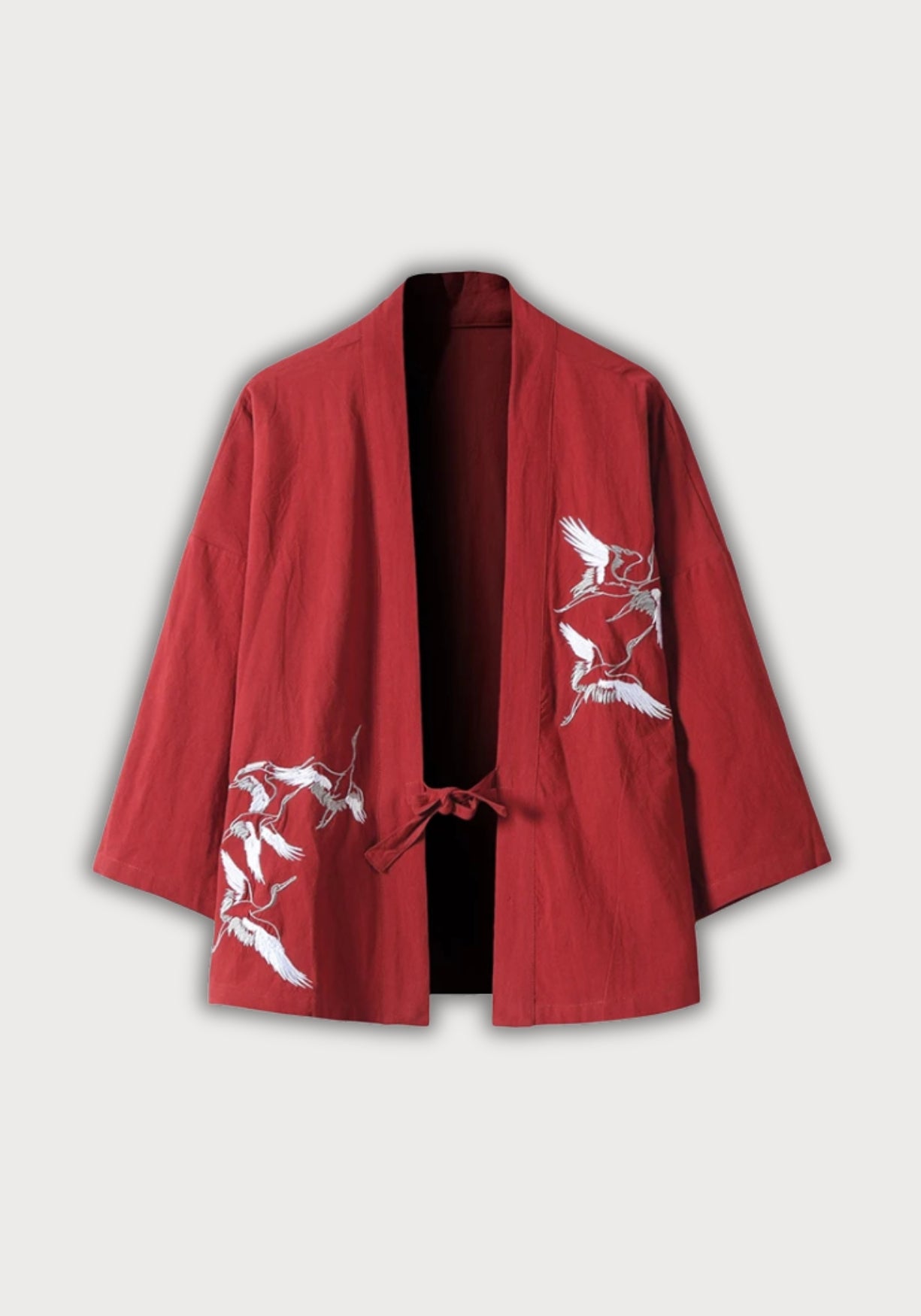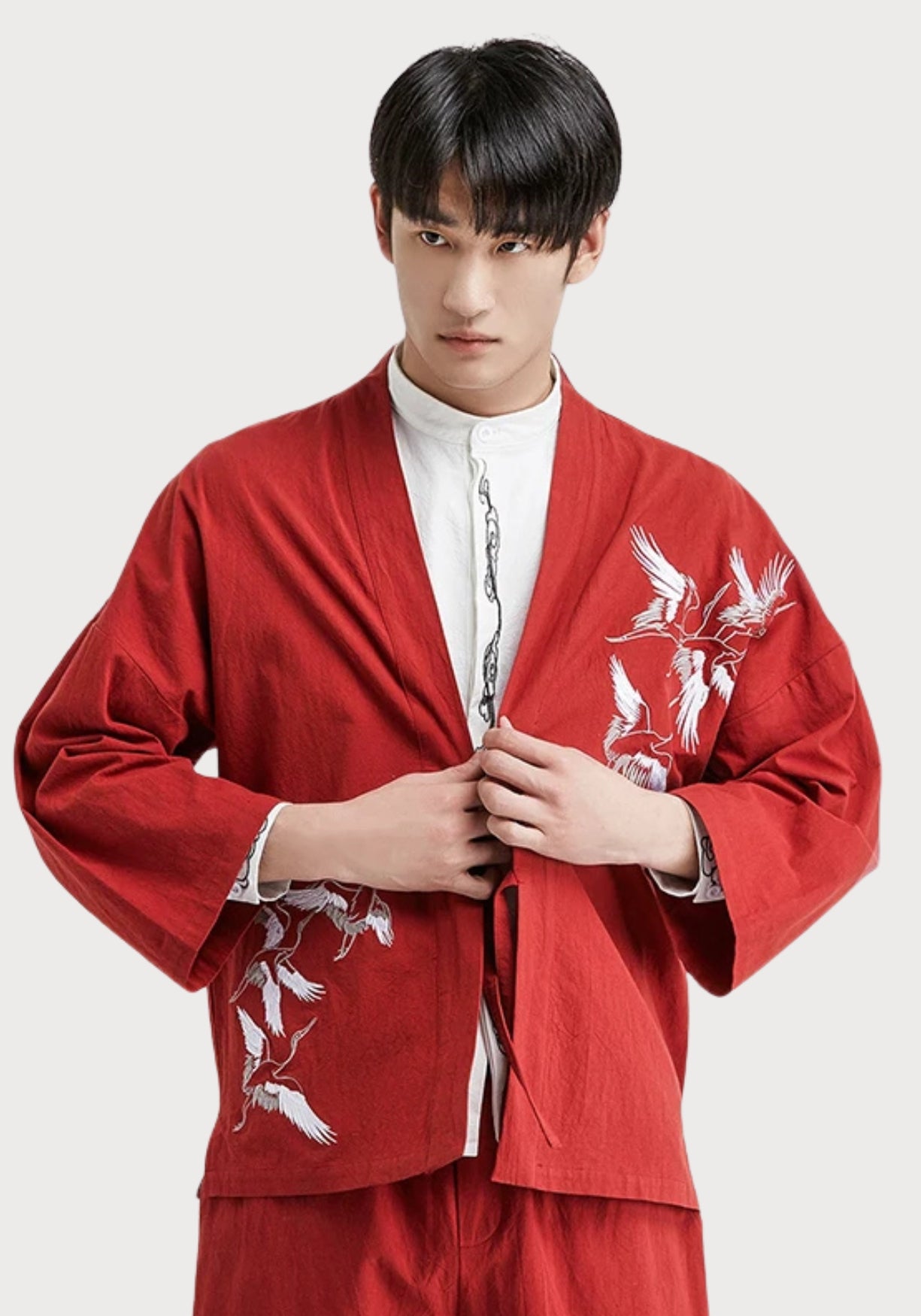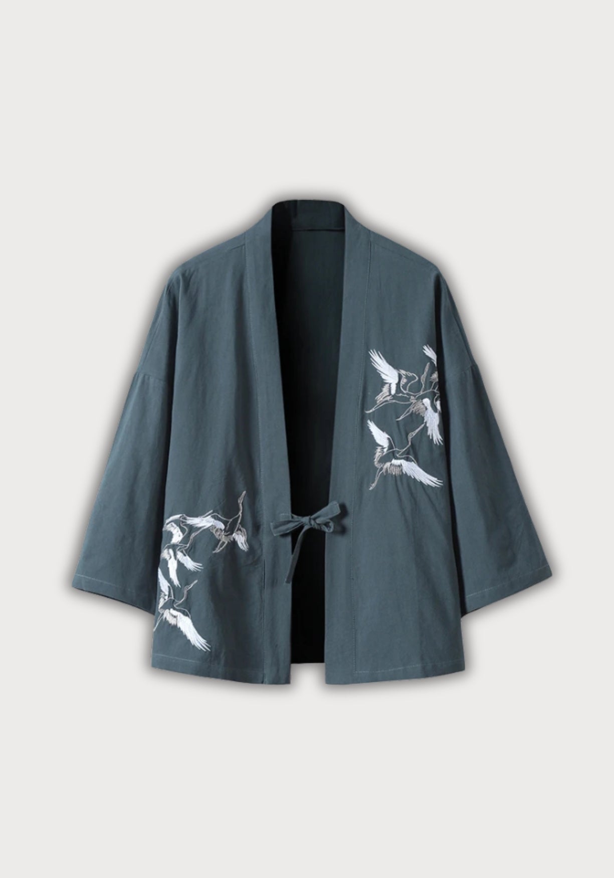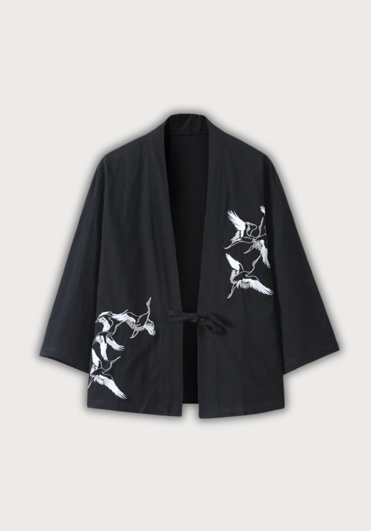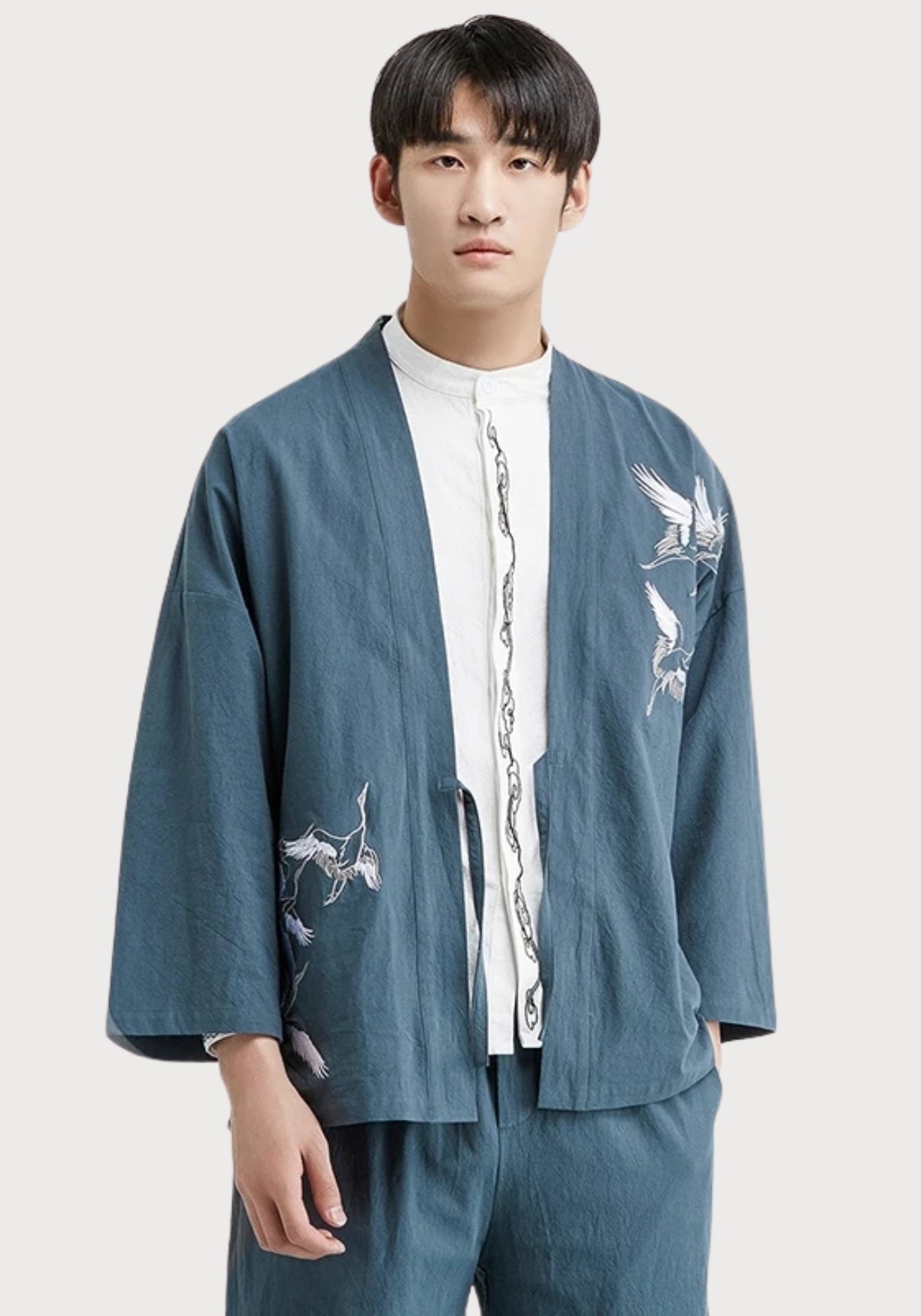 Veste kimono brodée pour homme Inspirée des vêtements traditionnels asiatiques , cette veste kimono brodée marie avec justesse élégance artisanale et confort moderne. Entièrement confectionnée en coton doux et respirant , elle présente une matière légère, agréable sur la peau, parfaite pour la mi-saison comme pour les journées détendues. Le design met en valeur une coupe ample et droite , pensée pour offrir une liberté de mouvement naturelle. Son col officier apporte une touche minimaliste et structurée, tandis que les manches trois-quarts rappellent les tenues traditionnelles japonaises et chinoises. La fermeture par lien à nouer prolonge cet esprit, en évitant tout superflu : vous l’ajustez à votre convenance, selon votre style ou la couche portée dessous. Les grues brodées avec finesse sur l’épaule et le bas du vêtement insufflent une poésie visuelle forte. Symbole ancestral de longévité, de paix et d’équilibre, elles offrent à cette pièce un message subtil, à la fois décoratif et porteur de sens. Portée sur un haut uni, cette veste devient immédiatement une pièce maîtresse : sobre, mais expressive. Une veste brodée qui mêle tradition asiatique et style contemporain pensé pour sublimer les silhouettes. Composition : 100% coton