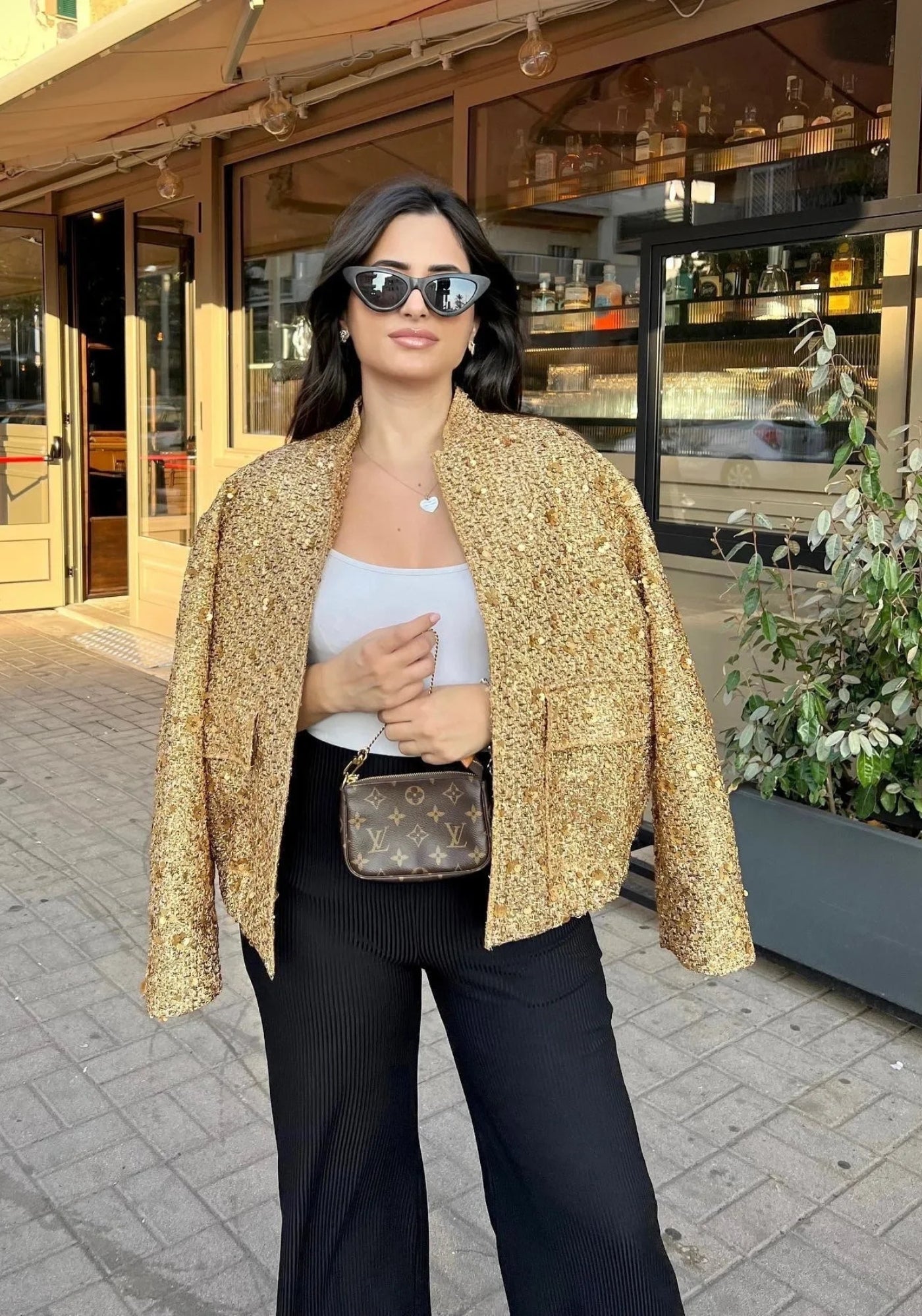 Veste kimono dorée à paillettes pour femme Cette veste kimono dorée attire tous les regards par son éclat subtil et son charme intemporel. Confectionnée dans un tissu souple recouvert de paillettes dorées finement cousues , elle joue avec la lumière à chaque pas, offrant un effet lumineux sans être tape-à-l’œil. Sa coupe droite, légèrement ample, évoque la fluidité d’un kimono traditionnel tout en gardant une allure contemporaine et élégante. Doublée pour plus de confort, elle se porte aisément sur une robe de soirée, une combinaison noire ou un jean taille haute pour un contraste chic et moderne. Les épaules légèrement structurées et les manches longues ajoutent une touche d’assurance, tandis que la texture scintillante sublime la silhouette sans effort. Que ce soit pour un dîner, une fête ou une occasion spéciale, cette veste illumine chaque tenue d’une lueur dorée raffinée. Chaque détail reflète une élégance naturelle : une brillance maîtrisée, un tombé fluide et une coupe étudiée pour flatter le mouvement. Une pièce qui allie sophistication et audace, parfaite pour celles qui aiment briller avec goût. Un kimono de soirée lumineux, entre modernité, élégance et confiance en soi. Composition : 100% polyester.