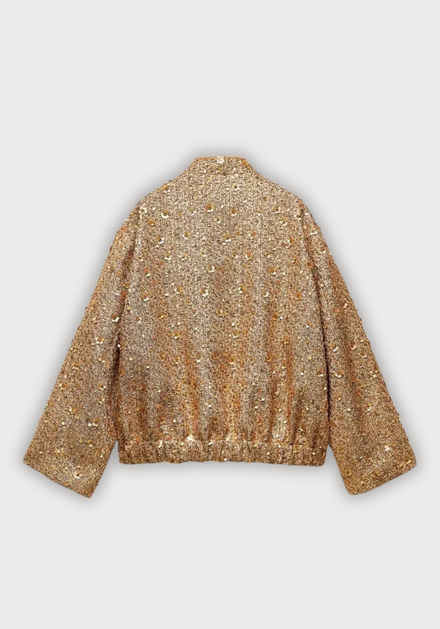 Veste kimono dorée à paillettes pour femme Cette veste kimono dorée attire tous les regards par son éclat subtil et son charme intemporel. Confectionnée dans un tissu souple recouvert de paillettes dorées finement cousues , elle joue avec la lumière