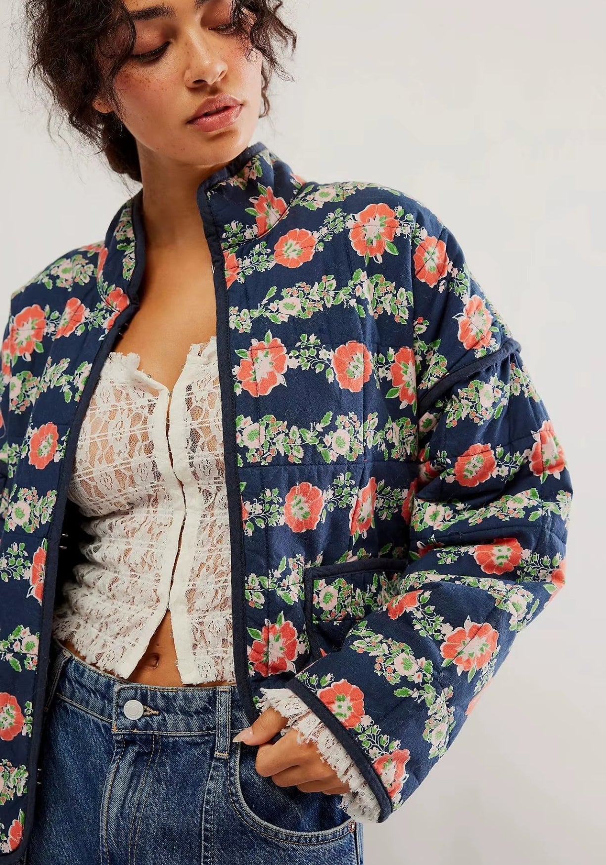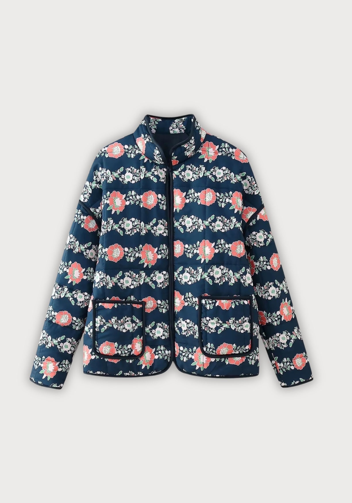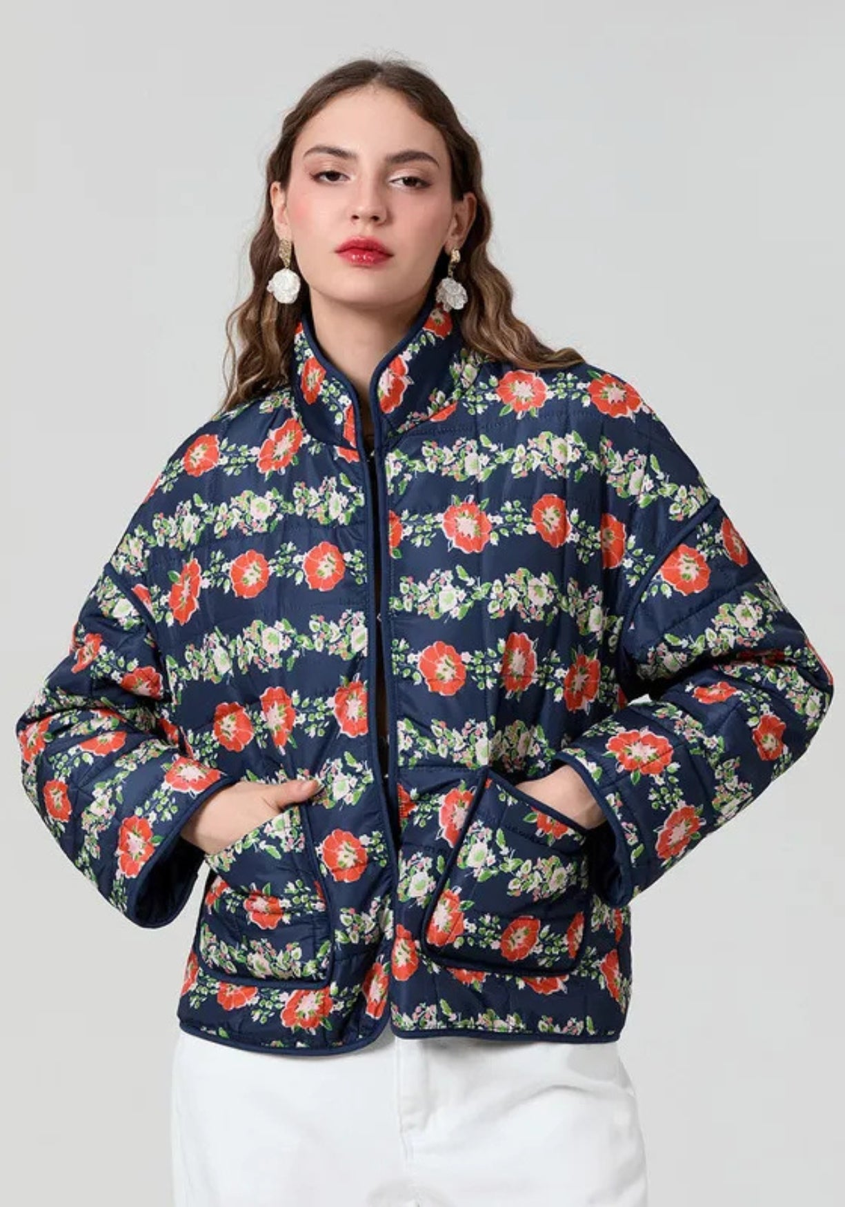 Veste kimono matelassée à fleurs rouge corail sur fond bleu marine Plongez dans l’élégance intemporelle avec cette veste kimono matelassée , où le charme des motifs floraux rencontre la sophistication d’une coupe moderne. Son fond bleu marine profond