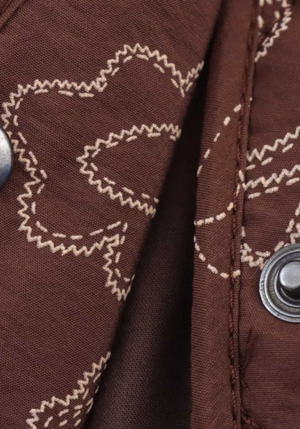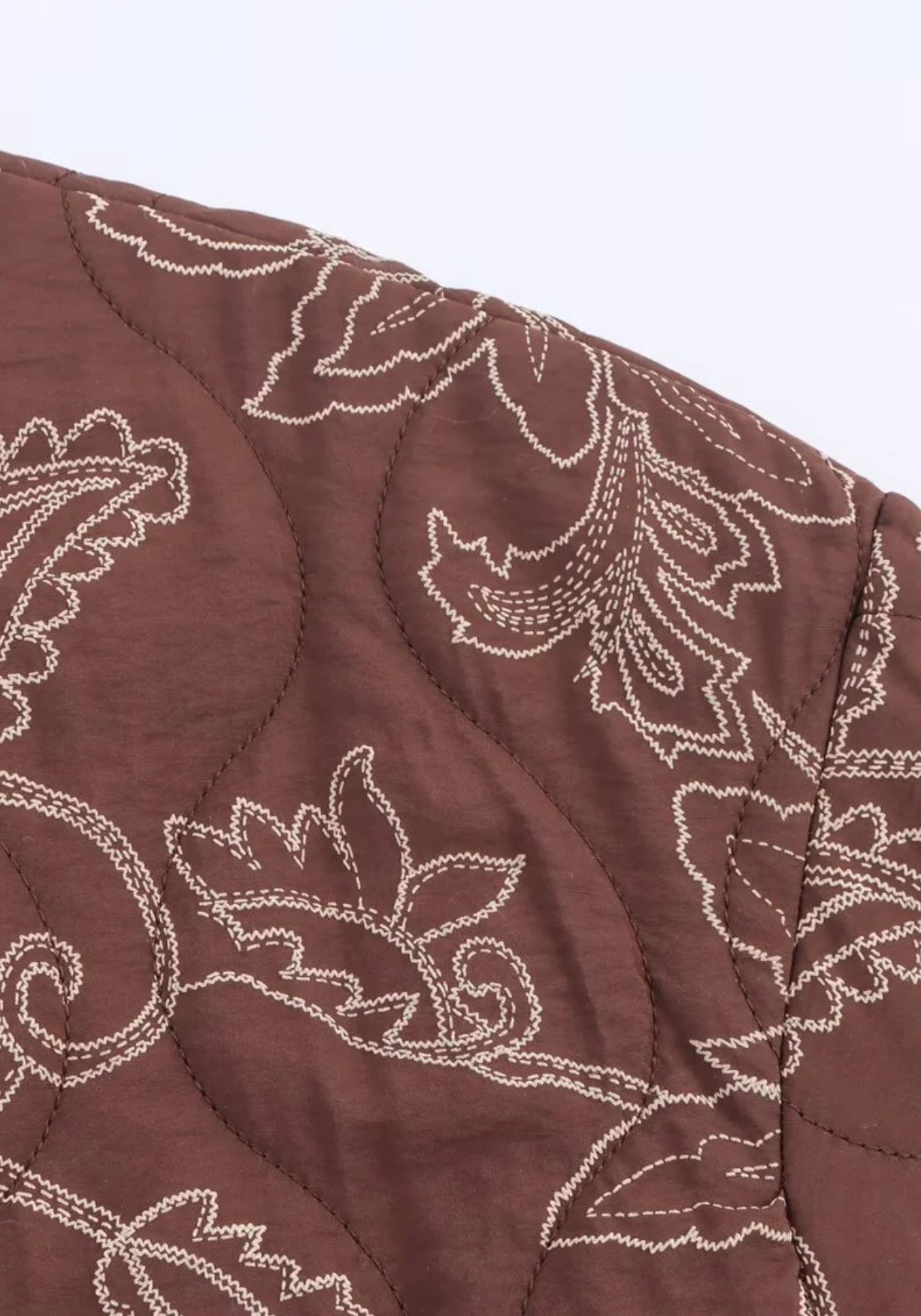 Veste kimono matelassée brodée marron Cette veste kimono matelassée marron a ce charme unique des pièces à la fois simples et pleines de caractère. Son tissu souple, légèrement rembourré, offre une chaleur douce sans être trop lourd, idéale pour acco
